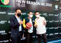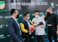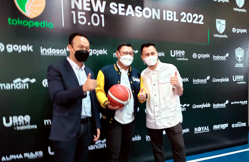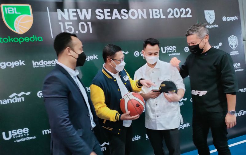 (kika) Dirut Indonesian Basketball League (IBL) Junas Miradiarsyah, Corporate Secretary Bank Mandiri Rudi As Aturridha, Pemilik klub Rans PIK Basketball Raffi Ahmad dan Presiden klub West Bandits Combiphar Solo Gading Marten sedang berbincang di sela konferensi pers pelaksanaan New Season IBL 2022, di Jakarta, Kamis (6/1). Mengusung misi pengembangan bolabasket sebagai cabang olahraga prestasi, Bank Mandiri tercatat sebagai salah satu pendukung utama ajang IBL 2022 yang dimulai pada 15 Januari 2022 dan diikuti oleh 16 klub profesional. Selain pada IBL, Bank Mandiri juga mendukung Timnas Bola Basket yang akan berlaga sebagai tuan rumah pada ajang FIBA Asia Cup 2022 pada Juli mendatang.