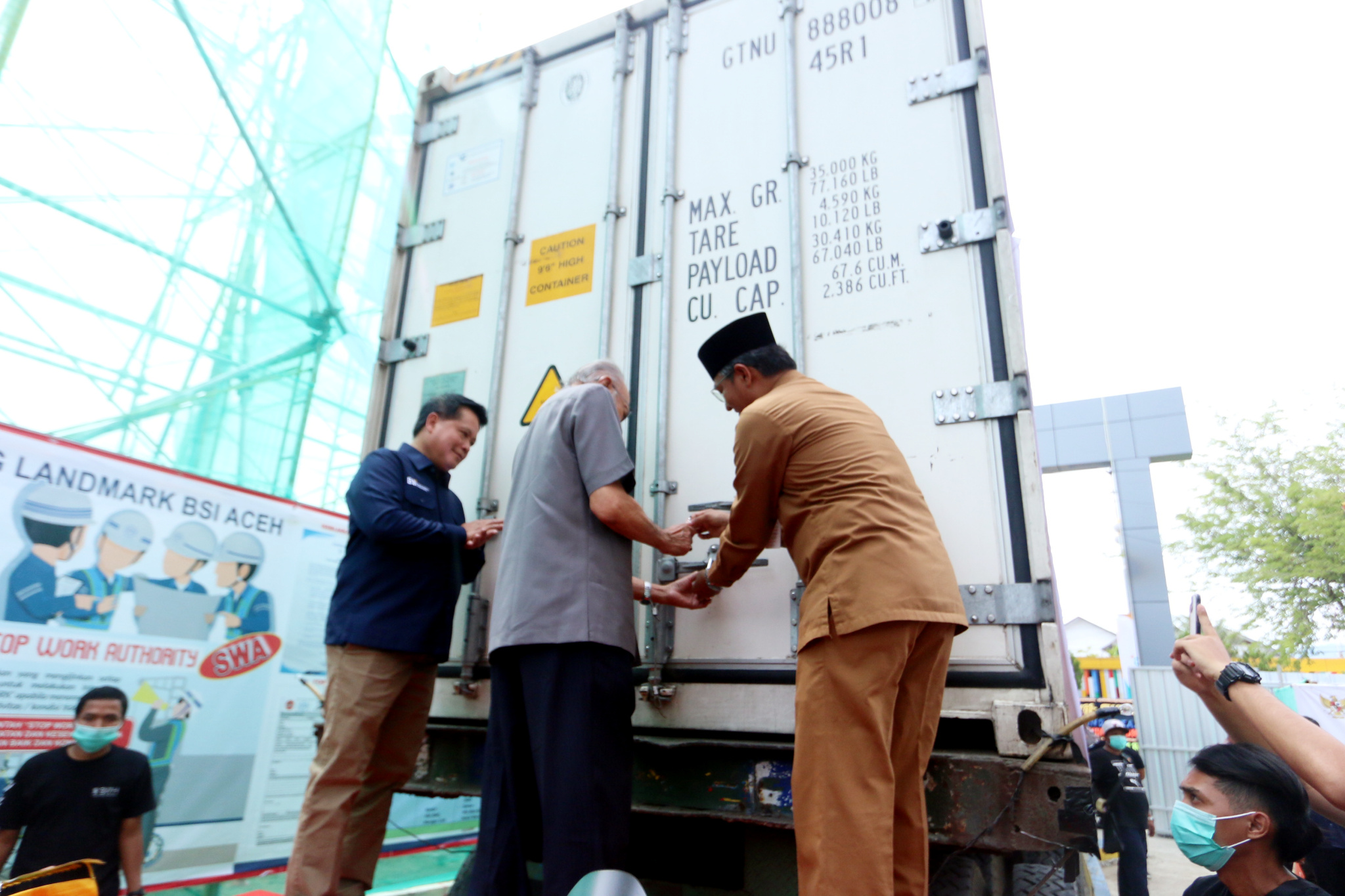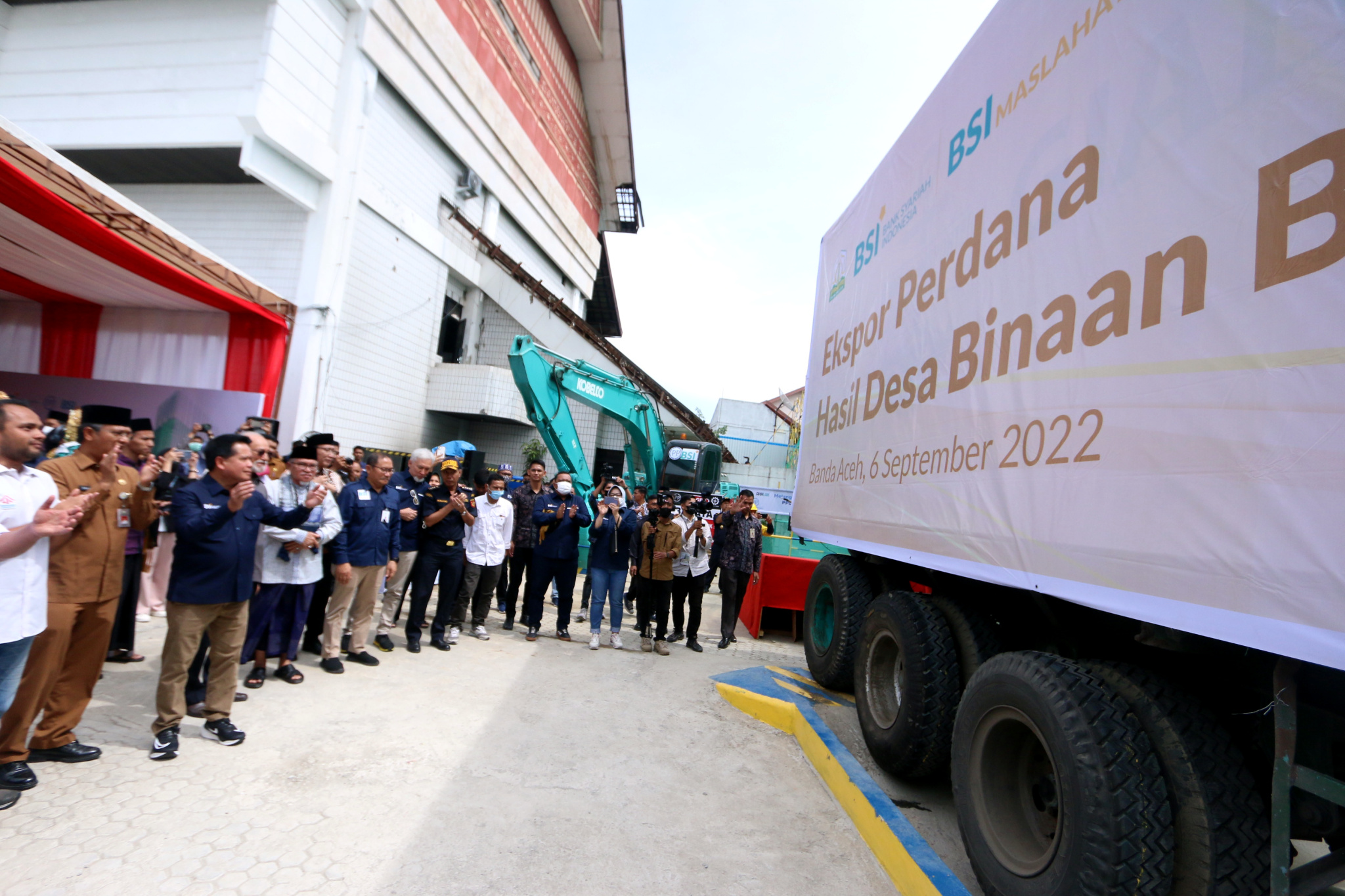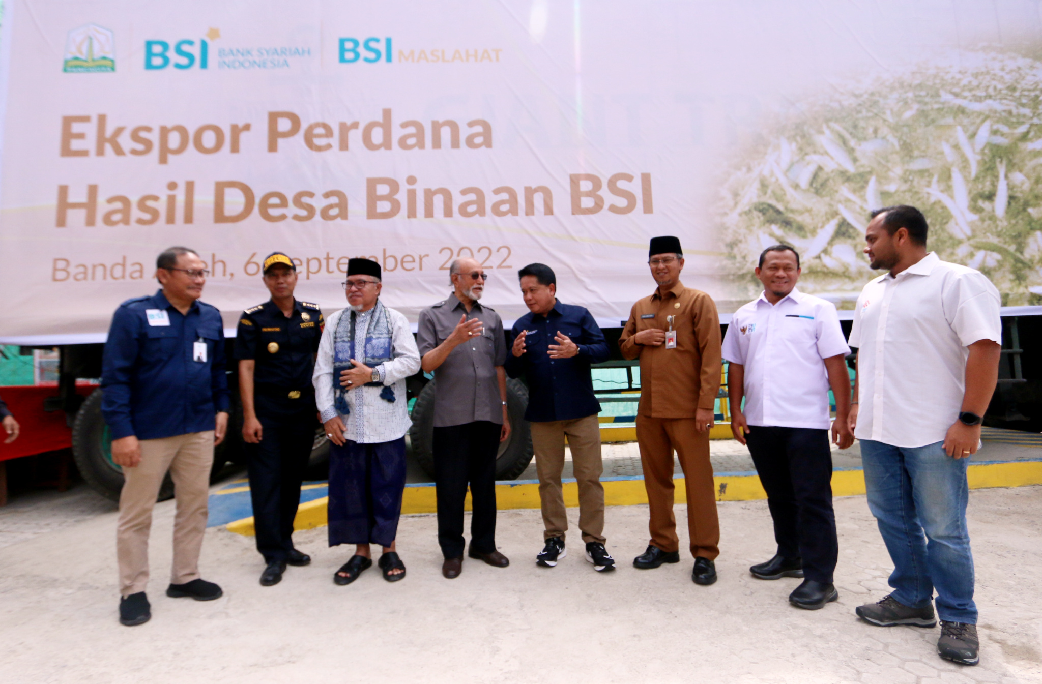 Direktur Utama BSI Hery Gunardi (kiri) bersama Asisten Administrasi Umum Pejabat Gubernur Aceh DR. H. Iskandar AP,S.Sos, Msi (tengah) dan Wali Nanggroe Aceh Tgk Malik Mahmud Al-Haytar Saat pelepasan Ekspor perdana Binaan BSI di Banda Aceh, Selasa (6/9). BSI mendorong desa-desa binaan naik kelas. Kali ini, BSI menggarap Desa Meunasah Asan Aceh Timur sebagai Desa Berdaya Sejahtera Indonesia untuk go global. Hasil tambak bandeng seluas 200 Ha di Desa Meunasah Asan mencapai 60 ton dan mampu menembus pasar ekspor ke Korea Selatan dan Jepang. Dengan adanya pendampingan program bersama BSI, ditargetkan periode produksi menjadi 3 kali setahun dari semula hanya 1 kali dalam setahun.