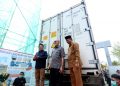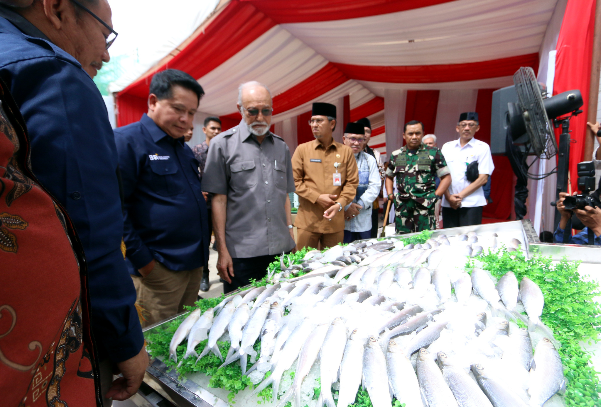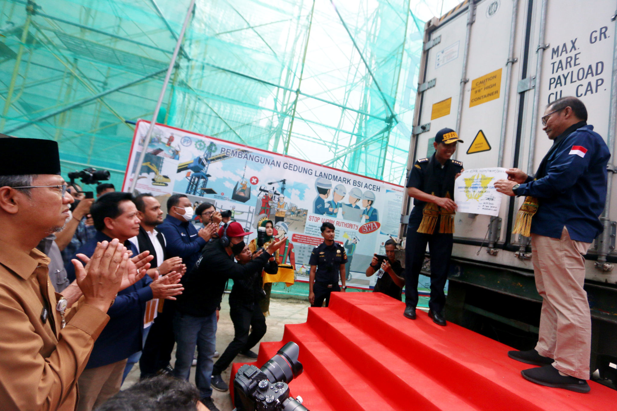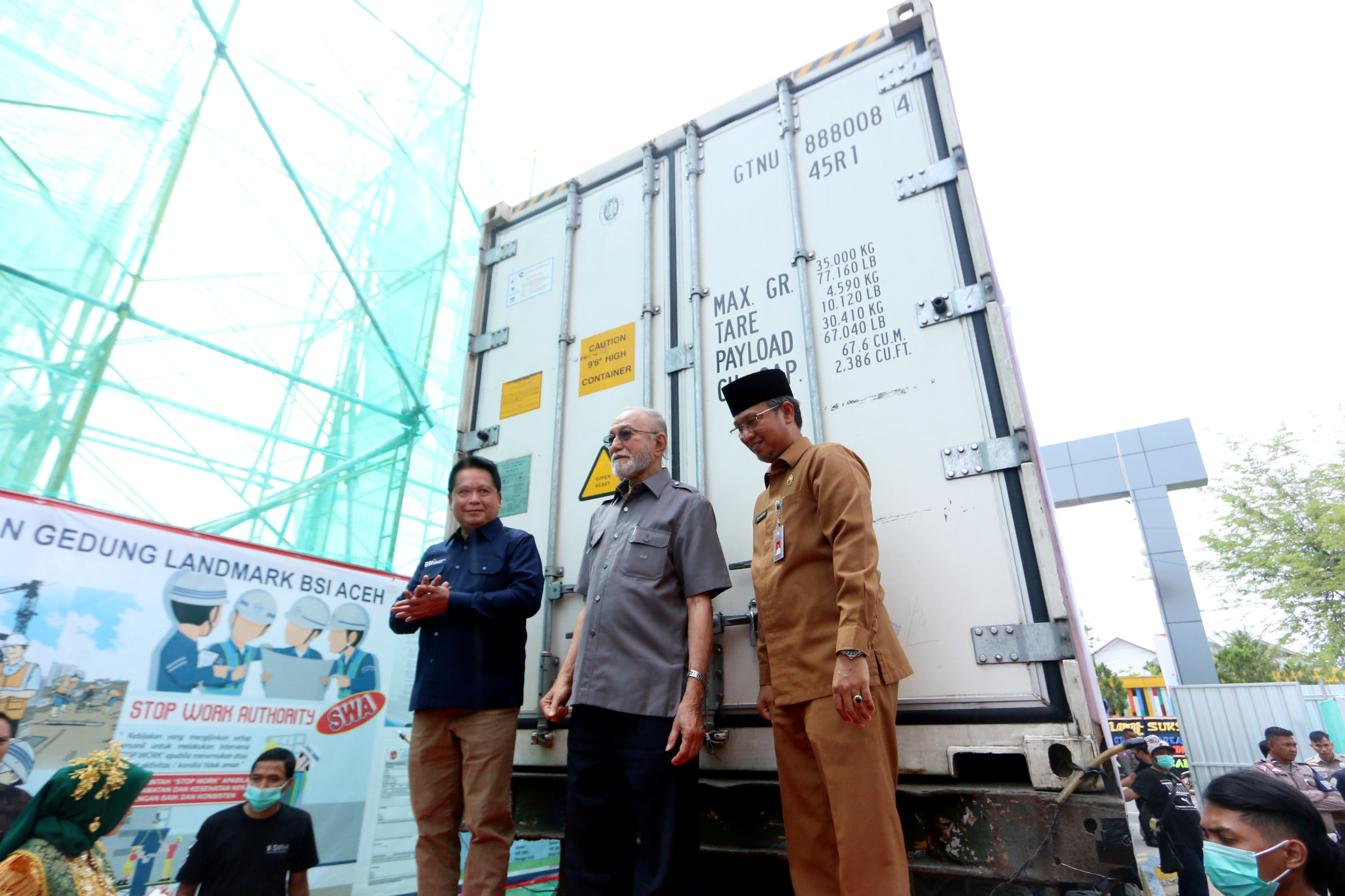 Direktur Utama BSI Hery Gunardi (kiri) bersama Asisten Administrasi Umum Pejabat Gubernur Aceh DR. H. Iskandar AP,S.Sos, Msi (tengah) dan Wali Nanggroe Aceh Tgk Malik Mahmud Al-Haytar Saat pelepasan Ekspor perdana Binaan BSI di Banda Aceh, Selasa (6/9). BSI mendorong desa-desa binaan naik kelas. Kali ini, BSI menggarap Desa Meunasah Asan Aceh Timur sebagai Desa Berdaya Sejahtera Indonesia untuk go global. Hasil tambak bandeng seluas 200 Ha di Desa Meunasah Asan mencapai 60 ton dan mampu menembus pasar ekspor ke Korea Selatan dan Jepang. Dengan adanya pendampingan program bersama BSI, ditargetkan periode produksi menjadi 3 kali setahun dari semula hanya 1 kali dalam setahun.