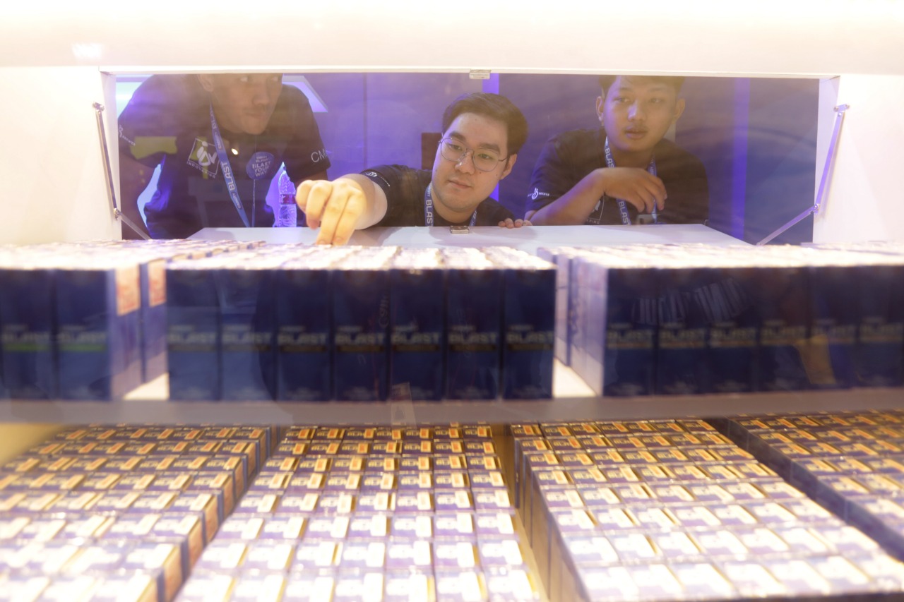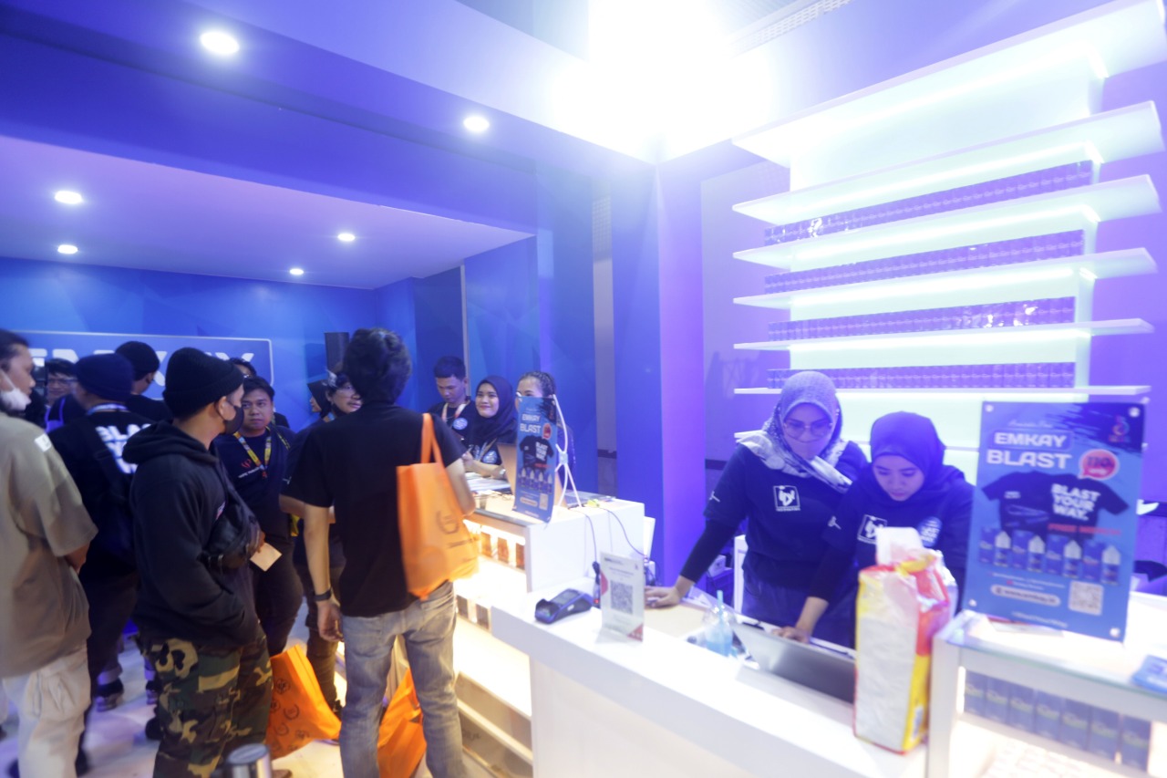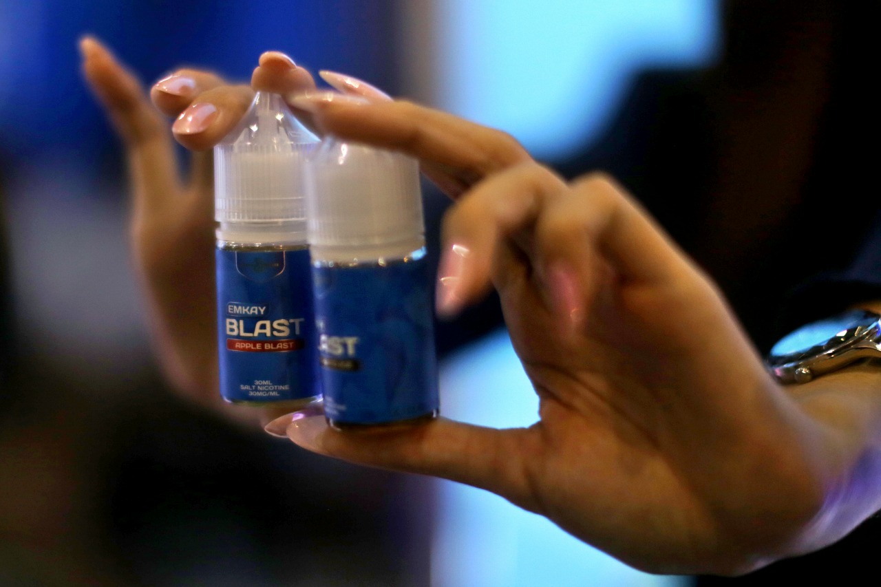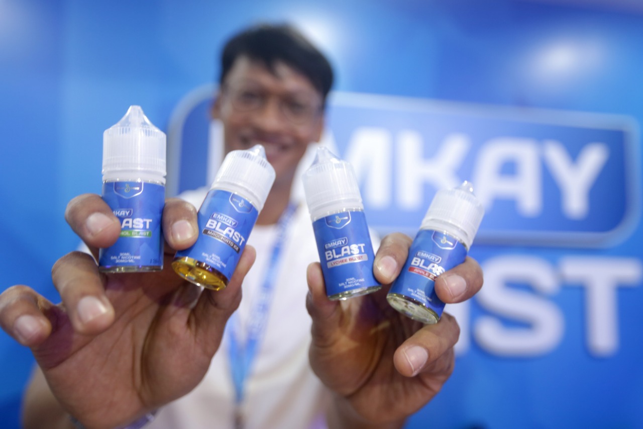 Chief Marketing Officer PT Indo Emkay Abadi (Emkay) Eko HC memperlihatkan produk terbaru Emkay pada event Vape Fair 2022 di Jakarta Convention Center (JCC) Jakarta, Minggu (25/9/2022). Pada kesempatan tersebut, Emkay selaku produsen e-liquid turut menghadirkan produk terbarunya seperti Apple Blast, Lychee Blast, Macchiato Blast, dan Menthol Blast.
