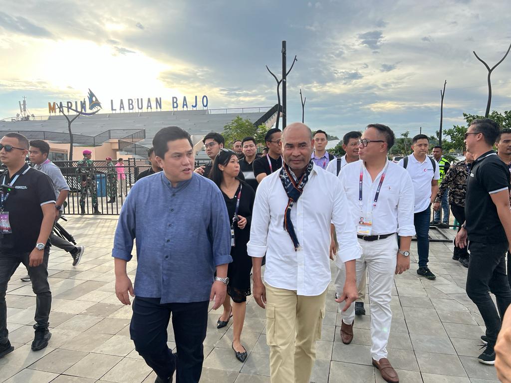 Menteri BUMN Erick Thohir (kiri) bersama dengan Gubernur Nusa Tenggara Timur (NTT) Viktor Laiskodat (tengah) saat meninjau SME’s HUB di Marina Waterfront Labuan Bajo pada Selasa (9/5). SME’s HUB merupakan rangkaian Side Event KTT ASEAN 2023 yang digelar dari tanggal 9 s.d. 13 Mei 2023 di Marina Waterfront Labuan Bajo NTT, dengan menargetkan kehadiran dari para delegasi negara ASEAN juga masyarakat umum.