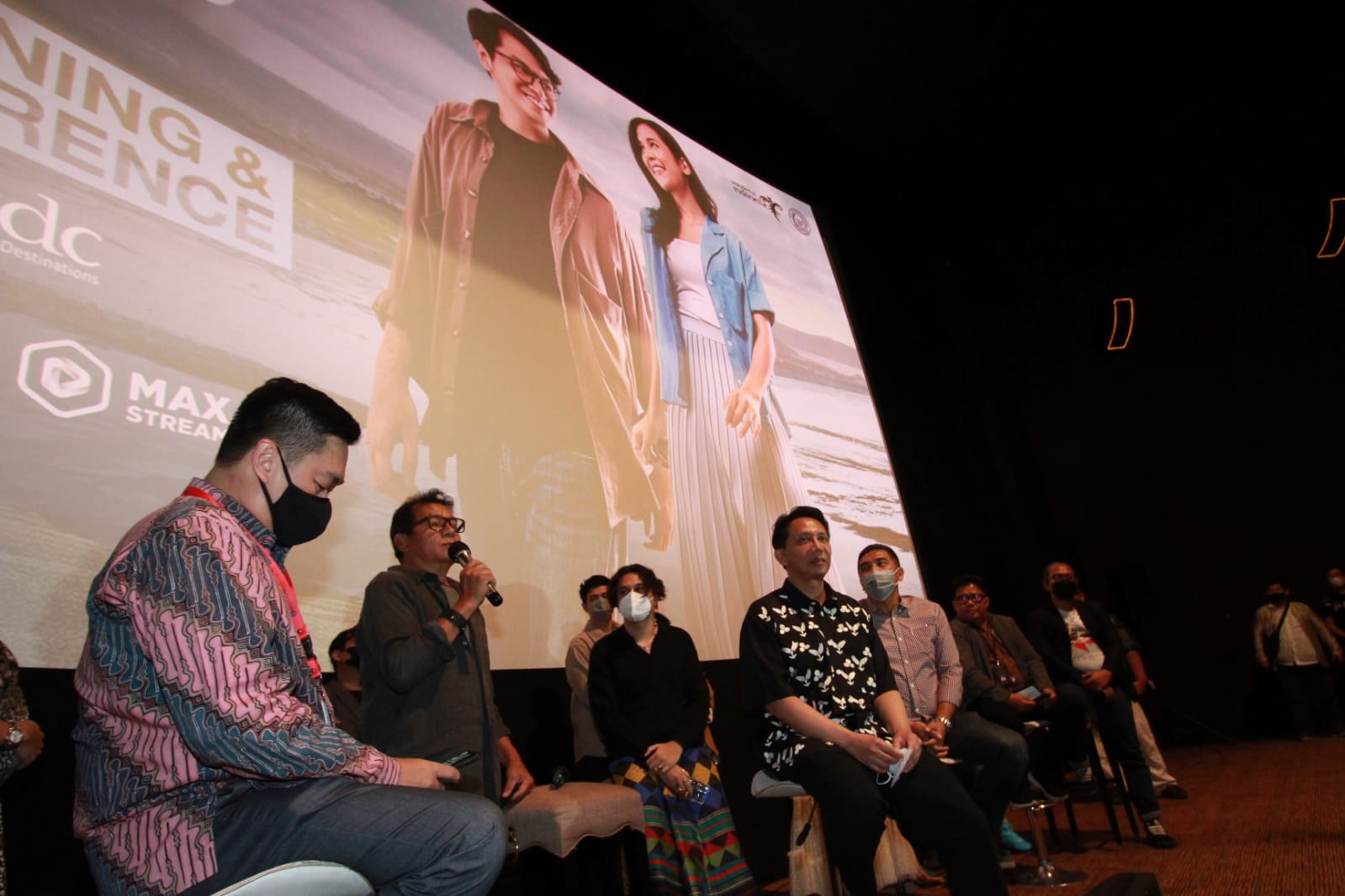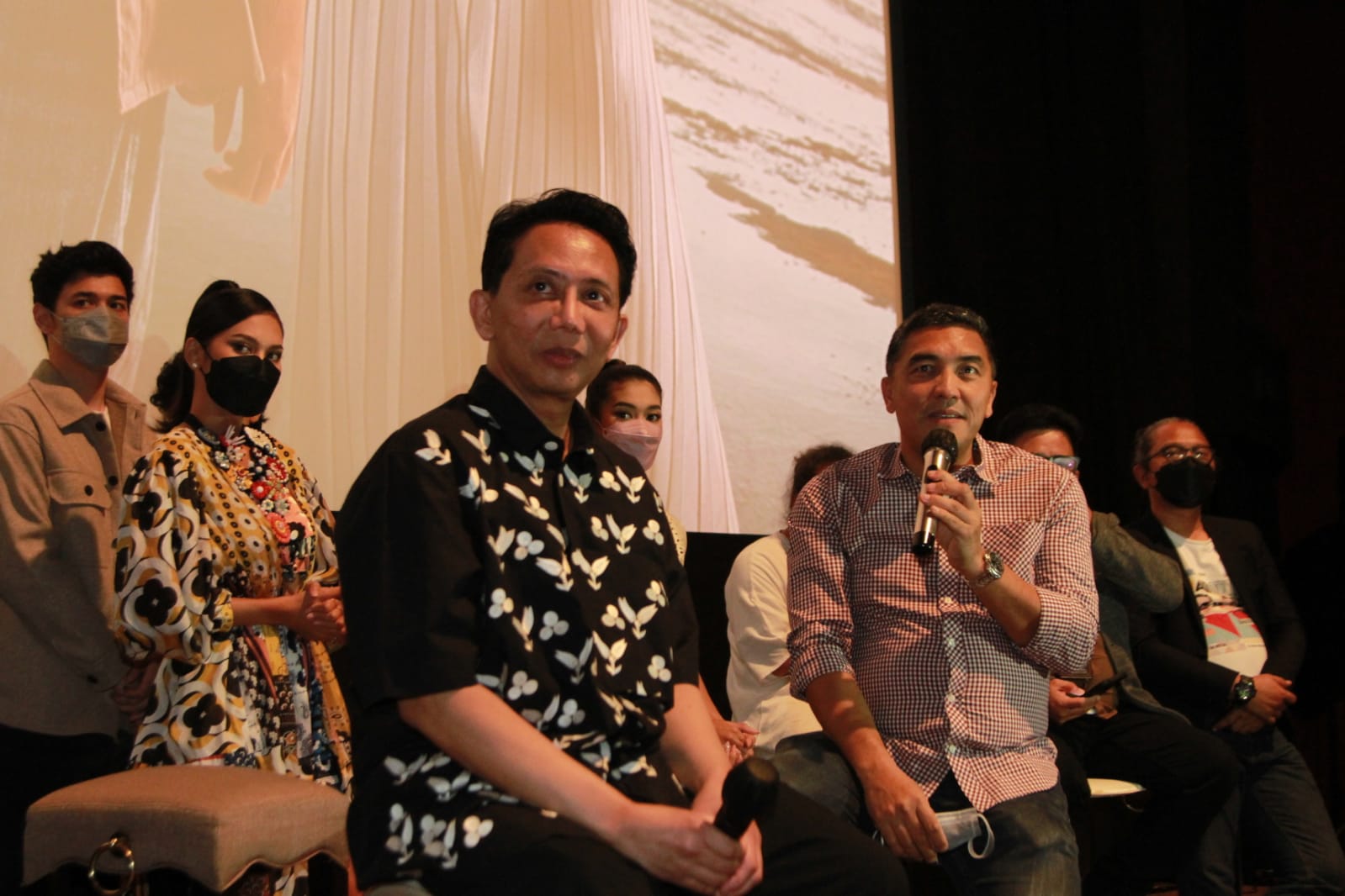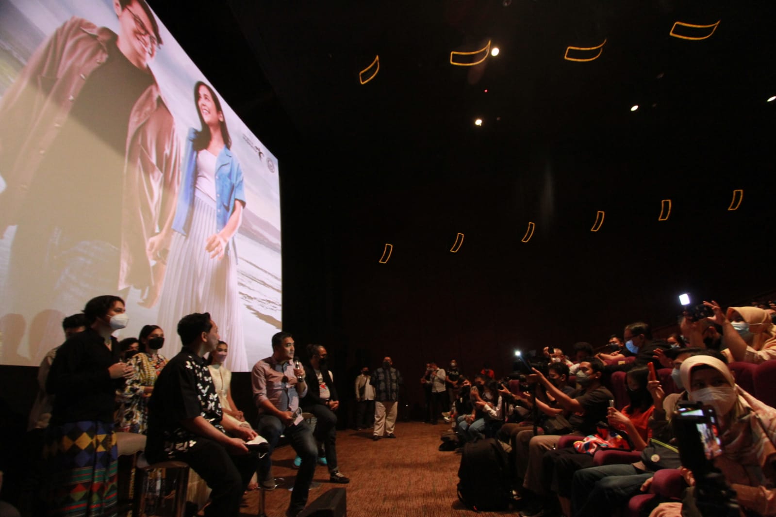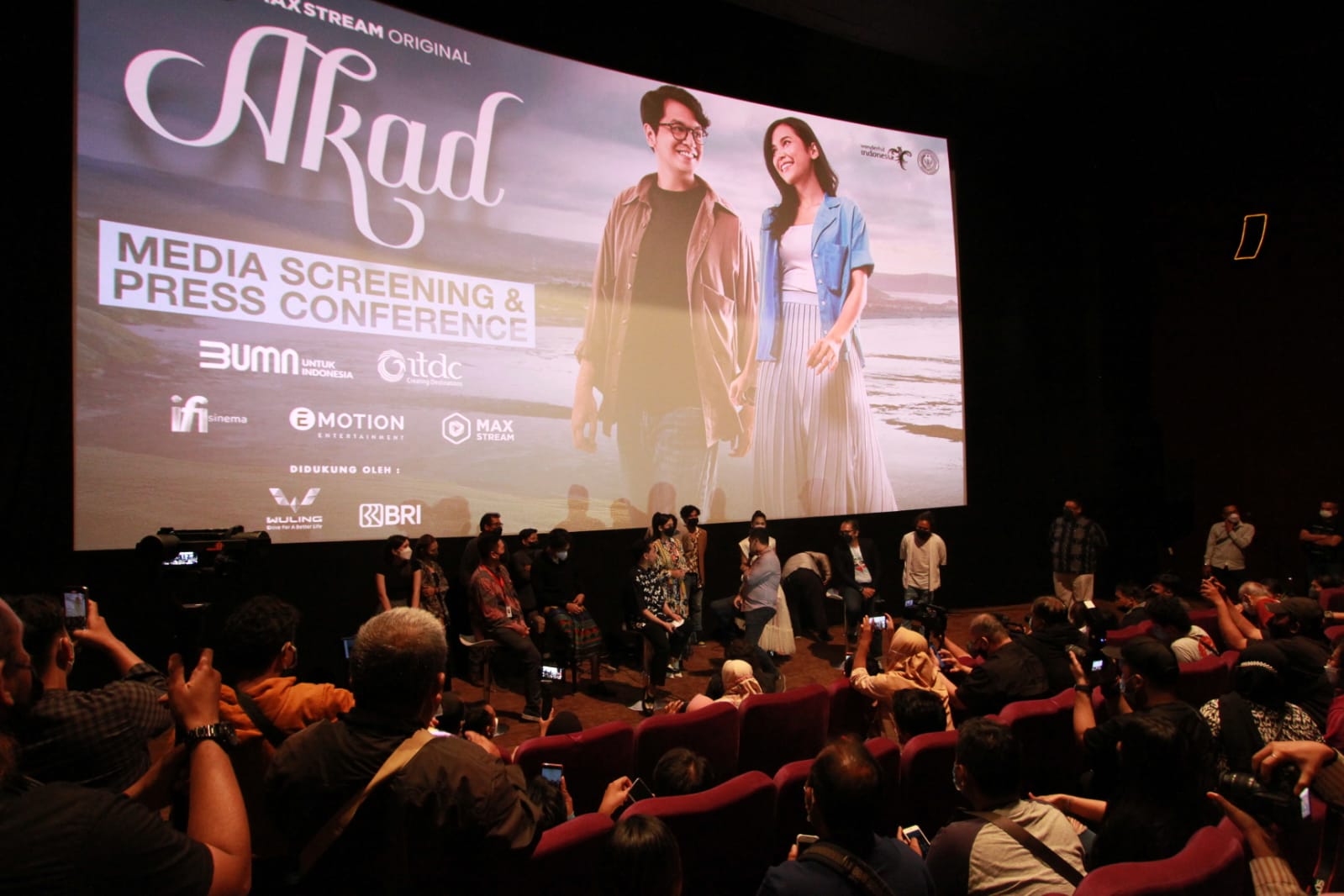 Direktur Utama ITDC Abdulbar M. Mansoer (keempat kanan), Direktur IFI Sinema sekaligus produser film AKAD Adiyanto Sumardjono (kelima kiri), AEO E-motion Entertainment Arnold J. Limasnax (keempat kiri) berfoto bersama pemeran fim AKAD seusai media screening Film AKAD di Jakarta, Rabu (2/2). Film yang tayang mulai 3 Februari ini merupakan hasil kerjasama ITDC, IFI sinema, E-motion Entertainment, MAXstream, didukung oleh Wuling Motors Indonesia dan PT Bank Rakyat Indonesia (Persero), Tbk serta mendapatkan dukungan Pemerintah melalui program Pemulihan Ekonomi Nasional (PEN) Bidang Perfilman dari Kemenparekraf.