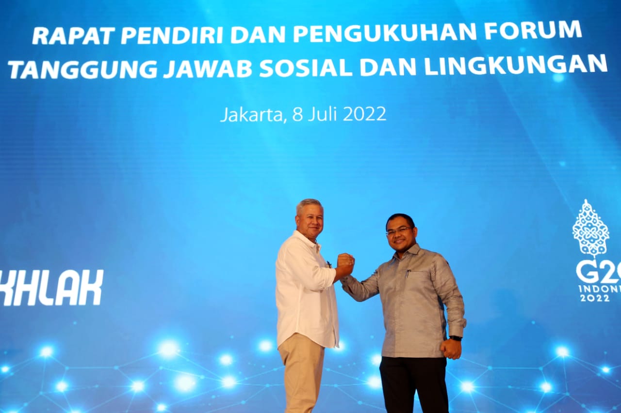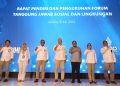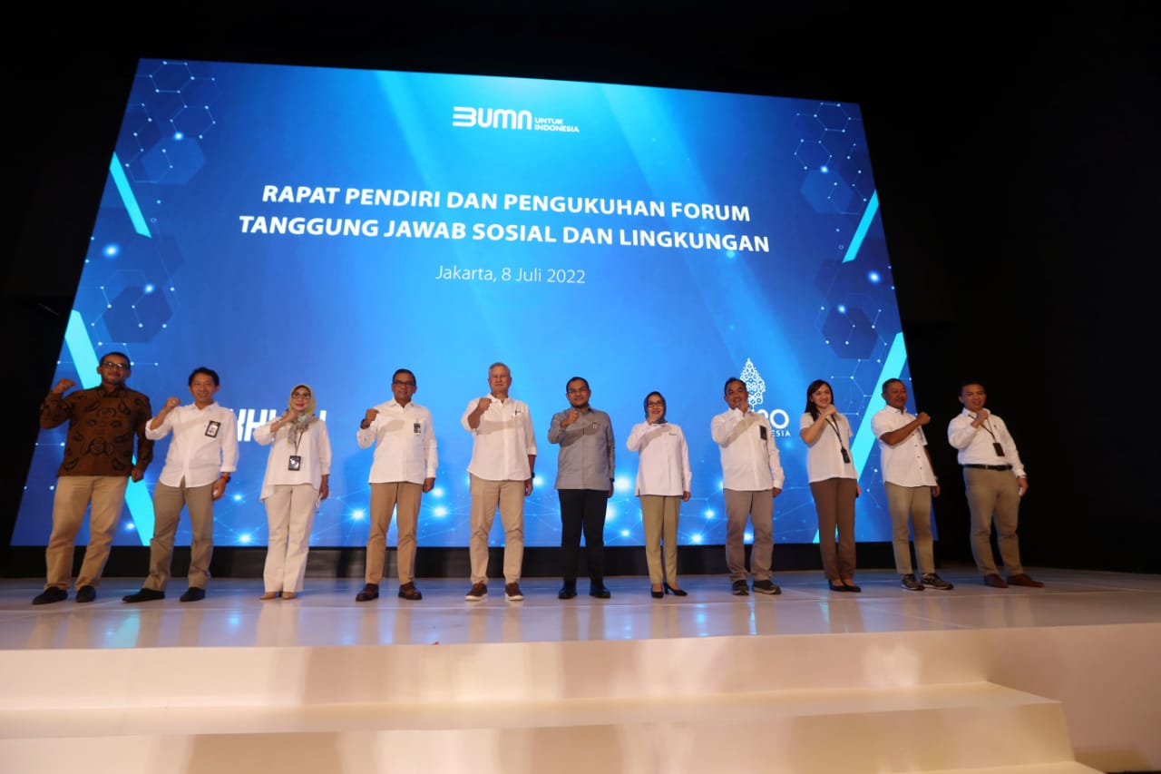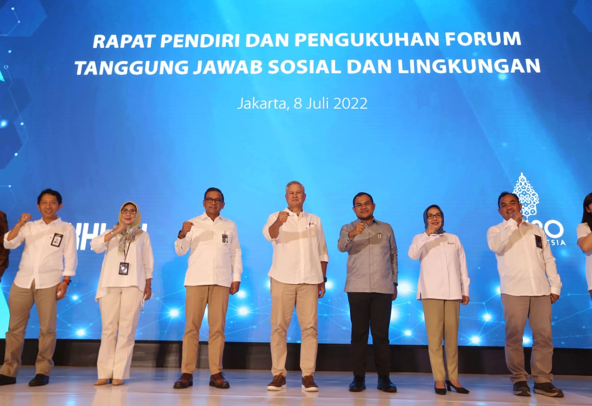 (Ki-Ka) Direktur Bisnis Wholesale & Kelembagaan Bank BRI Agus Noorsanto selaku Sekretaris Forum Tanggung Jawab Sosial dan Lingkungan (TJSL) BUMN, Direktur Hubungan Kelembagaan Bank Mandiri Rohan Hafas sebagai Ketua Forum TJSL BUMN, bersama Deputi SDM dan Teknologi Informasi Kementerian BUMN Tedi Bharata serta Direktur SDM, Tata Kelola & Manajemen Risiko PT Pupuk Indonesia Holding Company (PIHC) Tina T. Kemala yang ditunjuk menjadi Bendahara Forum usai menandatangani Pendirian serta Pengukuhan Pengurus Forum TJSL BUMN Indonesia di Plaza Mandiri, Jakarta, Jumat (8/7). Forum TJSL BUMN ini akan menjadi wadah bagi perusahaan plat merah untuk sharing knowledge serta mensinergikan program TJSL BUMN agar tepat sasaran. Diharapkan, pendirian Forum TJSL BUMN ini akan mampu mengoptimalkan koordinasi antar perusahaan BUMN, Perusahaan Anak hingga Cucu Perusahaan agar mampu memberikan nilai ekonomi dan sosial yang signifikan bagi masyarakat Indonesia.