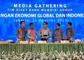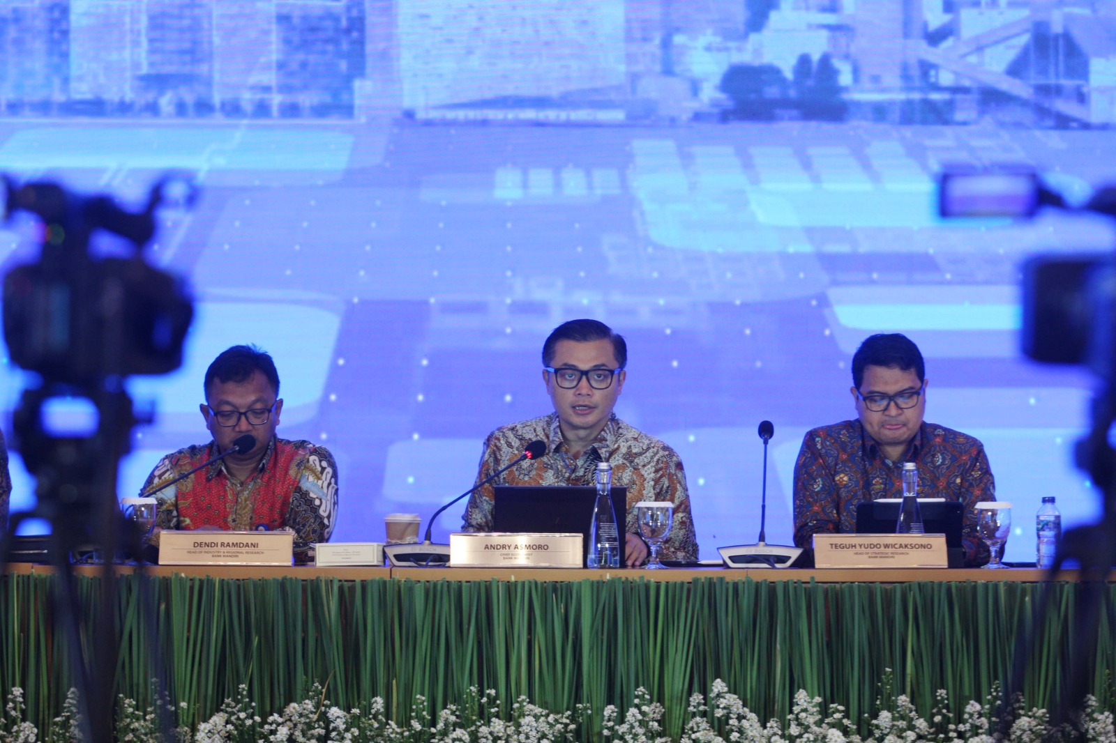 (Kiri – kanan) Head of Equity Research, Strategy, Consumer Mandiri Sekuritas Adrian Joezer, Head of Industry & Regional Research Bank Mandiri Dendi Ramdani, Chief Economist Bank Mandiri Andry Asmoro, Head of Mandiri Institute Teguh Yudo Wicaksono, Head of Fixed Income Research Mandiri Sekuritas Handy Yunianto berbincang pada sela-sela Macroeconomic Outlook Indonesia Semester II-2023 di Plaza Mandiri, Jakarta, Selasa (22/8). Tim ekonom Bank Mandiri Group meyakini ekonomi Indonesia akan tumbuh sesuai target pada level 5,04% di tahun 2023. Diperkirakan, perhelatan pemilu secara serentak pada November 2023 mendatang bakal mendatangkan efek positif dari sisi konsumsi pada sisa tahun ini. Secara sektoral, perekonomian masih ditopang sektor-sektor terkait mobilitas dan konstruksi.