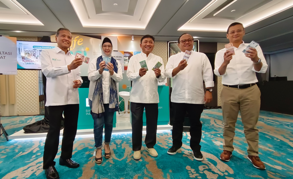 Ki-ka : Direktur Treasury & international Banking BSI Moh Adib, Wakil Direktur Utama BSI Bob Tyasika Ananta, Direktur Compliance & Human Capital BSI Tribuana Tunggadewi, Direktur Information Technology BSI Achmad Syafii, SEVP Digital Banking BSI Saut Parulian Saragih saat melayani transaksi penukaran uang baru di Jakarta, Selasa (4/4). BSI siap memfasilitasi kebutuhan transaksi keuangan masyarakat, yang diproyeksikan mengalami kenaikan menjelang libur Ramadhan dan Hari Raya Idul Fitri. Pada 23 Maret – 2 Mei 2023, BSI menyiapkan uang tunai sebesar Rp37,6 triliun untuk memenuhi kebutuhan keuangan masyarakat.
