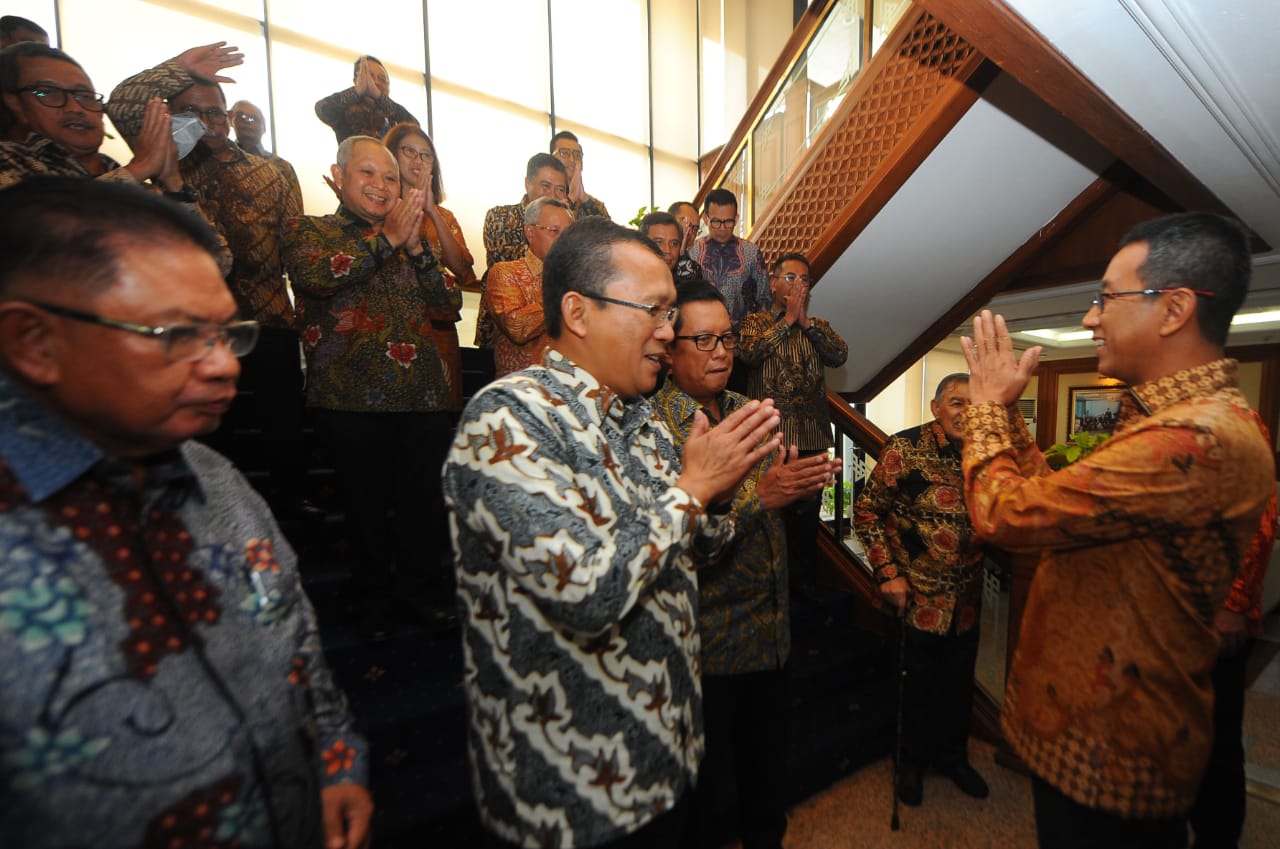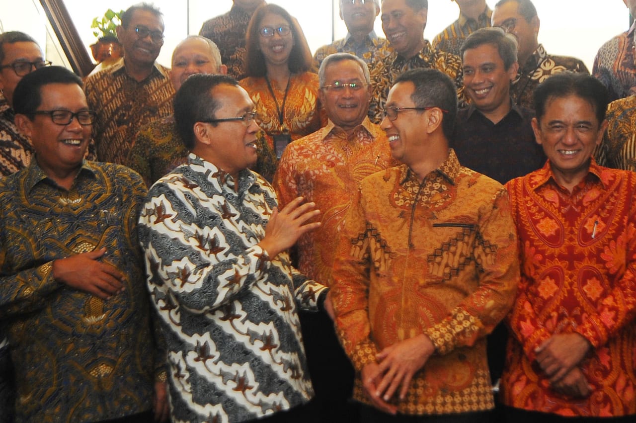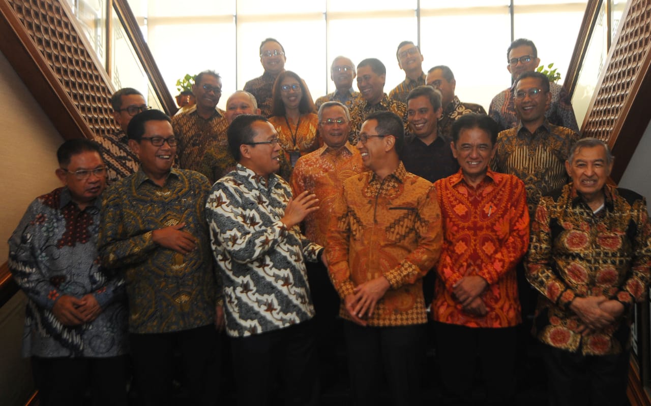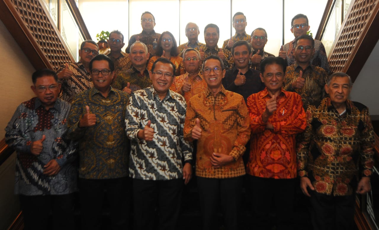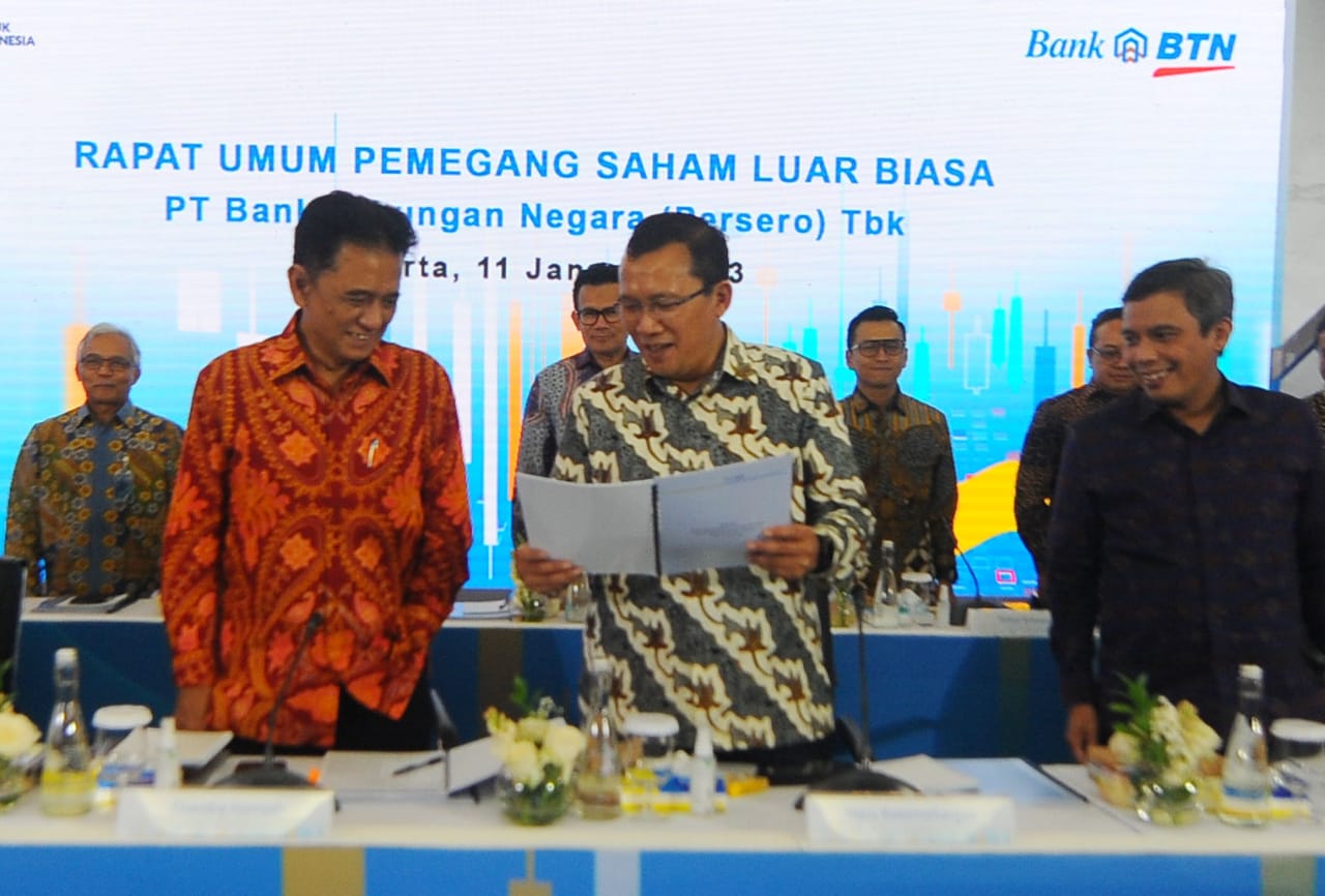 Direktur Utama Bank BTN Haru Koesmahargyo berbincang dengan Penjabat Gubernur DKI Jakarta Heru Budi Hartono didampingi Komisaris Utama Bank BTN Chandra M Hamzah dan Wadirut Bank BTN Nixon LP Naputupulu serta jajaran Direksi dan Komisaris Bank BTN disela-sela Rapat Umum Pemegang Saham Luar Biasa (RUPSLB) Bank BTN di Jakarta, Rabu (11/1). RUPSLB Bank BTN menyetujui pengunduran diri Heru Budi Hartono sebagai Komisaris Bank BTN dan mengangkat M Yusuf Permana sebagai Komisaris Bank BTN. Selain itu, RUPSLB juga mengangkat kembali Andi Nirwoto sebagai Direktur IT & Digital Bank BTN.