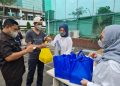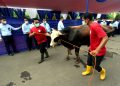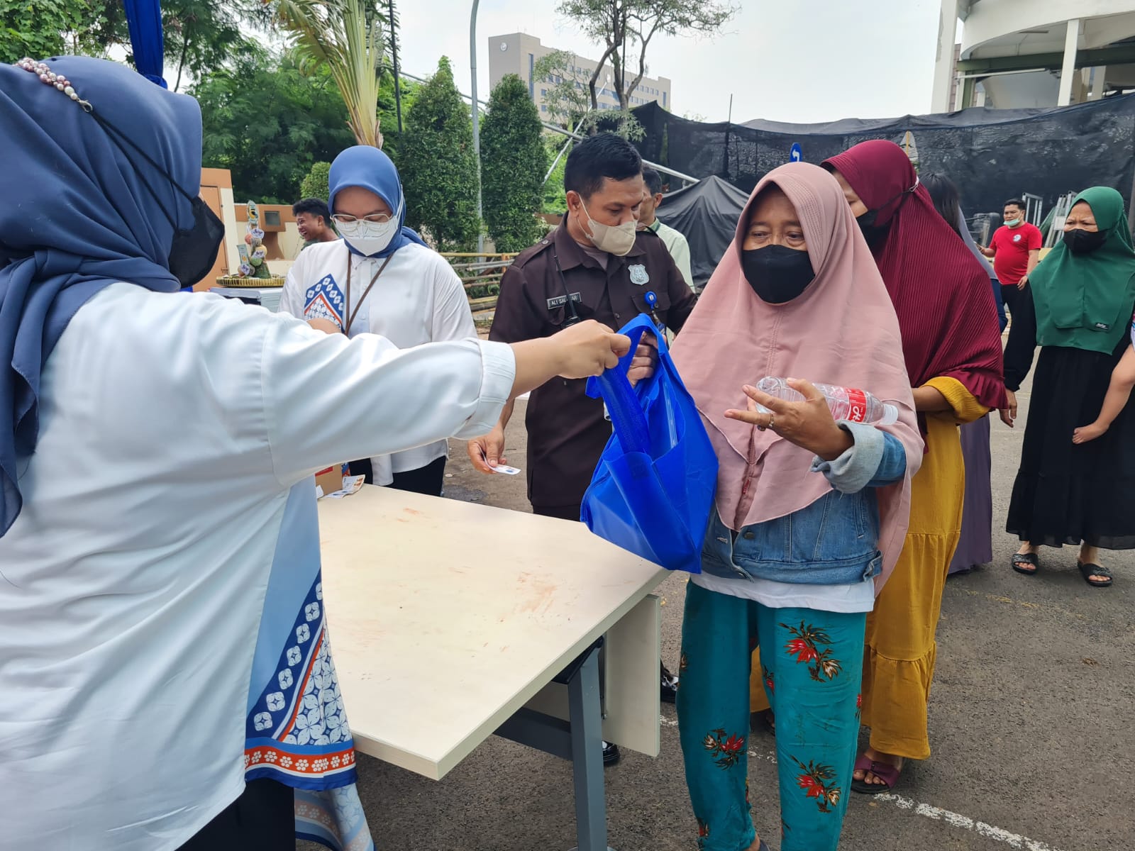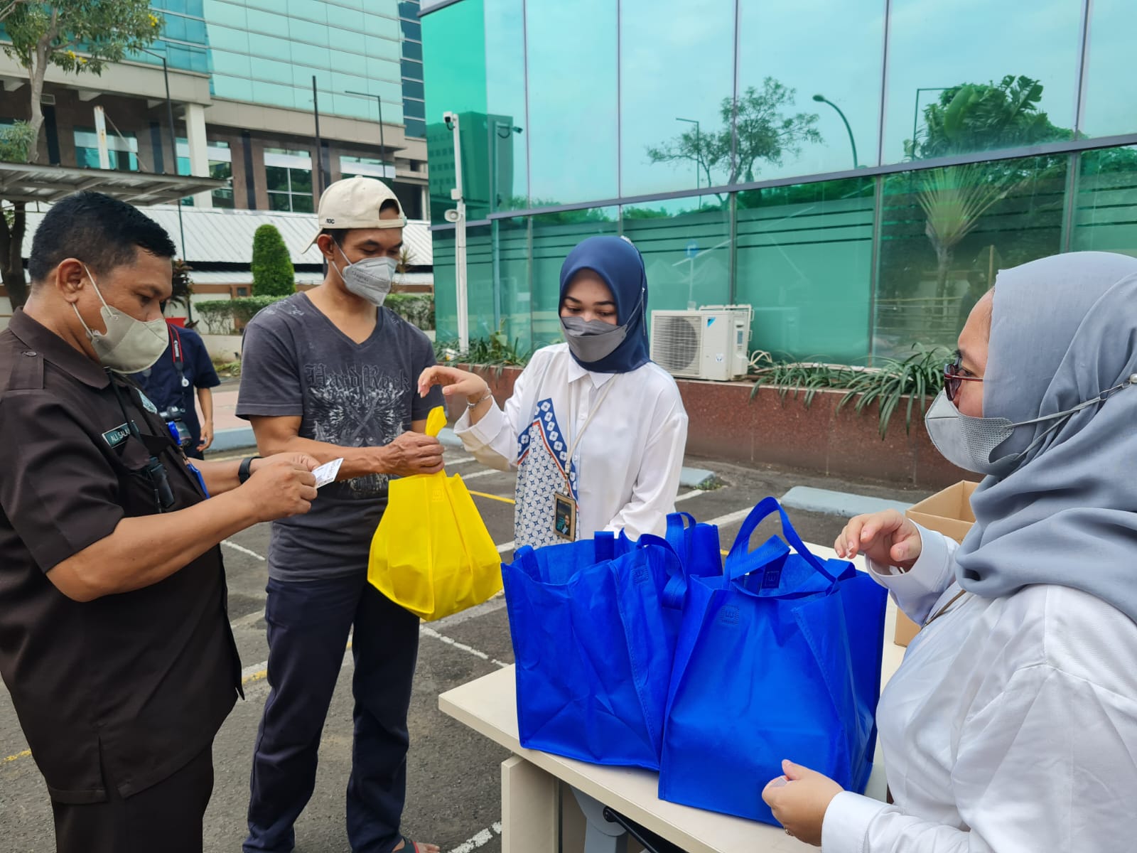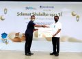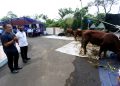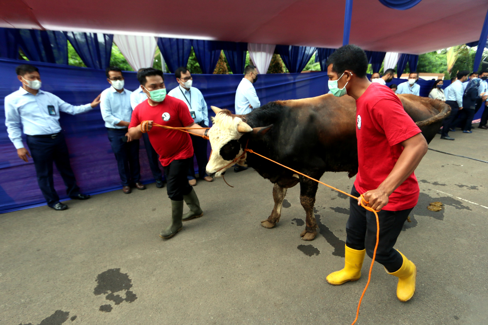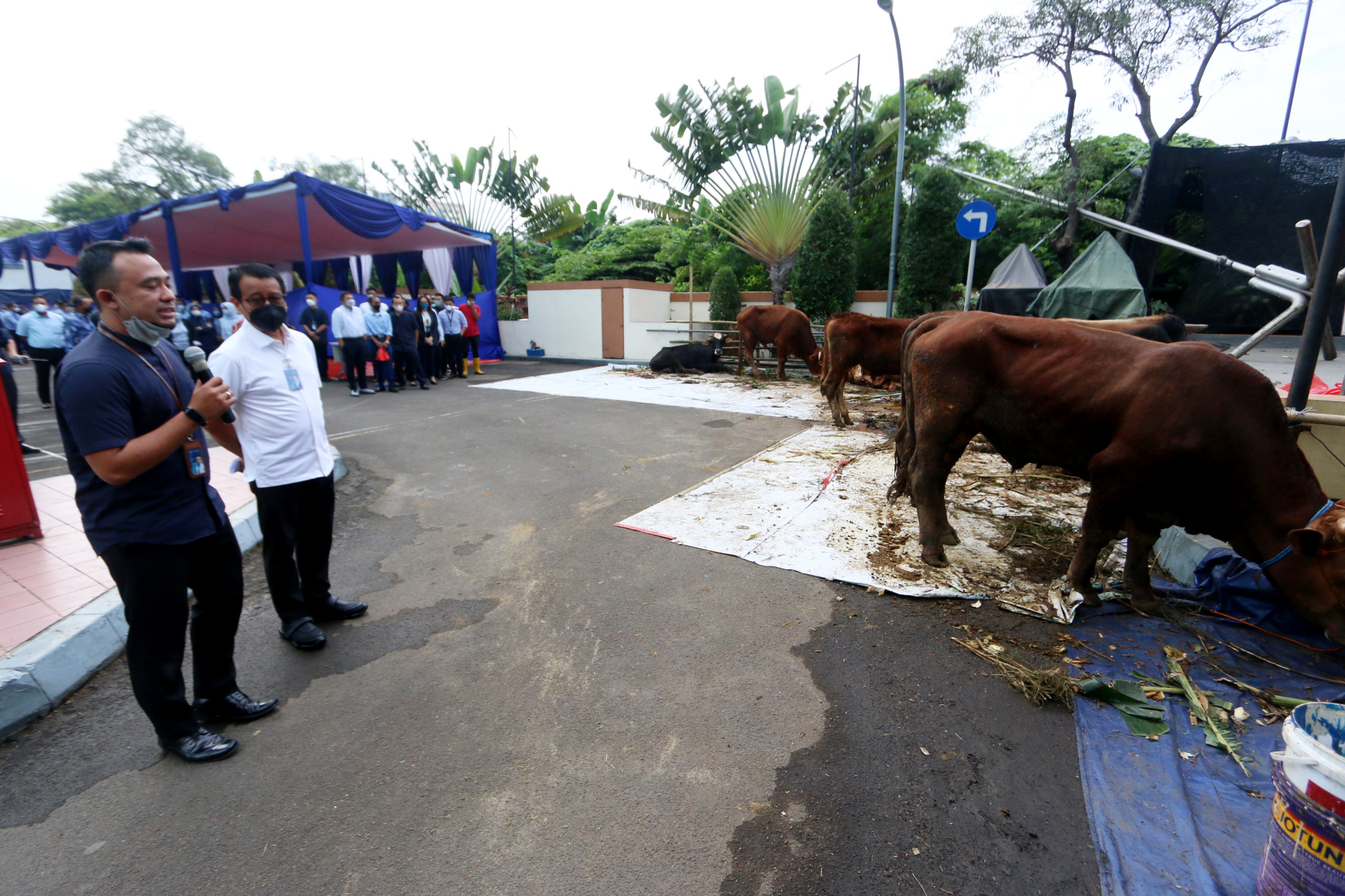Kiri kanan: Ketua Panita Qurban PT Jamkrindo Wahyu Nando Wijaya, Dirut PT Jamkrindo Putrama Wahyu Setyawan (Dua kiri) di dampingi juga Direktur Bisnis Penjaminan PT Jamkrindo Suwarsito (empat Kanan), Direktur Operasional dan JaringanPT Jamkrindo Kadar Wisnuwarman (tiga Kanan) , Diretur MSDM, Umum dan Kepatuhan PT Jamkrindo Sulis Usdoko (dua kanan) dan Direktur Keuangan, SDM dan Umum PT Jamkrindo Syariah Endang Sri Winarni (kanan) secara simbolis menyerahkan dan menyaksikan pemotongan hewan Qurban di Kantor Pusat PT Jamkrindo, Senin 11 Juli 2022.