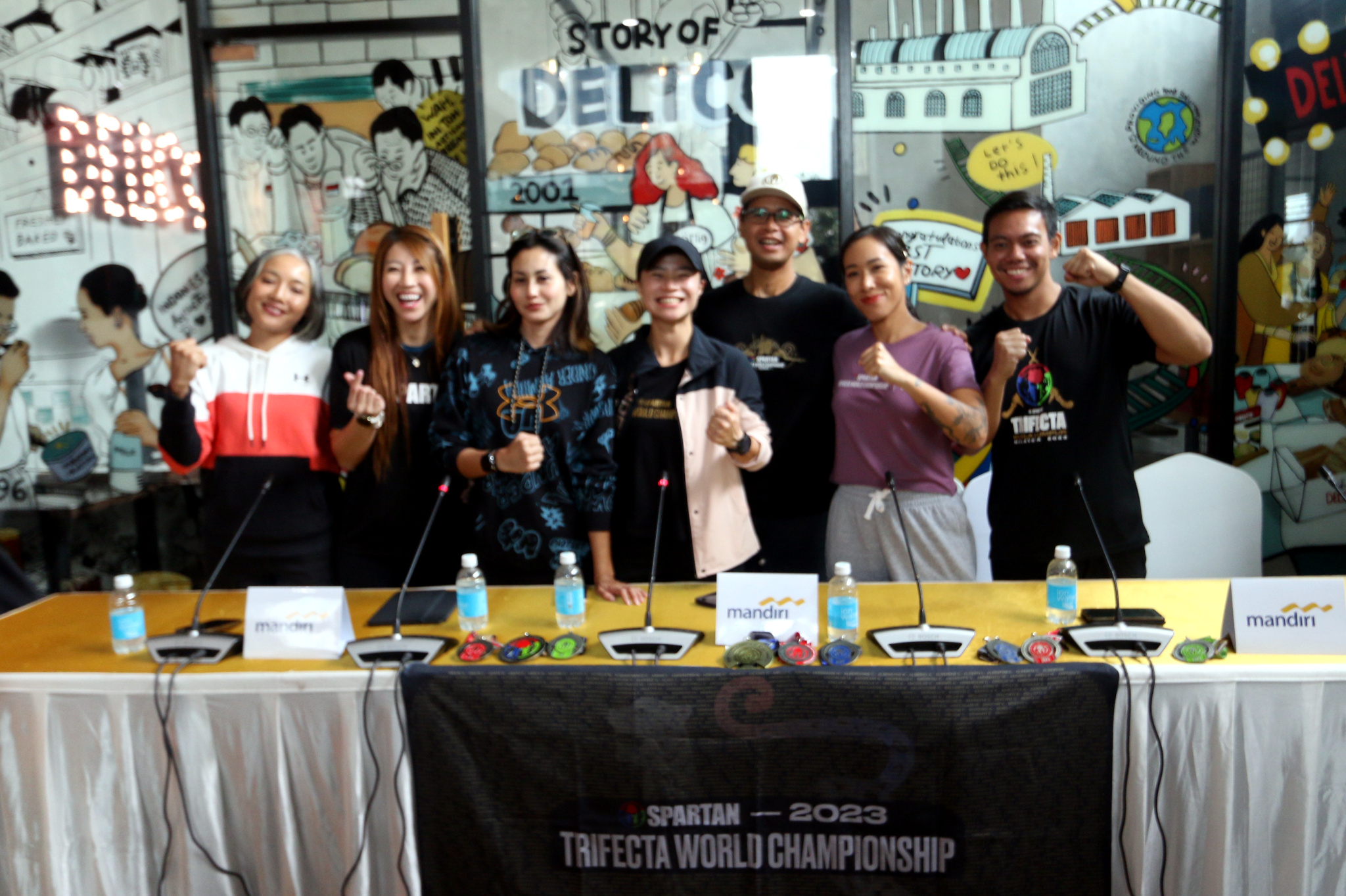 Dari kiri ke kanan. Anggota Hexa Heroes Yona Pohan, Fenny Octavia, Shara Virrisya, Florence Bun, Talita Setyadi dan Centa Nasri berfoto bersama usai memberi keterangan pers di Jakarta, Kamis (23/11). Hexa Heroes, tim OCR dari Indonesia, meraih prestasi gemilang di Spartan Race KL dengan meraih Podium 2 Kategori Super dan podium 3 kategori Beast (Florence Bun) serta Talita Setyadi meraih podium 3 dalam Beast Kategori mewakili Age Group 30-34 dan Fenny Octavia berhasil masuk dalam top 5 untuk kategori Beast dalam Age Group 40-44.