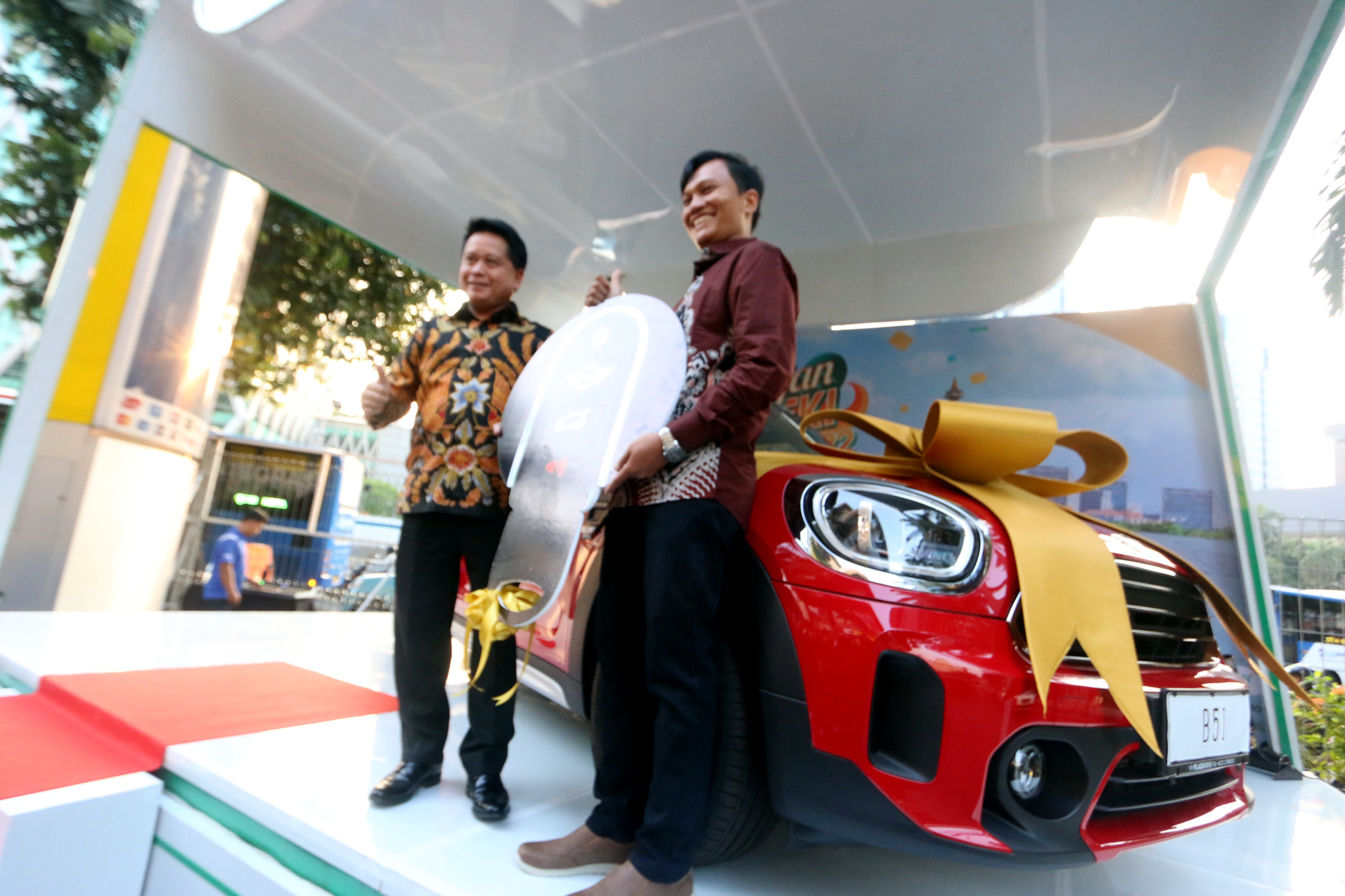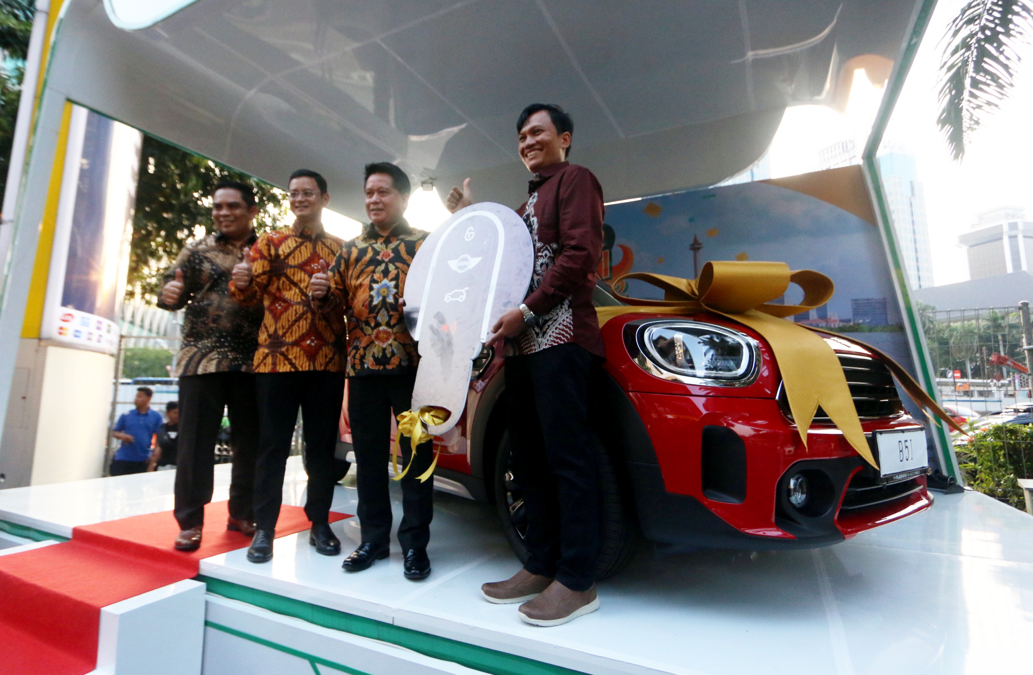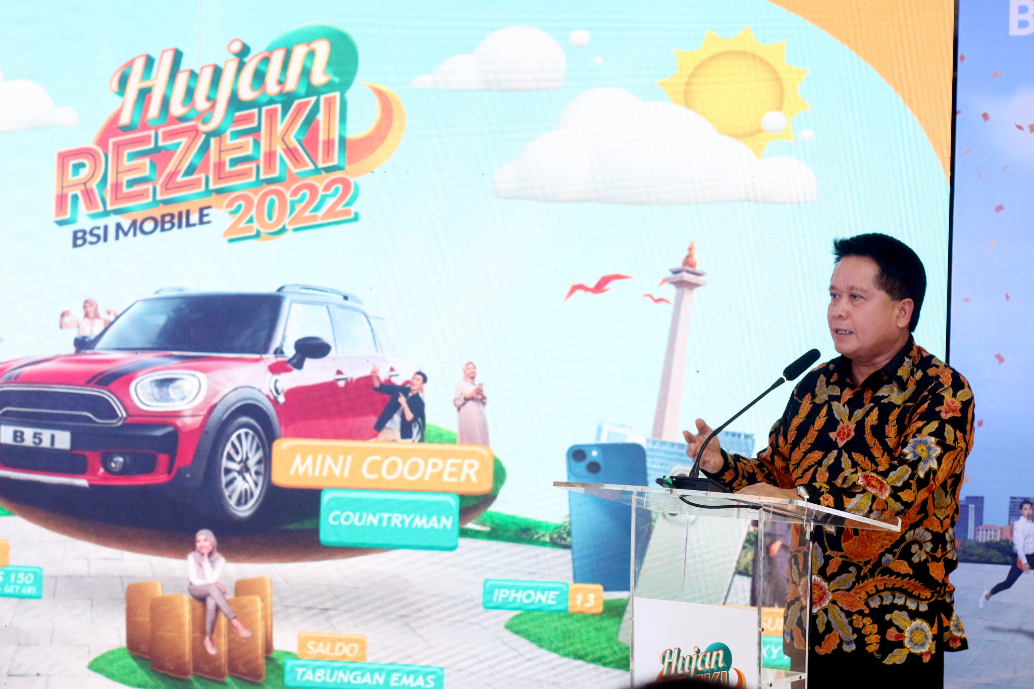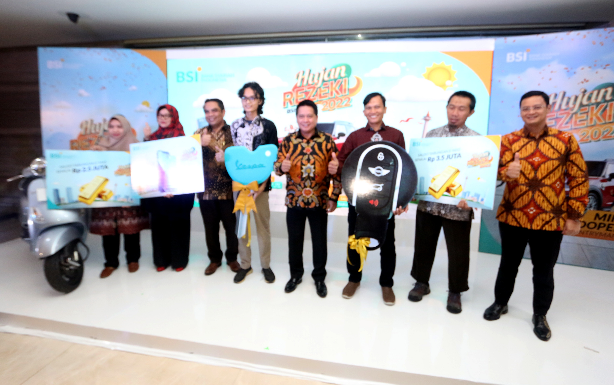 Direktur Utama BSI Hery Gunardi (tiga dari kiri) menyerahkan hadiah utama Program Hujan Rejeki BSI Mobile 2022 kepada Ridwan Maulana Putra (paling kanan) selaku Pemenang Utama didampingi Direktur Sales & Distribution BSI Anton Sukarna (tiga dari kiri) dan SEVP Digital Banking BSI Saut Parulian Saragih (kiri kedua) di Wisma Mandiri, Jakarta. (15/05). PT Bank Syariah Indonesia Tbk (BSI) memberikan hadiah utama 1 unit mobil Mini Cooper Country Man dalam acara Hujan Rezeki BSI periode Agustus 2022 – Maret 2023. Ini merupakan wujud apresiasi pada nasabah yang setia menggunakan BSI Mobile.