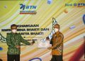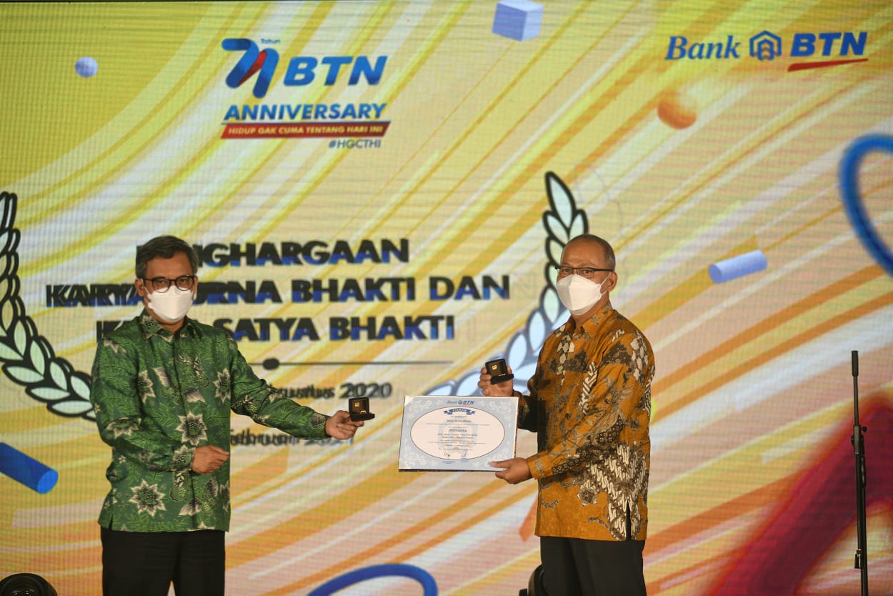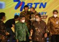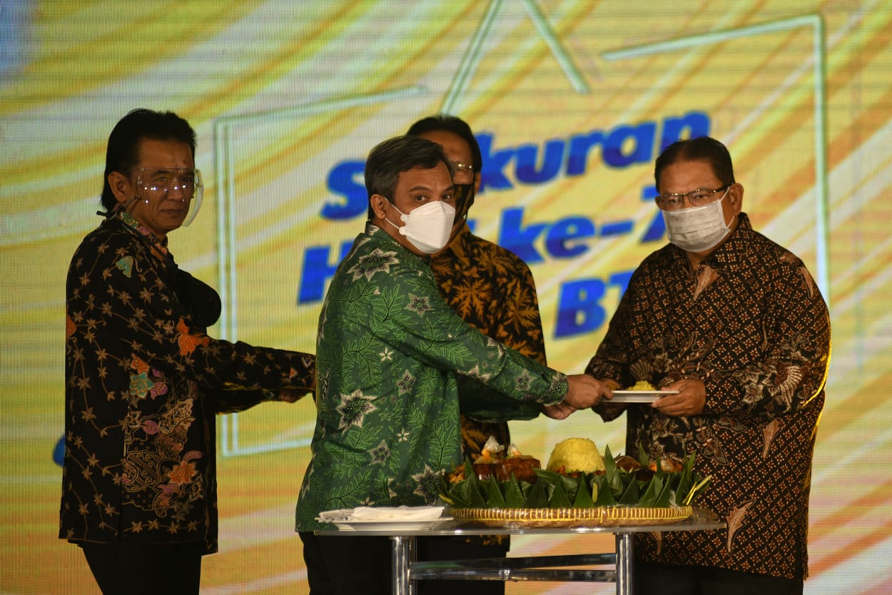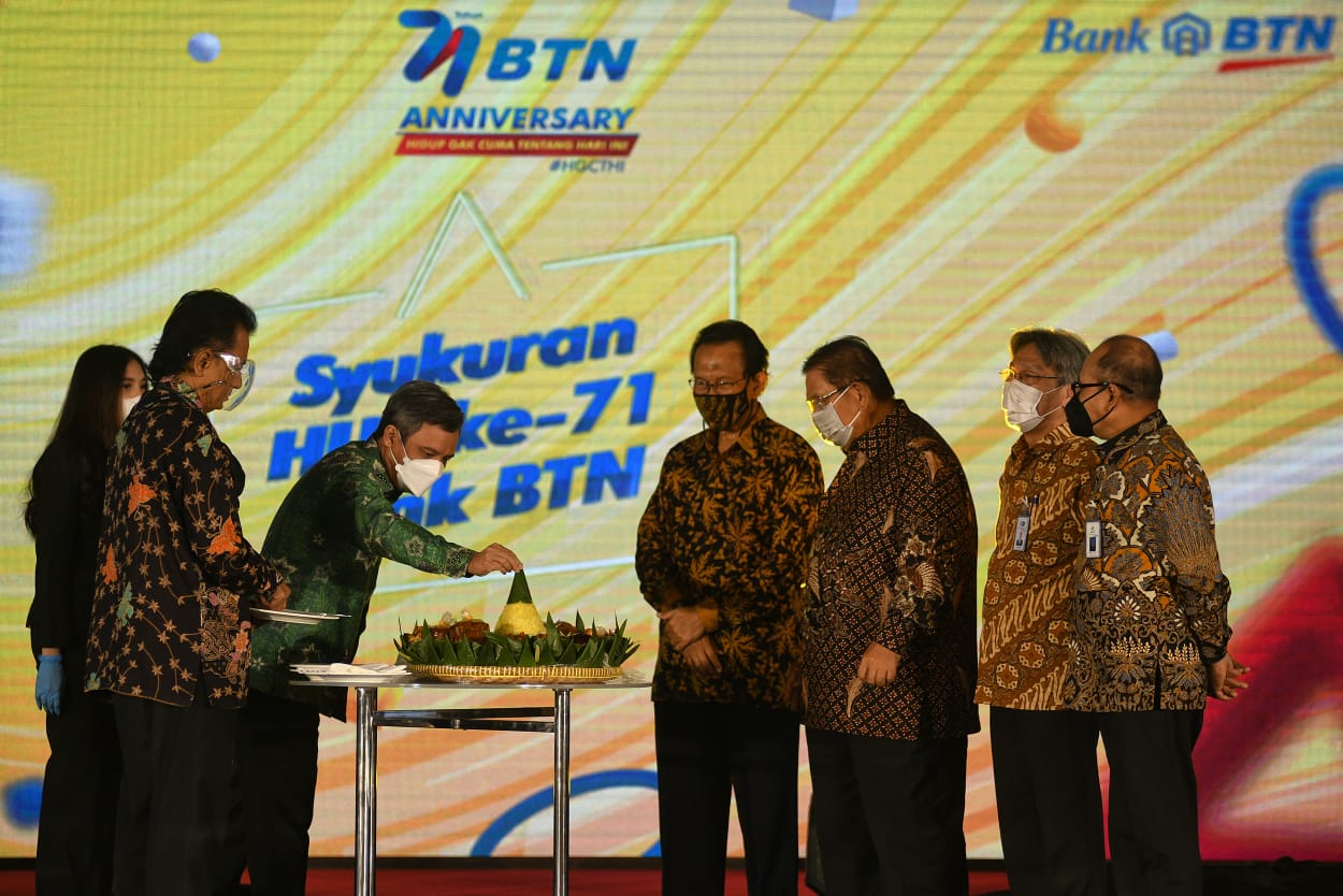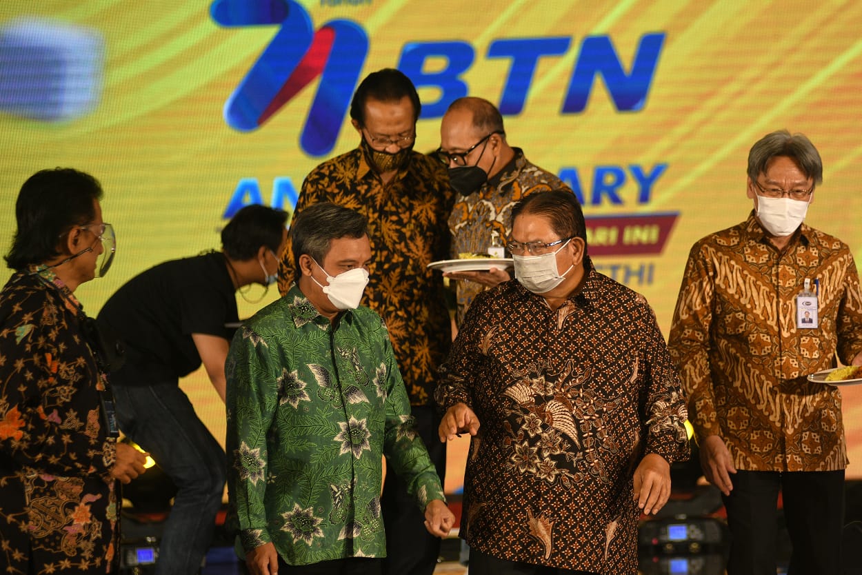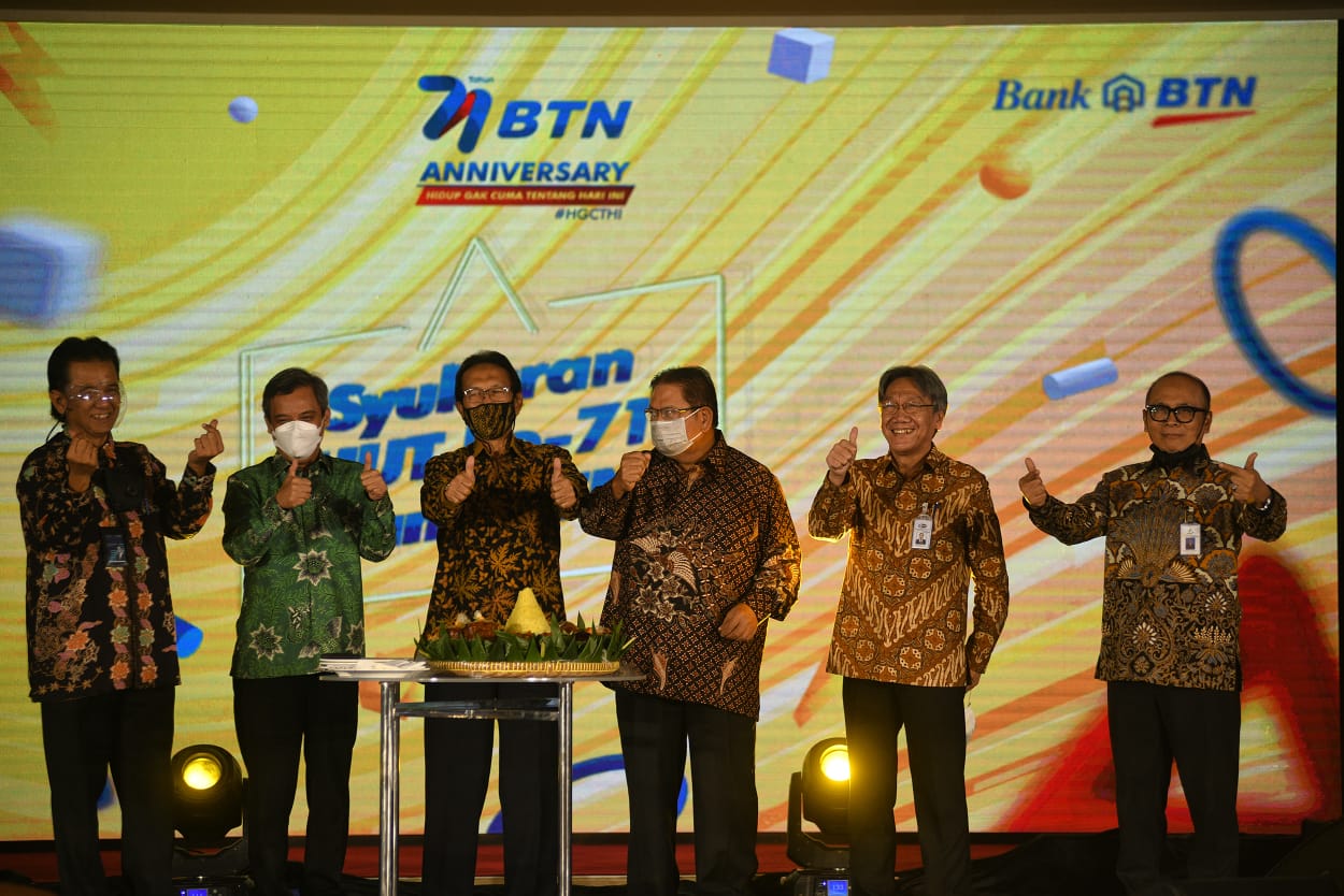 Komisaris Utama PT Bank Tabungan Negara (Persero)Tbk. Chandra Hamzah (kiri) dan Plt Direktur Utama Bank BTN ,Nixon LP Napitupulu (kedua dari kiri) kompak mengangkat jempol usai melakukan prosesi pemotongan tumpeng saat acara syukuran Hari Ulang Tahun Bank BTN ke 71 di Jakarta, Selasa (9/2). Selama 71 tahun berdiri Bank BTN telah merealisasikan pembiayaan senilai lebih dari Rp640 triliun dan telah menyentuh lebih dari 5 juta masyarakat di Indonesia atau 20 juta orang jika rata-rata satu rumah dihuni oleh 4 orang. Dalam rangka HUT 71 tersebut, BTN menggelar program kado beruntung KPR dengan suku bunga 4,71% berkolaborasi dengan para pengembang dalam ajang Anniversary BTN Solusi Properti Expo yang akan digelar 27 Februari mendatang.
