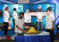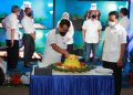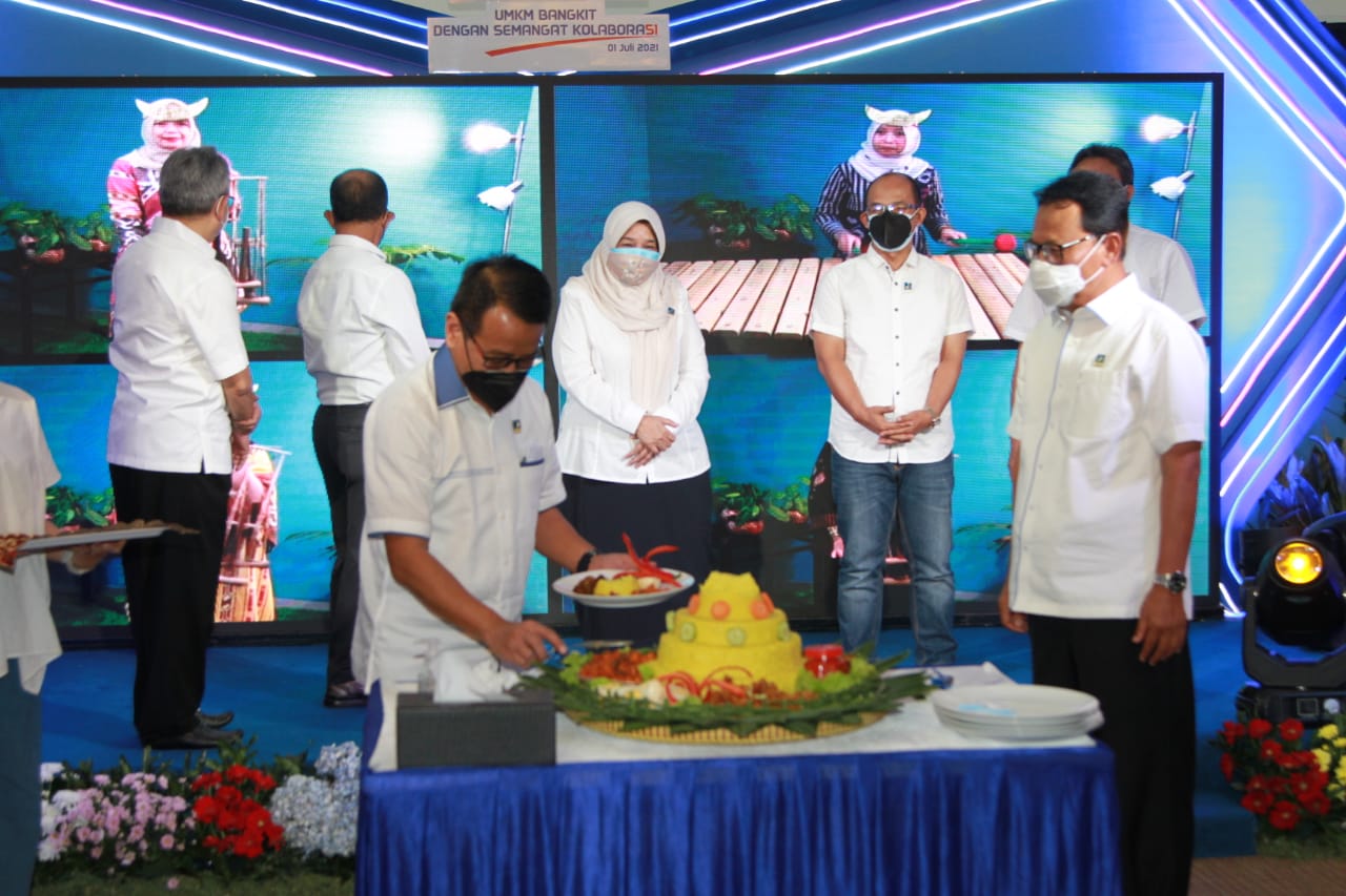Direktur Utama PT Jamkrindo (kiri) Putrama W Setyawan ditemani oleh Komisaris Utama PT Jamkrindo, Sri Mulyanto (kanan) dan didampingi jajaran Direksi dan Komisaris memotong tumpeng pada perayaan puncak HUT PT Jamkindo ke 51 di Kantor Pusat PT Jamkrindo pada Kamis, 1 Juli 2021. UMKM bangkit dengan semangat kolaborasi menjadi tema yang diambil pada perayaan yang dilakukan secara hybrid ini dengan mengikuti protokol kesehatan di masa pendemi ini. PT Jamkrindo berkomitmen untuk terus berkontribusi dalam memajukan usaha mikro, kecil, menengah dan koperasi.
