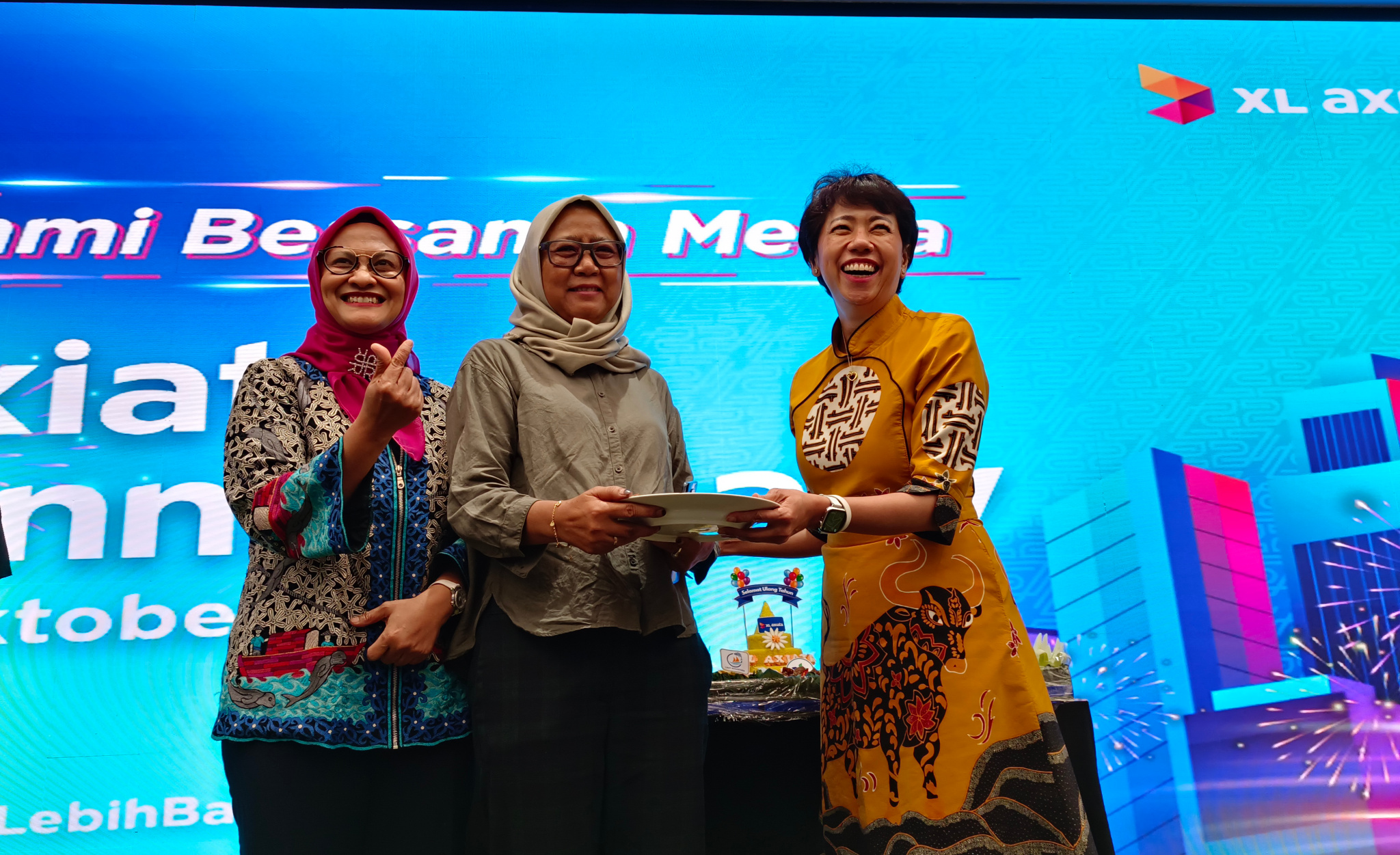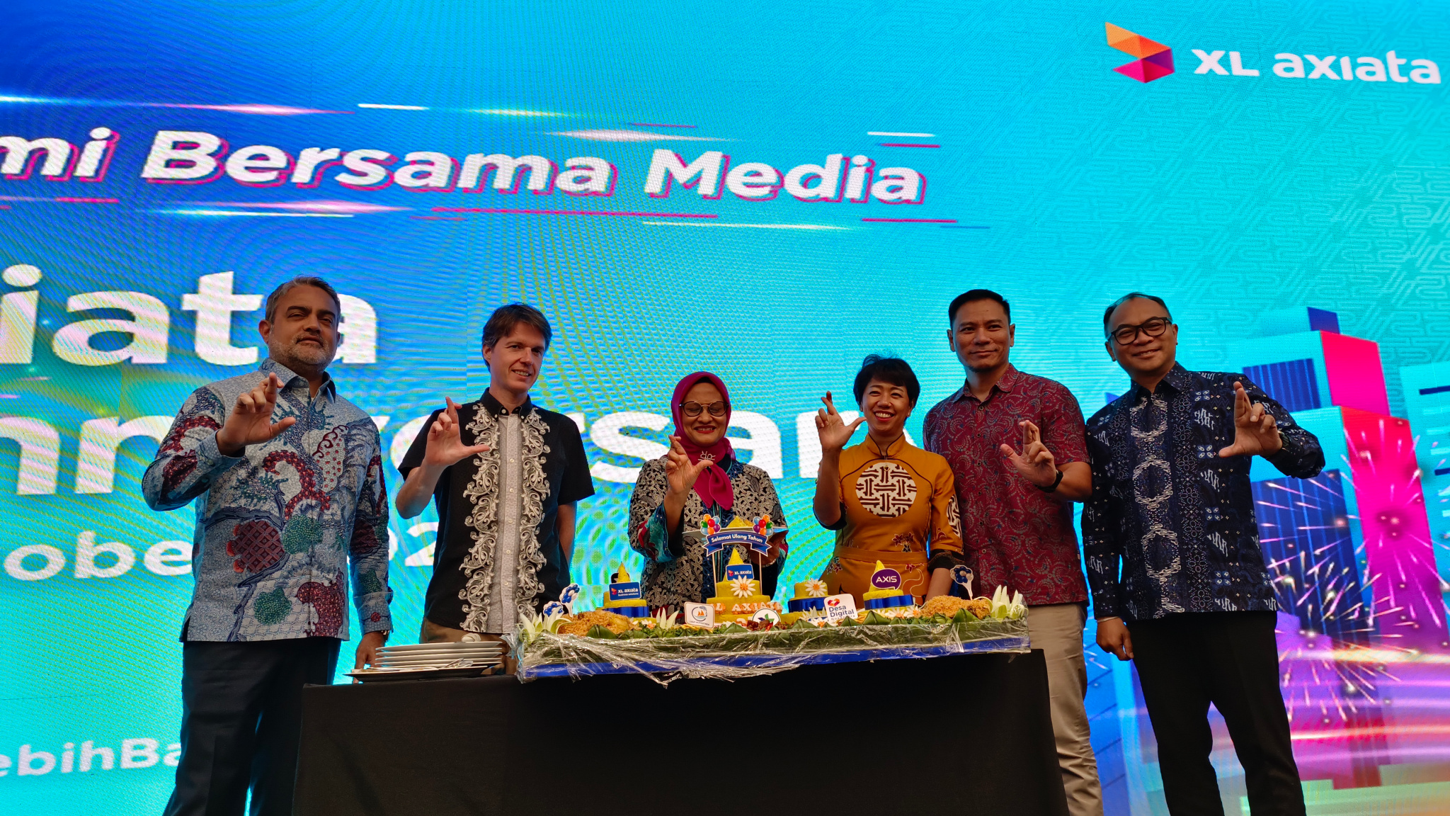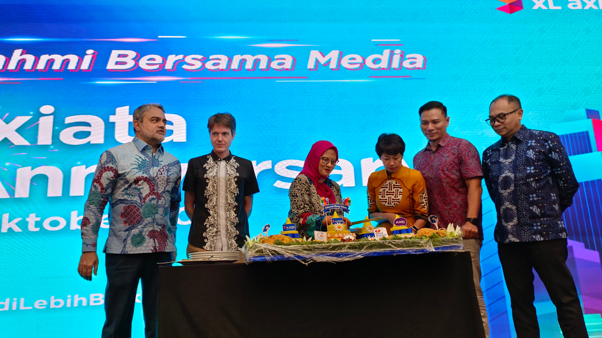 Presiden Direktur & CEO PT XL Axiata Tbk. Dian Siswarini (ketiga kiri) memotong tumpeng didampingi Direktur & Chief Commercial Officer – Home Abhijit Navalekar (dari kiri), Direktur & Chief Commercial Officer – Consumer David Arcelus Oses, Direktur & Chief Enterprise Business and Corporate Affairs Yessie D. Yosetya, Direktur & Chief Financial Officer Feiruz Ikhwan, dan Direktur & Chief Technology Officer I Gede Darmayusa, saat jumpa media sekaligus peringatan HUT ke-27 XL Axiata bertema untuk Indonesia #JadiLebihBaik di Jakarta, Senin (9/10/2023). Di usia ke-27 XL Axiata berkomitmen untuk terus membangun dan mengembangkan infrastruktur hingga ke pelosok Tanah Air, guna mendorong literasi digital yang merata bagi masyarakat.