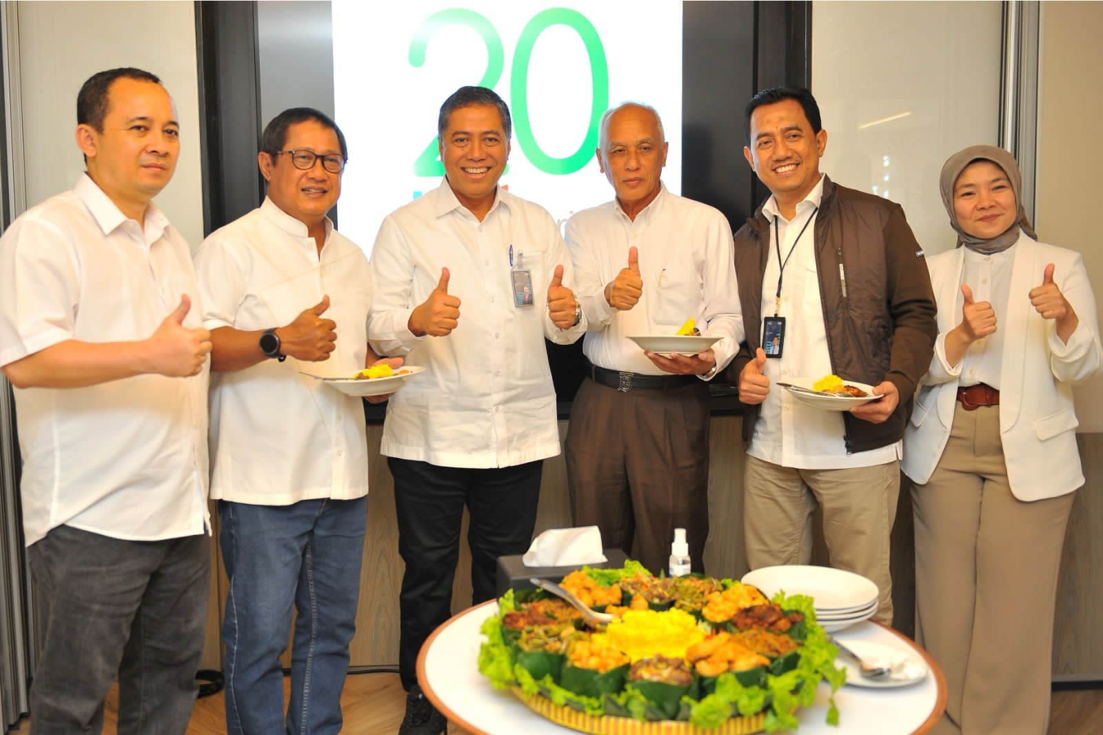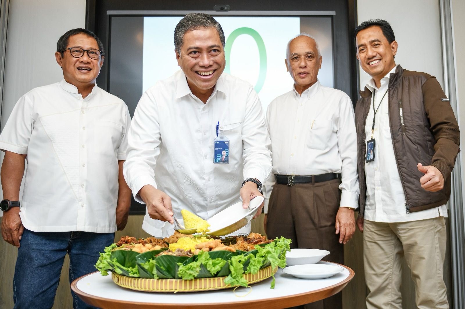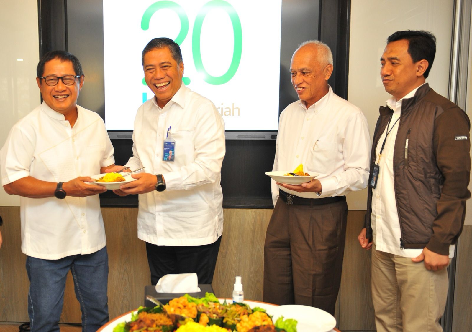 Direktur Consumer PT Bank Tabungan Negara (Persero) Tbk, Hirwandi Gafar (kedua dari kiri) menyerahkan potongan tumpeng kepada SEVP Operations BTN, Alex Sofjan Noor (kiri) disaksikan oleh Direktur Utama PT Grahadika Realty Muhammad Said, (kedua dari kanan) dan Kepala Divisi Syariah BTN Abdul Firman (kanan) saat acara syukuran Hari Ulang Tahun ke-20 BTN Syariah di Jakarta, Jumat (14/2). Selama dua dekade, BTN Syariah telah berkontribusi pada sektor perumahan nasional dengan membuka akses pembiayaan rumah berbasis syariah. Bisnis BTN Syariah tumbuh dengan rata-rata 22,83% per tahun, total asetnya melonjak dari Rp2,25 triliun di 2009 menjadi Rp61 triliun per akhir 2024, mencerminkan komitmen kuat dalam mendukung kepemilikan rumah yang layak dan terjangkau di Indonesia.