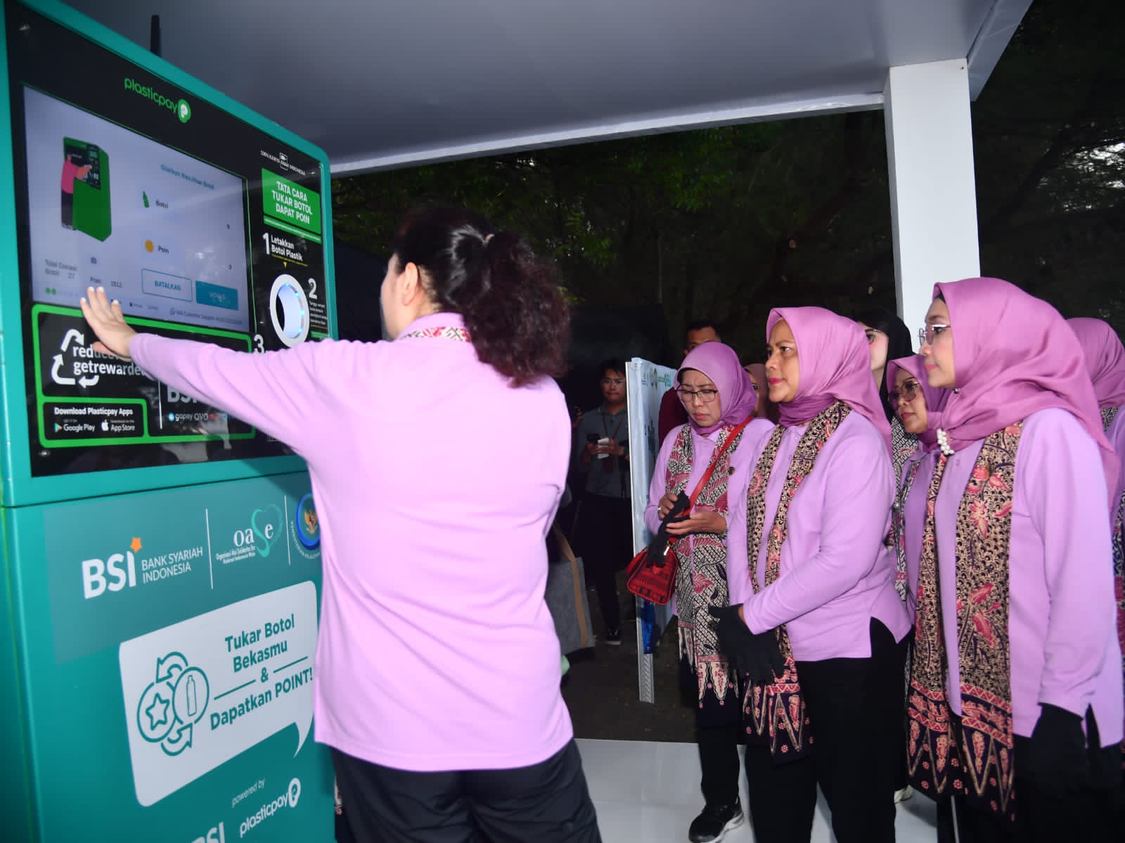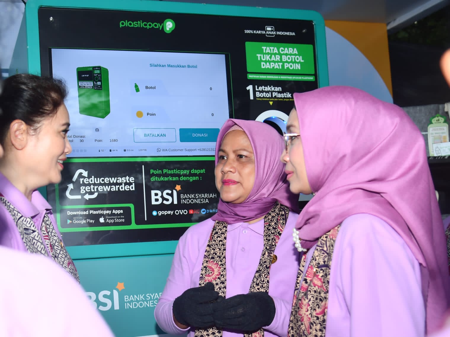 BSI berkolaborasi dengan Kementerian Kelautan dan Perikanan dalam gerakan Oase KIM (Oase Kabinet Indonesia Maju) untuk menggencarkan edukasi pengelolaan sampah, transplantasi karang, aksi bersih pantai, ATM sampah dan kegiatan konservasi penyu. Oleh karena itu, BSI gencar melakukan kolaborasi untuk dapat mengubah sampah botol plastik menjadi barang tepat guna. Foto : BPMI Setpres