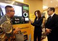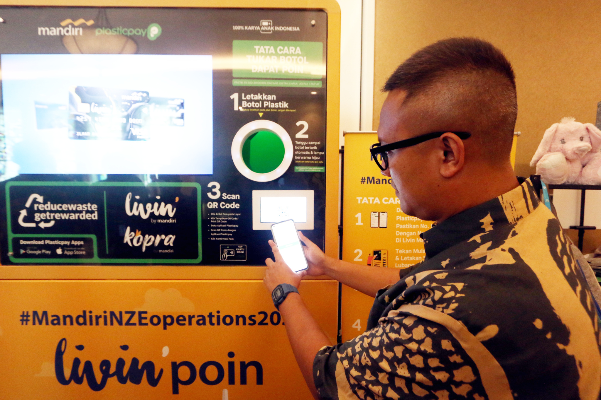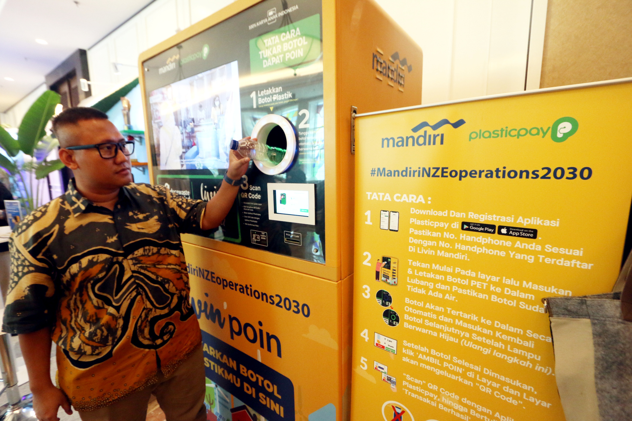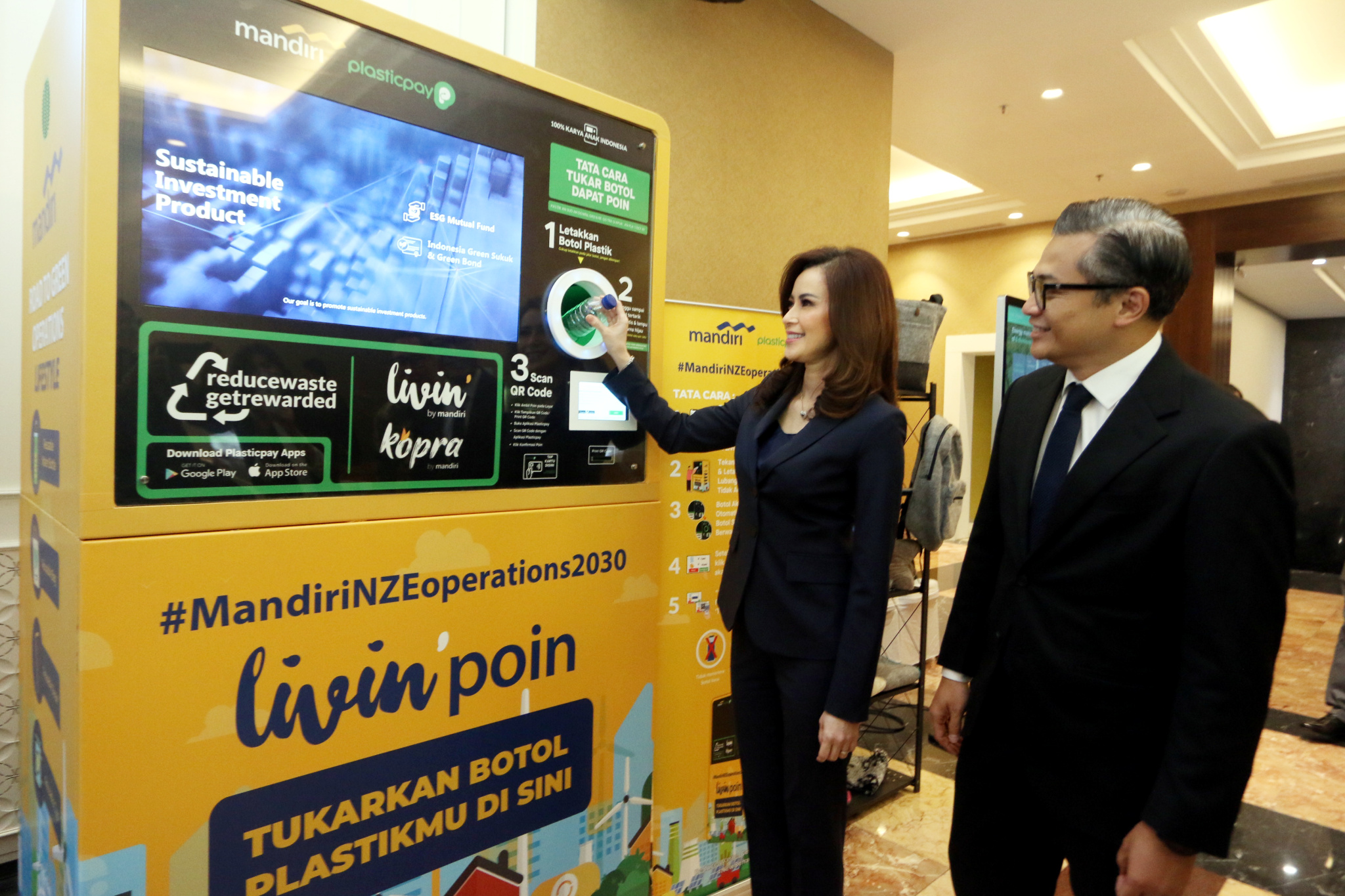 (Kiri – kanan) Wakil Direktur Utama Bank Mandiri Alexandra Askandar dan Kepala Ekonom Bank Mandiri Andry Asmoro saat memasukkan botol ke mesin daur ulang botol Plastik di sela perhelatan Mandiri Sustainability Forum di Jakarta, Kamis (7/12). Sebagai salah satu inisiatif penerapan prinsip Environmental Social Governance (ESG), Bank Mandiri mengandeng startup Plasticpay menempatkan empat unit reverse vending machine untuk mendaur ulang botol plastik bekas, yang disebar di empat gedung utama Bank Mandiri di Jakarta. Untuk mensosialisasikan pemanfaatan mesin ini, setiap penukaran satu botol plastik tersebut akan ditukar dengan satu Livin’poin yang dapat dimanfaatkan oleh nasabah untuk mendapatkan hadiah menarik dan juga diskon belanja di berbagai merchant yang bekerjasama.