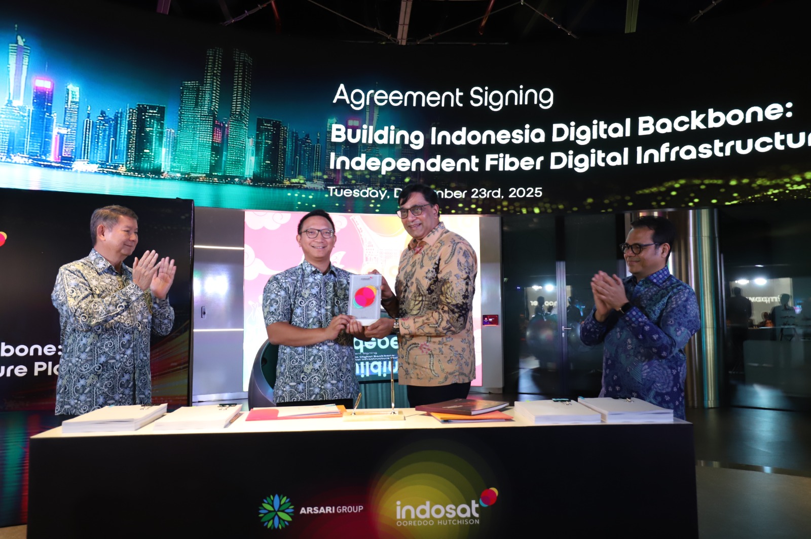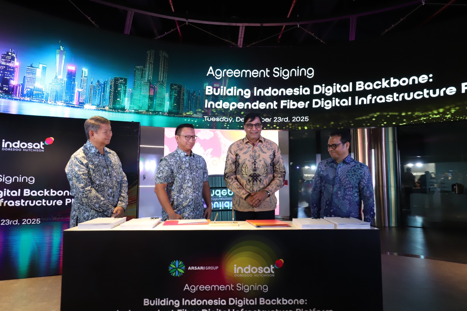 *(ki-ka)* : Hashim S. Djojohadikusumo Founder & CEO Arsari Group, Aryo P.S. Djojohadikusumo Deputy CEO & COO Arsari Group, Vikram Sinha President Director & CEO Indosat dan Nezar Patria Komisaris Utama Indosat usai penandatanganan perjanjian investasi pembentukan perusahaan patungan (joint venture) untuk membangun sebuah platform serat optik digital terkemuka di Indonesia (“FiberCo”) yang berlangsung hari ini, Selasa (23/12) di Jakarta. Indosat Ooredoo Hutchison (Indosat atau IOH) bersama konsorsium yang terdiri dari Arsari Group dan Northstar Group (“Konsorsium”) menandatangani perjanjian investasi pembentukan perusahaan patungan (joint venture) untuk membangun sebuah platform serat optik digital terkemuka di Indonesia (“FiberCo”). Kemitraan strategis ini menjadi tonggak penting dalam upaya bersama memperkuat tulang punggung digital nasional, di saat ekosistem digital Indonesia tengah memasuki fase pertumbuhan yang krusial. Melalui kemitraan ini, seluruh pihak menegaskan komitmen bersama untuk memperkuat konektivitas nasional, menghadirkan layanan digital berstandar global, serta mendukung percepatan transformasi digital Indonesia secara berkelanjutan.
