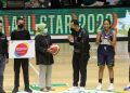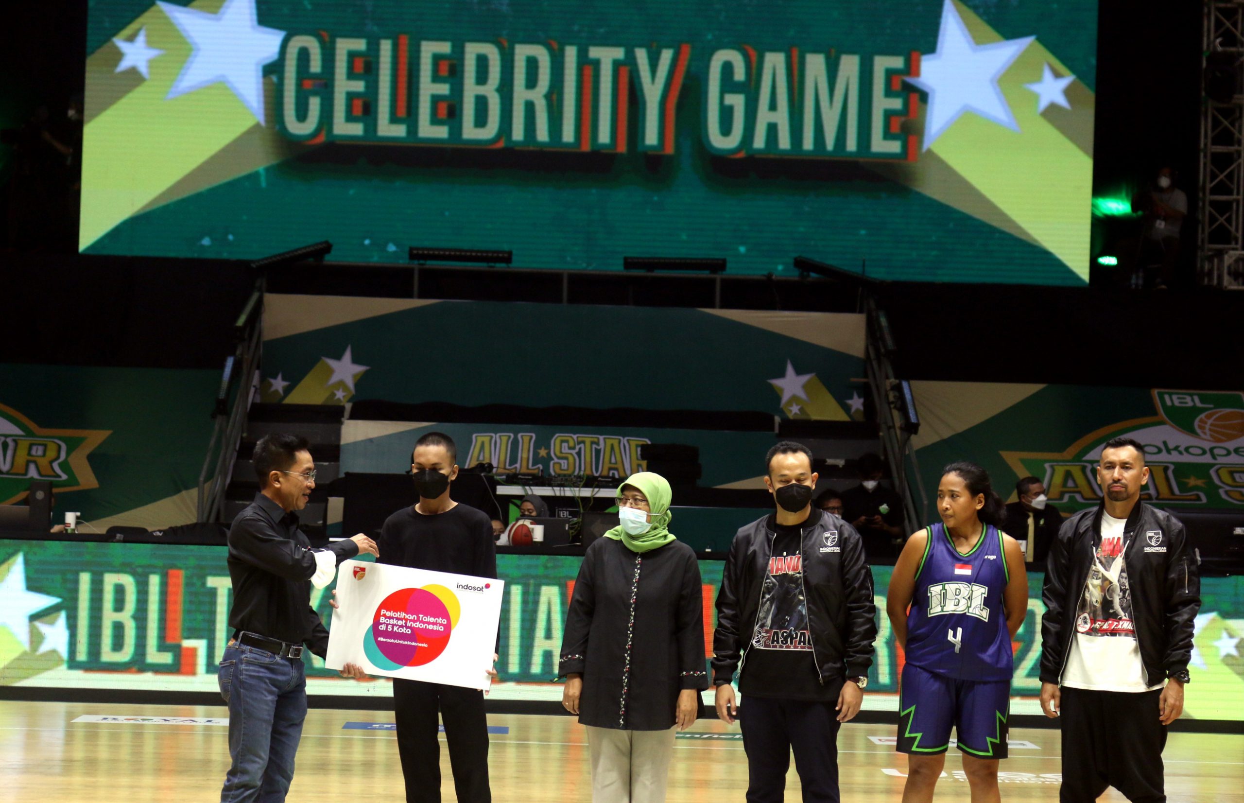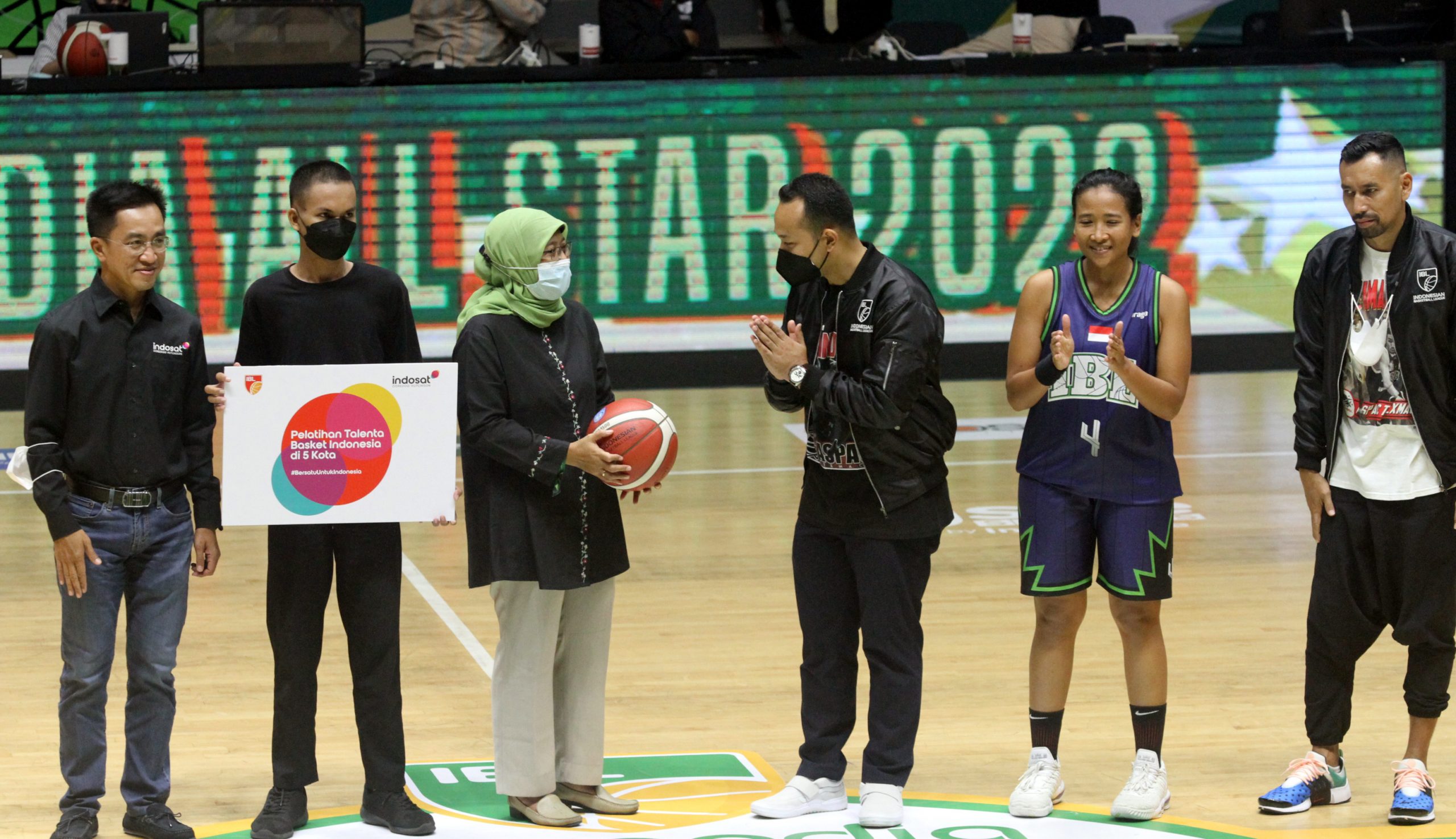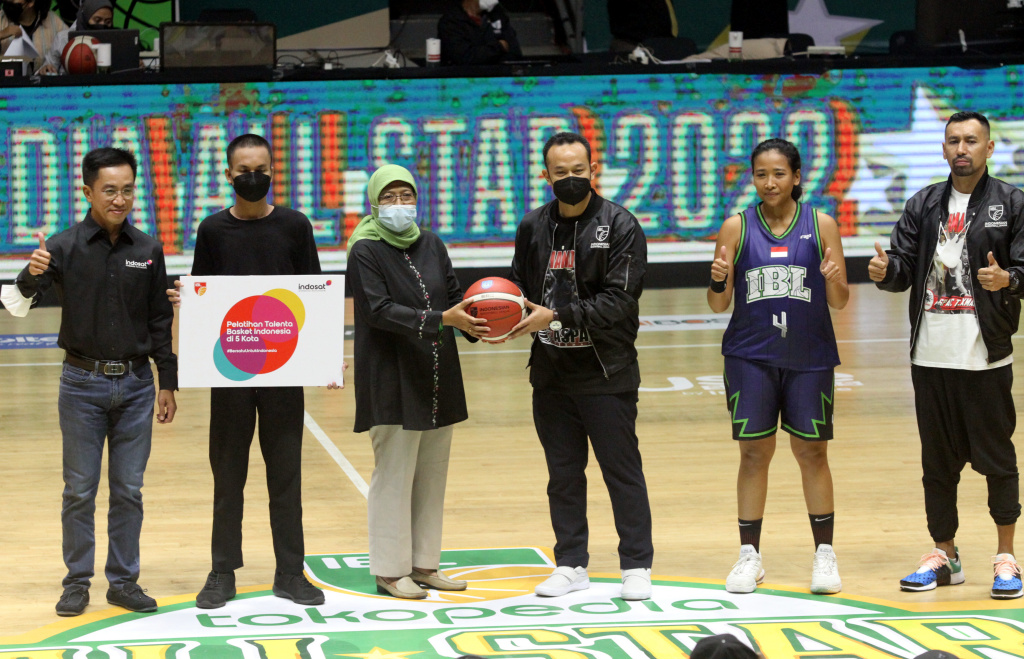 Director & Chief Human Resources Indosat Ooredoo Hutchison Irsyad Sahroni (kiri) secara simbolis menyerahkan bantuan kepada Kapten Tim Basket SMKN 53 Jakarta Barat Rahmat Hidayat (kedua kiri) disaksikan Wakil Kepala Sekolah Kesiswaan SMKN 53 Jakarta Barat Nuzulurrofiah (ketiga kanan) dan Direktur Utama Indonesian Basketball League/IBL Junas Miradiarsyah (kedua kanan) saat meluncurkan program pelatihan talenta basket ke Sekolah saat IBL All Star 2022 di Hall Basket Senayan, Jakarta, Kamis (31/3/2022). Indosat Ooredoo Hutchison (IOH) meluncurkan program pelatihan talenta basket ke sekolah yang bertujuan untuk pemberdayaan generasi muda dan talenta olahraga terbaik Indonesia dibidang bola basket.