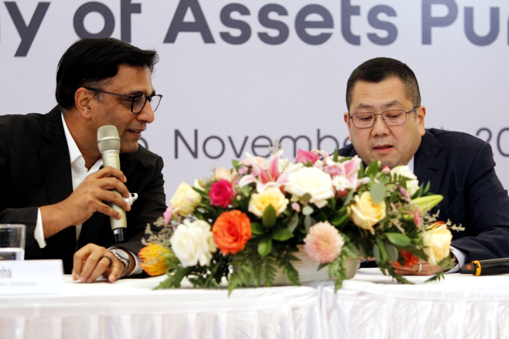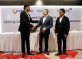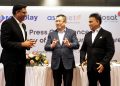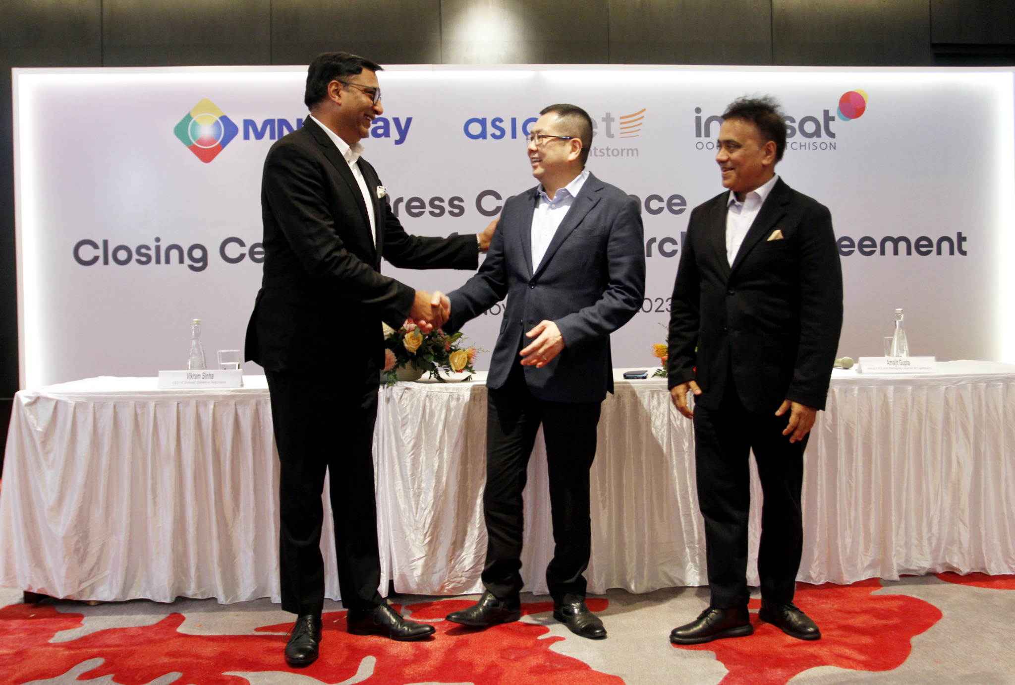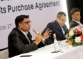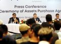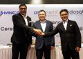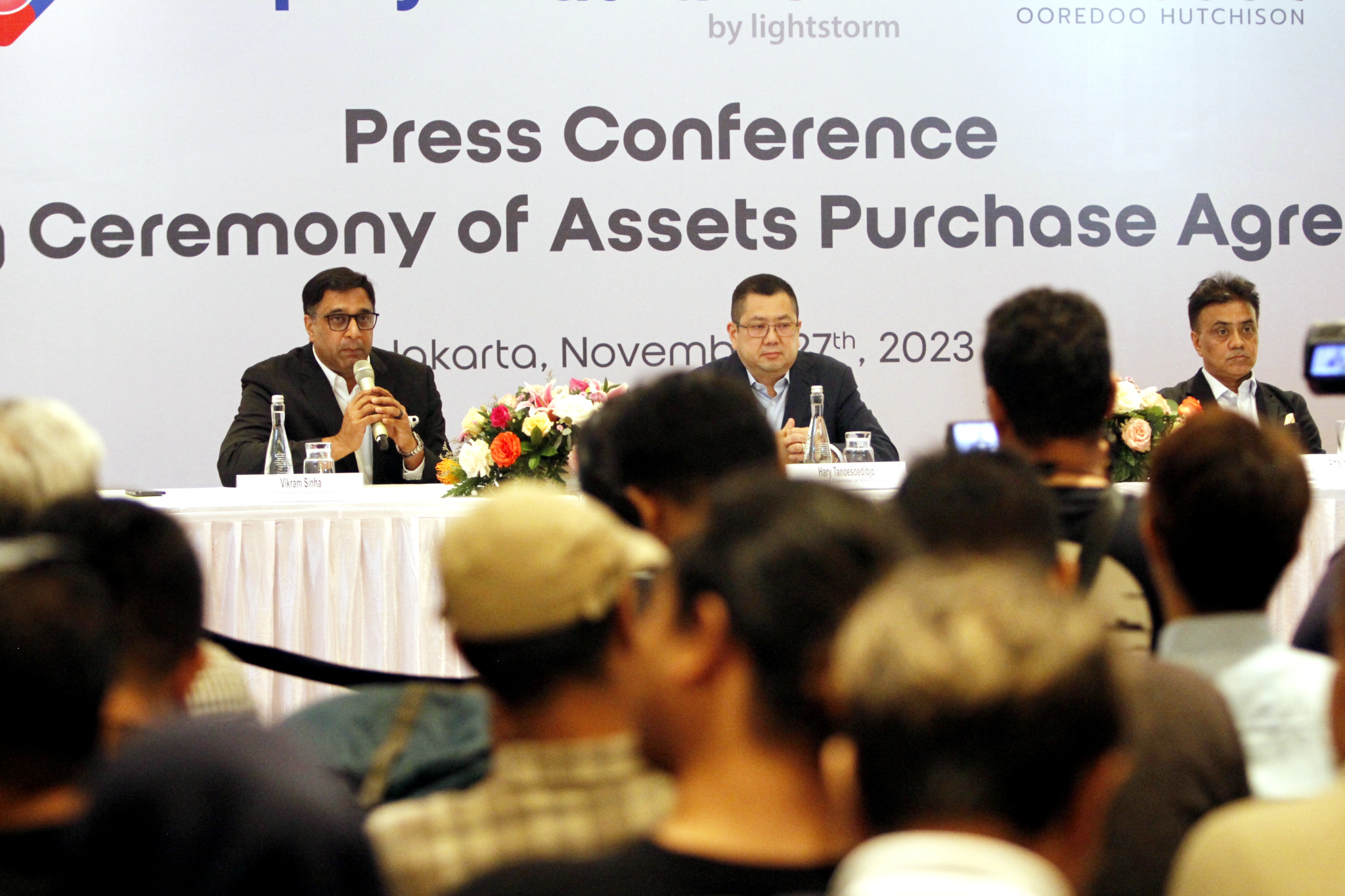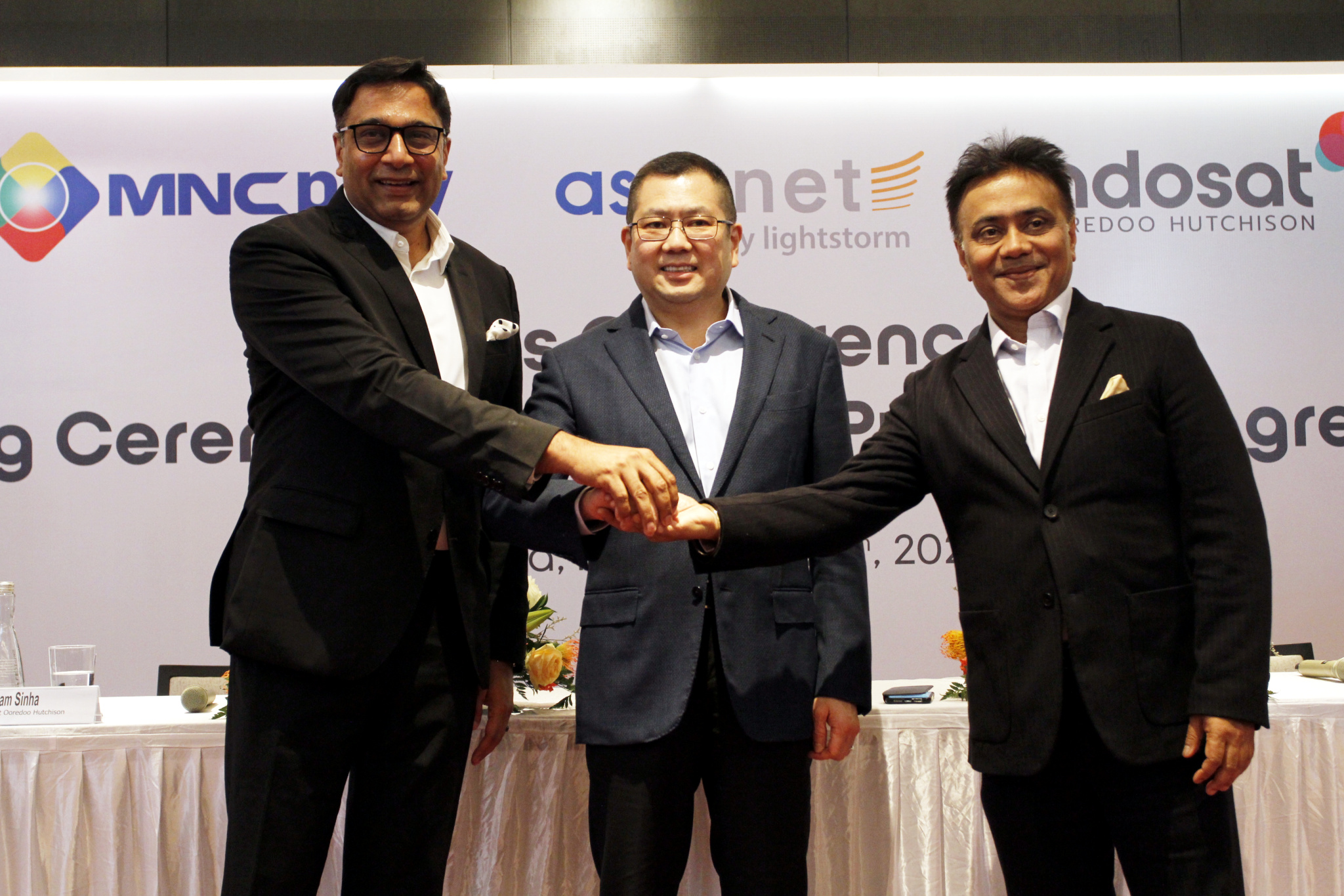 (ki-ka) President Director & CEO IOH Vikram Sinha, Executive Chairman MNC Group Hary Tanoesoedibjo, CEO & Managing Director Lightstorm Group Amajit Gupta saat Konferensi Pers yang diadakan di Jakarta, Senin (27/11). Indosat Ooredoo Hutchison (Indosat atau IOH) mengumumkan kesuksesan kolaborasi dengan Asianet (Lightstorm group company) dan PT MNC Kabel Mediacom (MNC Play) dalam menghadirkan pengalaman digital kelas dunia kepada para pelanggan.