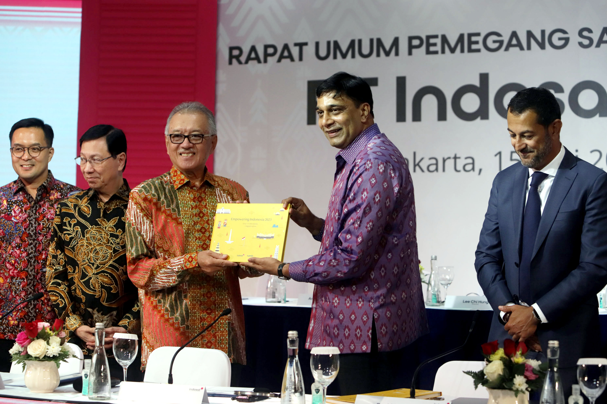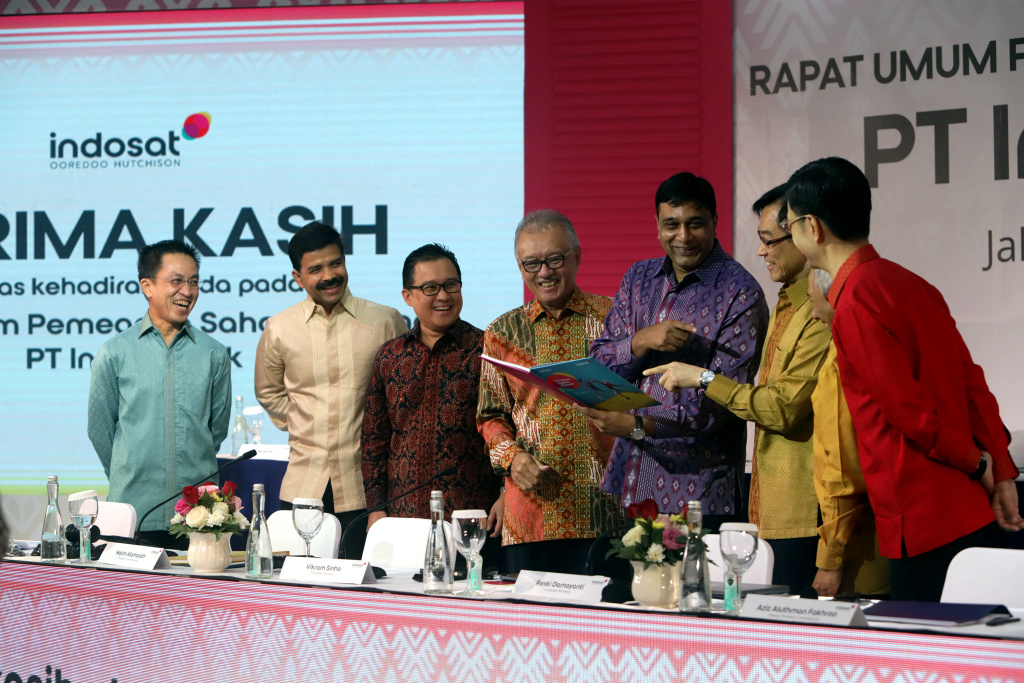(ki-ka) Direktur Irsyad Sahroni, Direktur Ritesh Singh, Direktur Ahmad Zulfikar, Direktur Utama Vikram Sinha, Direktur Desmond Cheung, Direktur Muhammad Buldansyah dan Direktur Nicky Lee Chi Hung saat RUPST PT Indosat Tbk yang diadakan di Jakarta hari ini, Senin (15/05). Indosat Ooredoo Hutchison (Indosat atau Perseroan, IDX: ISAT)