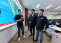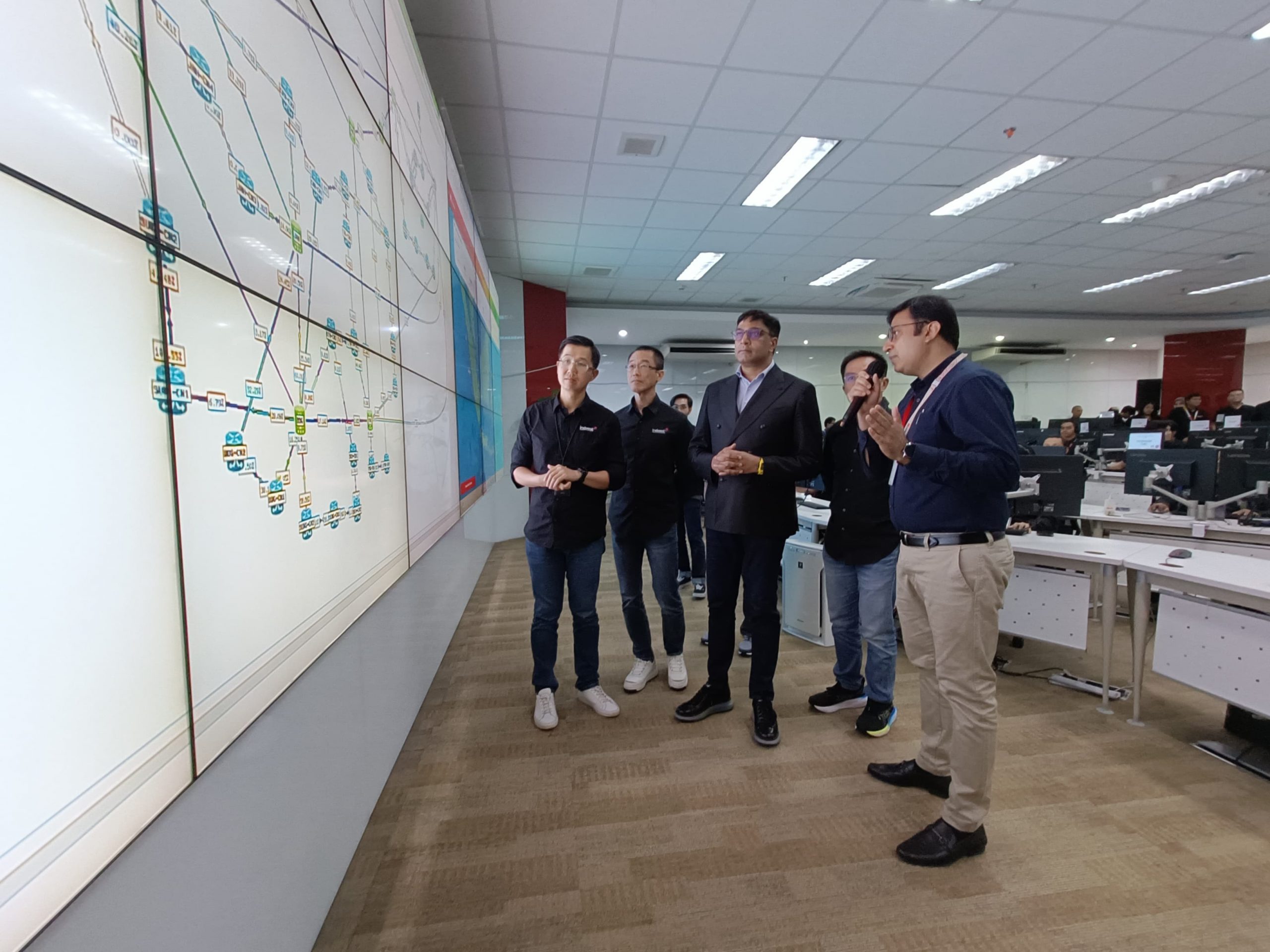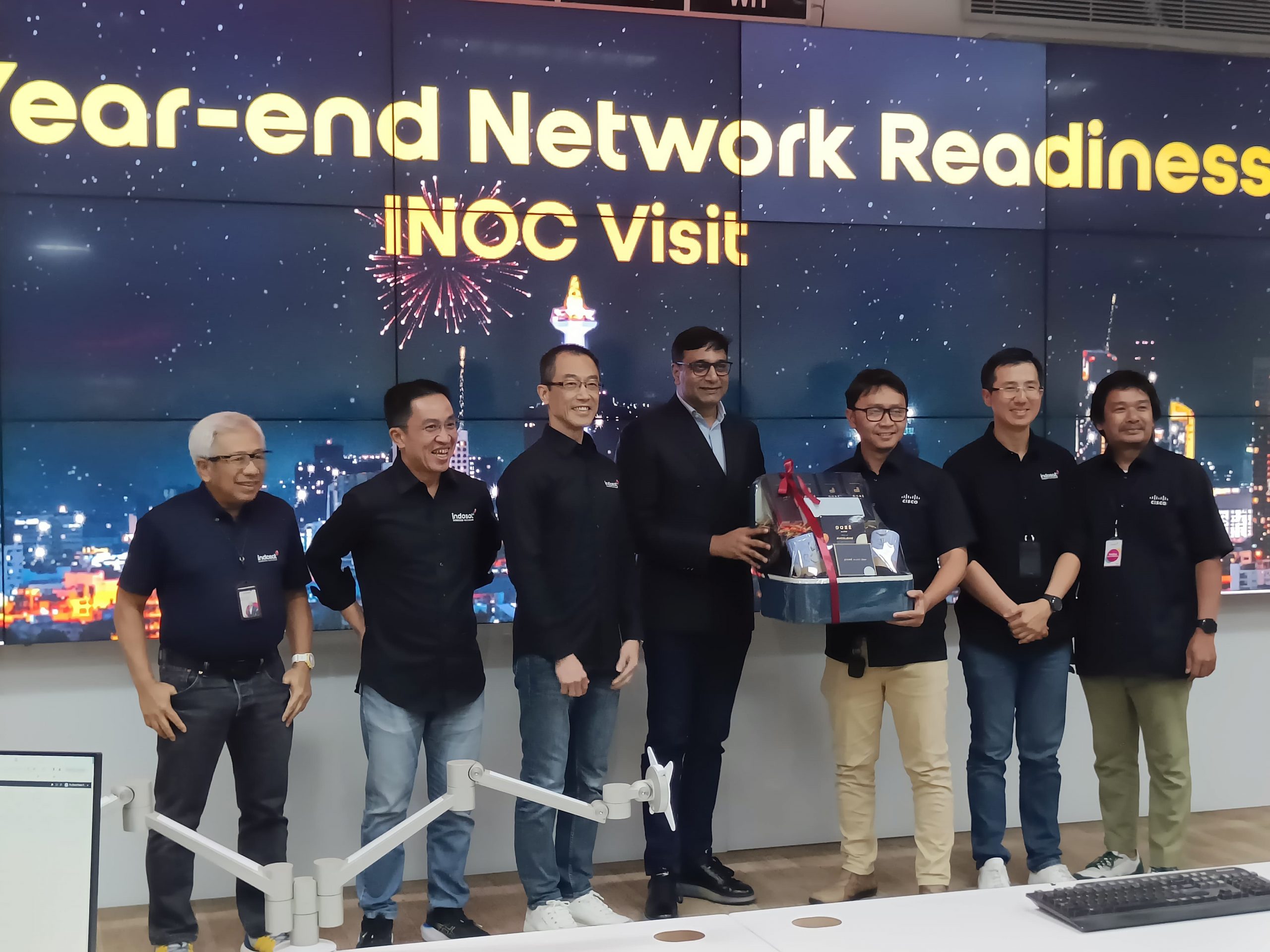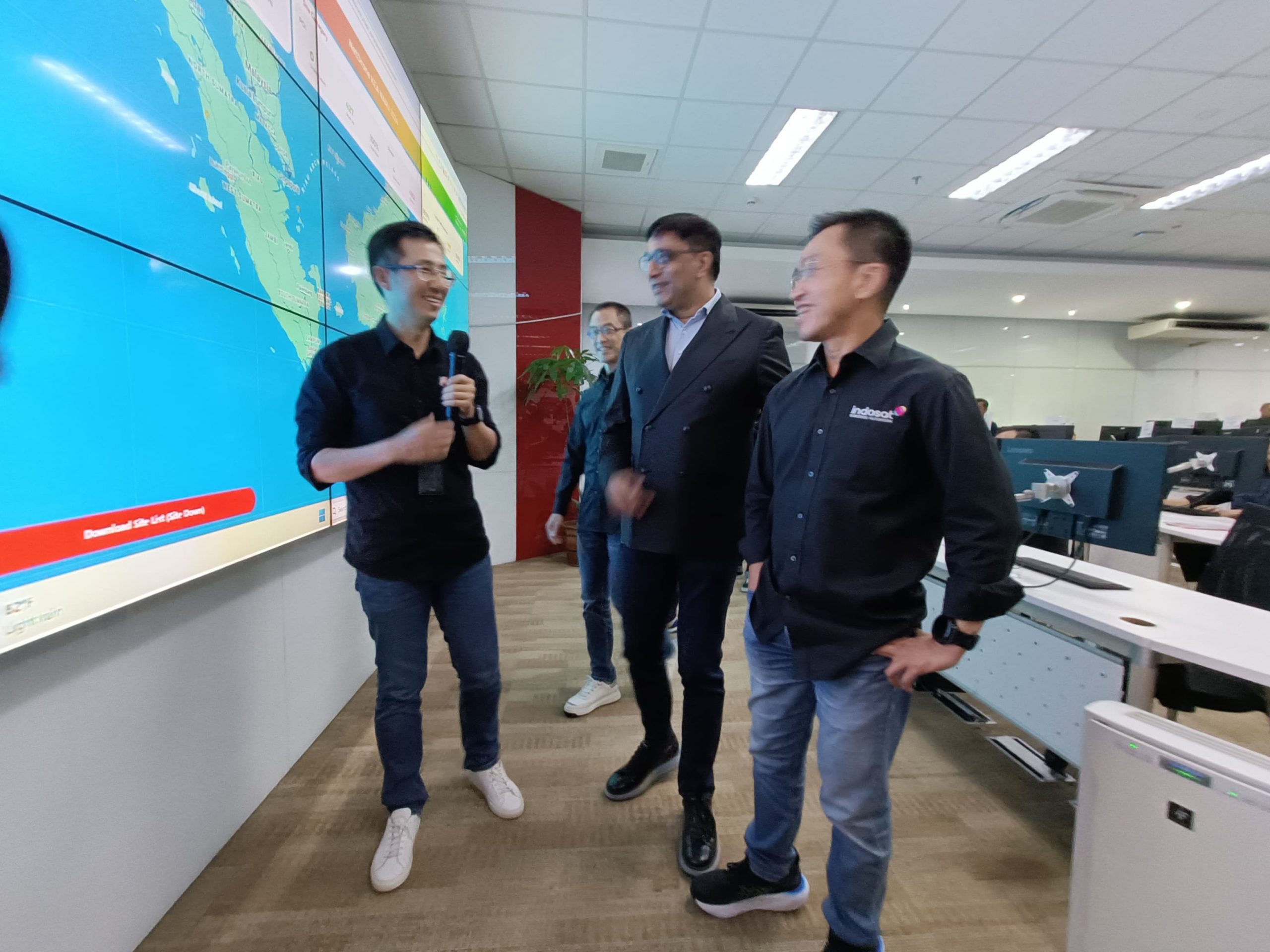 President Director and Chief Executive Officer Indosat Ooredoo Hutchison, Vikram Sinha (ketiga dari kiri) bersama jajaran Direksi dan Chief meninjau kesiapan jaringan dan layanan jelang tahun baru 2024 di Indosat Network Operation Center (INOC) di Jakarta, Jumat (29/12).