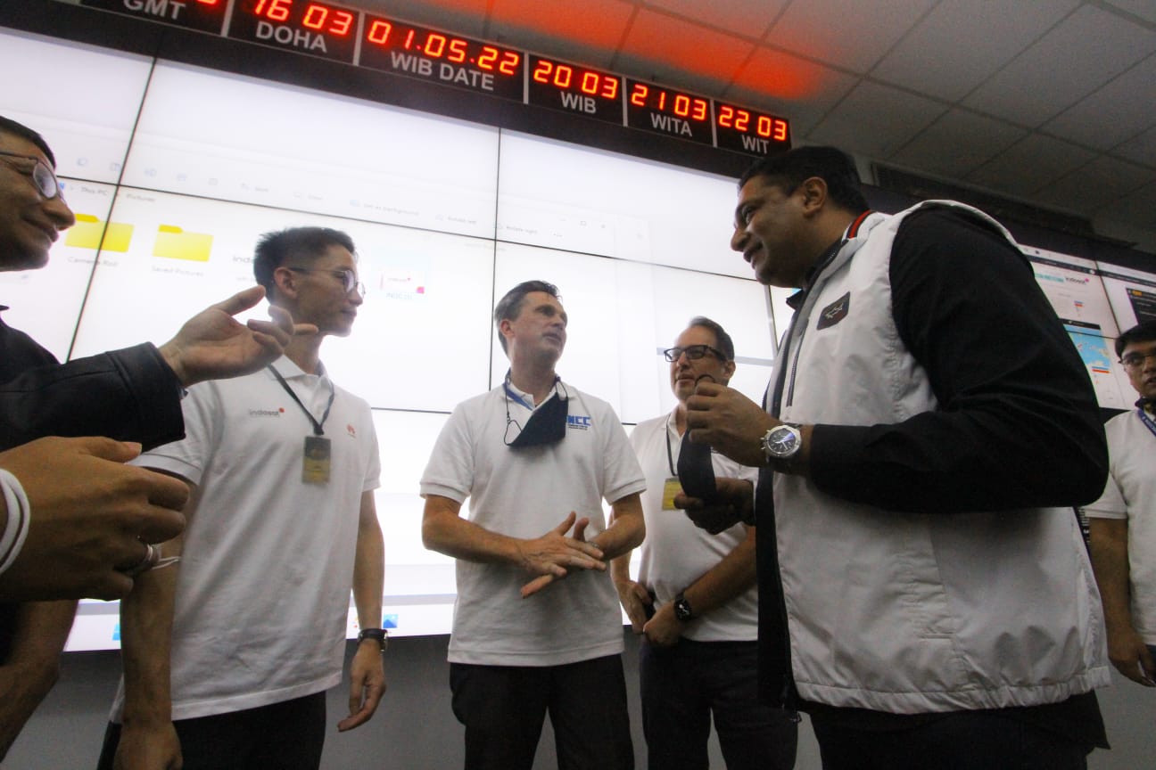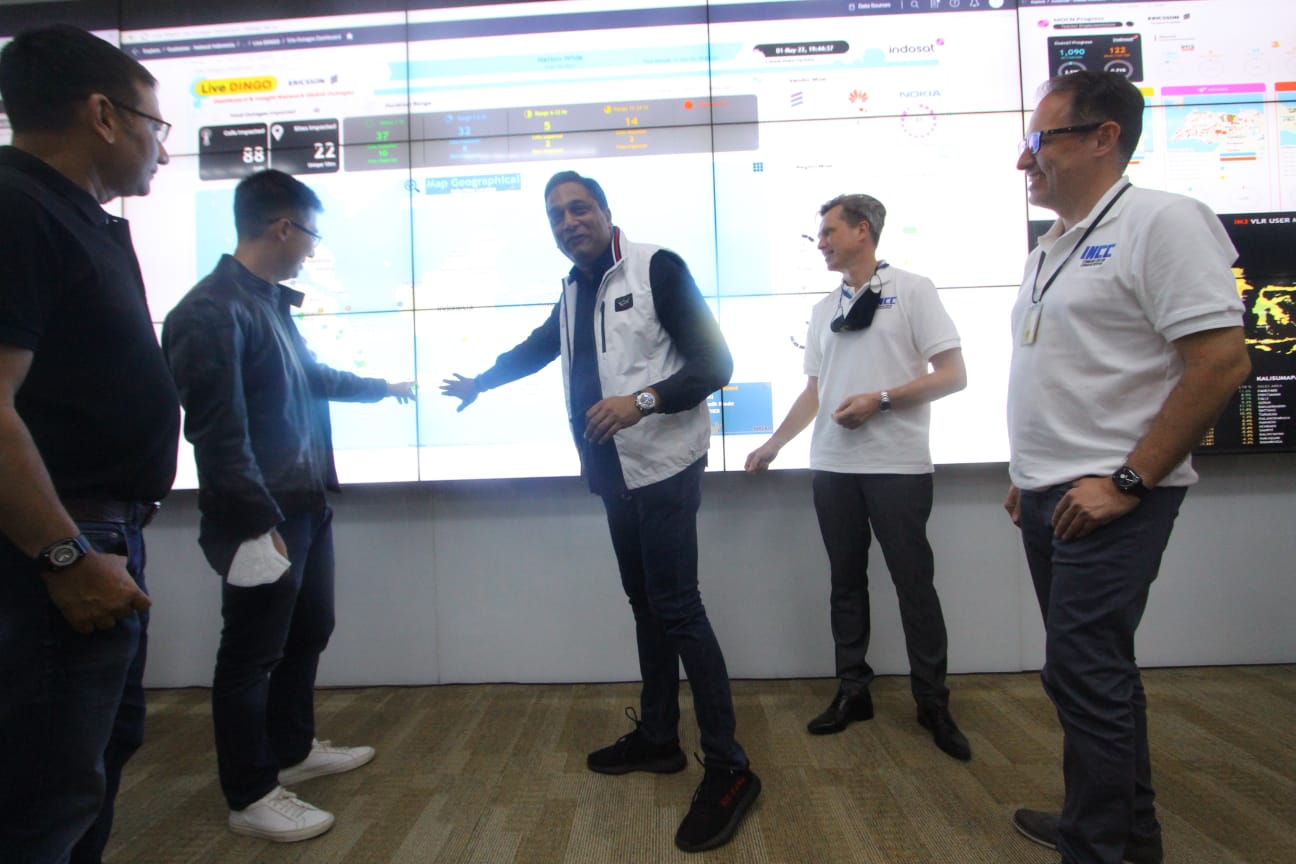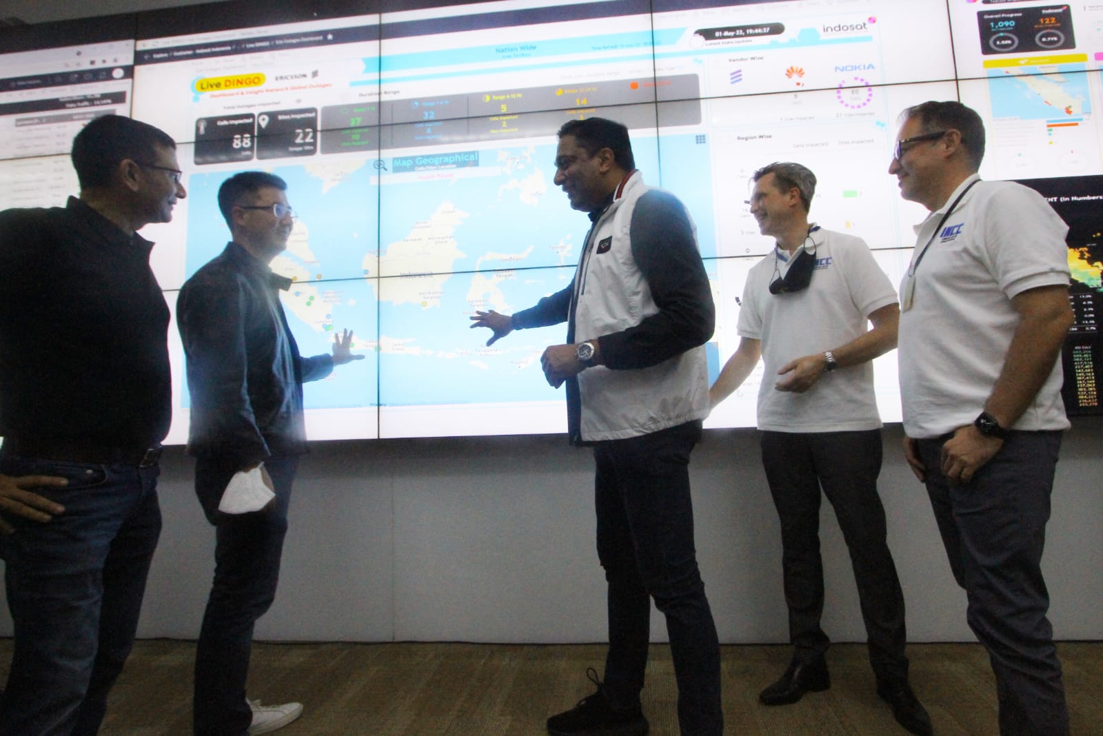 President Director & CEO IOH, Vikram Sinha (tiga dari kanan), Chief Digital Officer IOH, Sanjeev Rawat (kiri) dan SVP-Head of Network Operations IOH, Agus Sulistio, saat meninjau IOH Network Operation Center (INOC) di Kantor Pusat Indosat Ooredoo Hutchison Jakarta (1/5). Komitmen memberikan pengalaman telekomunikasi digital terbaik bagi pelanggan, khususnya di masa libur lebaran tahun ini, IOH mengaktifkan command center fisik terpusat sejak H-3 lebaran. Dengan dukungan lebih dari 2.000 petugas teknis yang bersiaga sepanjang waktu, tim IOH Network Operation Center (INOC) dan IOH Service Operation Center (ISOC) akan memantau ketersediaan dan kualitas jaringan secara nasional selama 24/7. Layanan pelanggan melalui berbagai saluran juga disiagakan untuk memberikan dukungan atas kendala yang mungkin dialami pelanggan selama masa liburan.