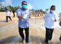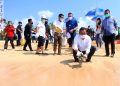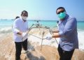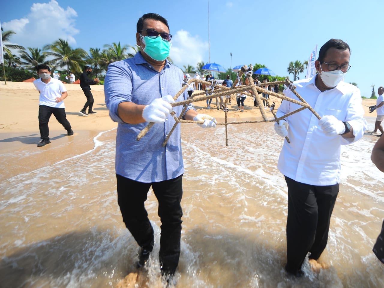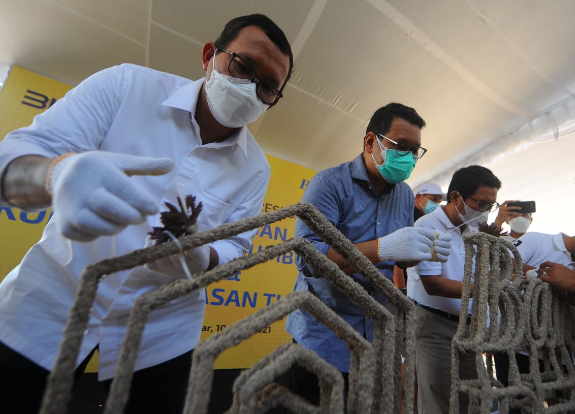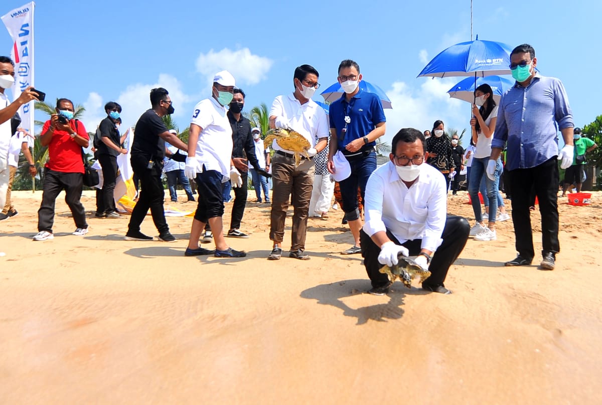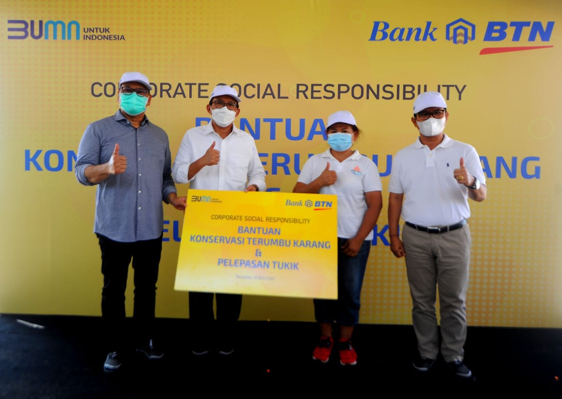Direktur Utama PT Bank Tabungan Negara (Persero) Tbk. Haru Koesmahargyo (kedua kiri) bersama Anggota Komisi XI DPR RI Eriko Sotarduga (kiri) Direktur Nusa Dua Reef Foundation Pariama Hutasoit, dan Sekda Kabupaten Badung I Wayan Adi Arnawa (kanan) melakukan prosesi pelepasan tukik usai sebelumnya di tempat yang sama dilakukan kegiatan perangkaian terumbu karang di pantai Nusa Dua, Denpasar Sabtu (10/4). Sebagai bentuk komitmen perusahaan dalam menjaga kelestarian lingkungan hidup, Bank BTN memberikan bantuan sosial (Corporate Social Responsibility) untuk mendukung program konservasi terumbu karang dengan pengembangan 710 terumbu karang dan melepas 7.100 tukik di pesisir pantai Nusa Dua Bali.