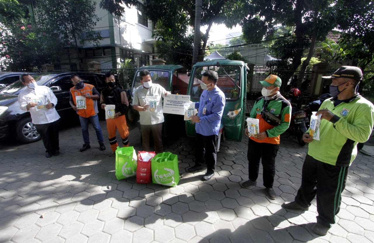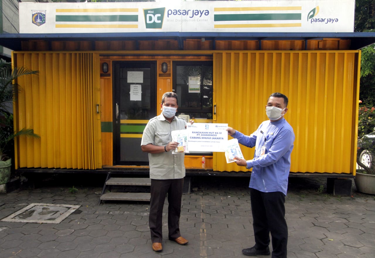 Pemimpin Cabang Khusus Jakarta PT Jamkrindo Dwi Priambodo (kiri) menyerahkan Bantuan alat kesehatan kepada Wakil Camat Setia Budi Jan H Oslan di Jakarta, Jumat (25/6). Menyambut Hari Ulang Tahun ke 51 PT Jamkrindo melalui kegiatan peduli Kesehatan membagikan 5.100 paket kesehatan berupa vitamin, masker dan hand sanitizer kepada masyarakat secara serentak pada Jumat, 25 Juni 2021. Harapannya, pemberian bantuan ini bisa membantu masyarakat mencegah penyebaran Covid-19.