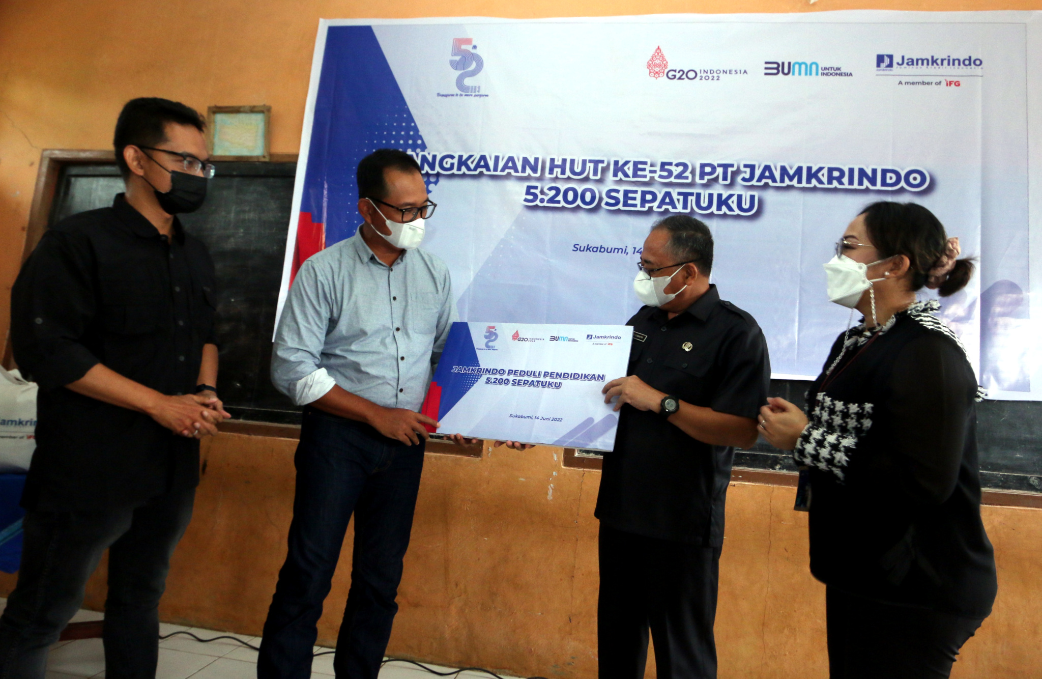 Pemimpin Wilayah IV Bandung PT Jamkrindo M Kisworo (kedua kiri) bersama Pimpinan Cabang Sukabumi PT Jamkrindo Prita Widy Wardani (kanan), Kepala Bagian bHumas PT Jamkrindo Agustinus Handoko (kiri) menyerahkan bantuan secara simbolis sepatu sekolah kepada Wakil Bupati Sukabumi Iyos Somantri, di SDN Singaparna, kecamatan Nyalindung, Kabupaten Sukabumi, Selasa (14/6/2022). Dalam rangka peringatan hari ulang tahun ke-52, PT Jamkrindo mulai mendistribusikan bantuan 5.200 pasang sepatu untuk anak sekolah di berbagai wilayah di Indonesia. Hal ini dilakukan oleh Jamkrindo untuk mewujudkan kontribusinya di sektor pendidikan.