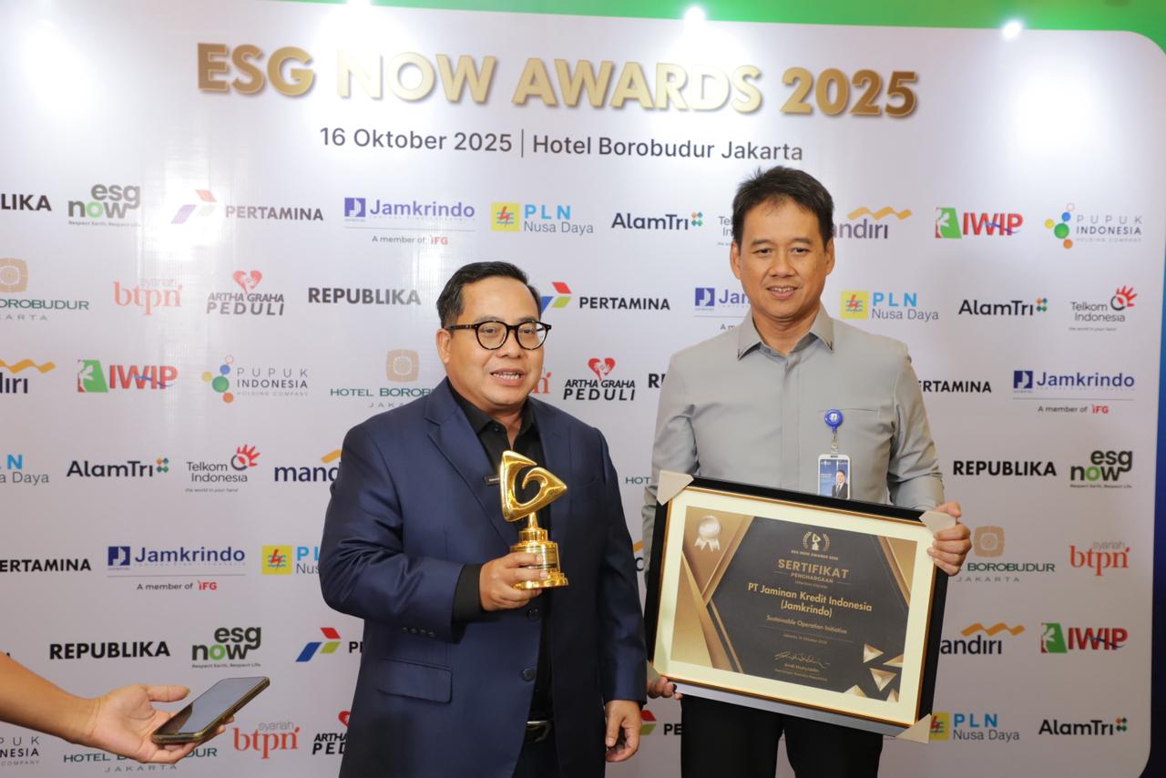 Penghargaan dari Republika tersebut diterima oleh Plt Direktur Utama Jamkrindo Abdul Bari di Jakarta, Kamis (16/10/2025). Hadir juga dalam kegiatan tersebut Direktur MSDM, Umum, dan Manajemen Risiko Jamkrindo Ivan Soeparno. ESG Now Awards 2025 dilaksanakan untuk memberikan penghargaan bagi perusahaan, komunitas, dan institusi yang menunjukkan komitmen serta praktik terbaik dalam penerapan prinsip Environmental, Social, and Governance (ESG). Acara ini bertujuan mendorong pertumbuhan ekonomi berkelanjutan sekaligus mendukung pencapaian Sustainable Development Goals (SDGs) Indonesia. Hadir dalam penghargaan tersebut antara lain Menteri Koordinator Bidang Pangan Zulkifli Hasan, Menteri Komunikasi dan Digital Meutya Viada Hafid, Wakil Ketua MPR Eddy Soeparno, Wakil Menteri Sosial Agus Jabo Priyono, dan Wakil Kepala Badan Pengaturan BUMN Tedi Bharata.