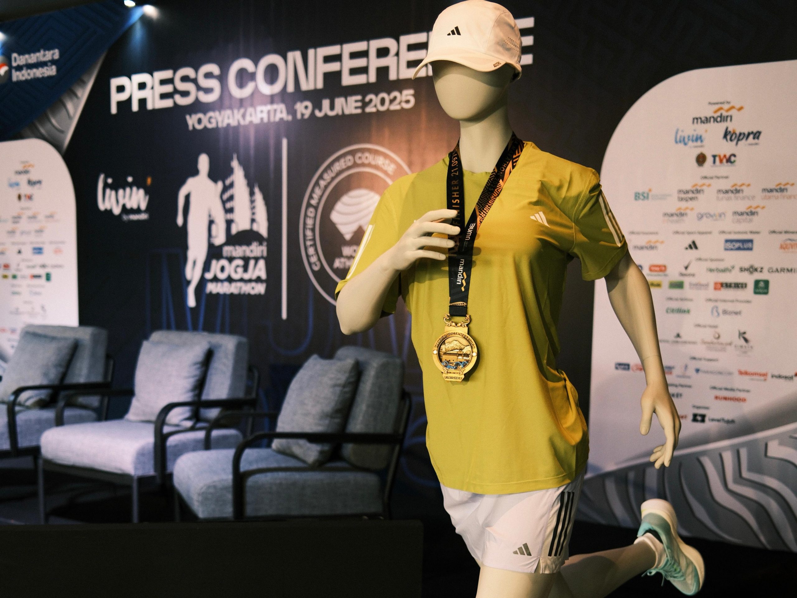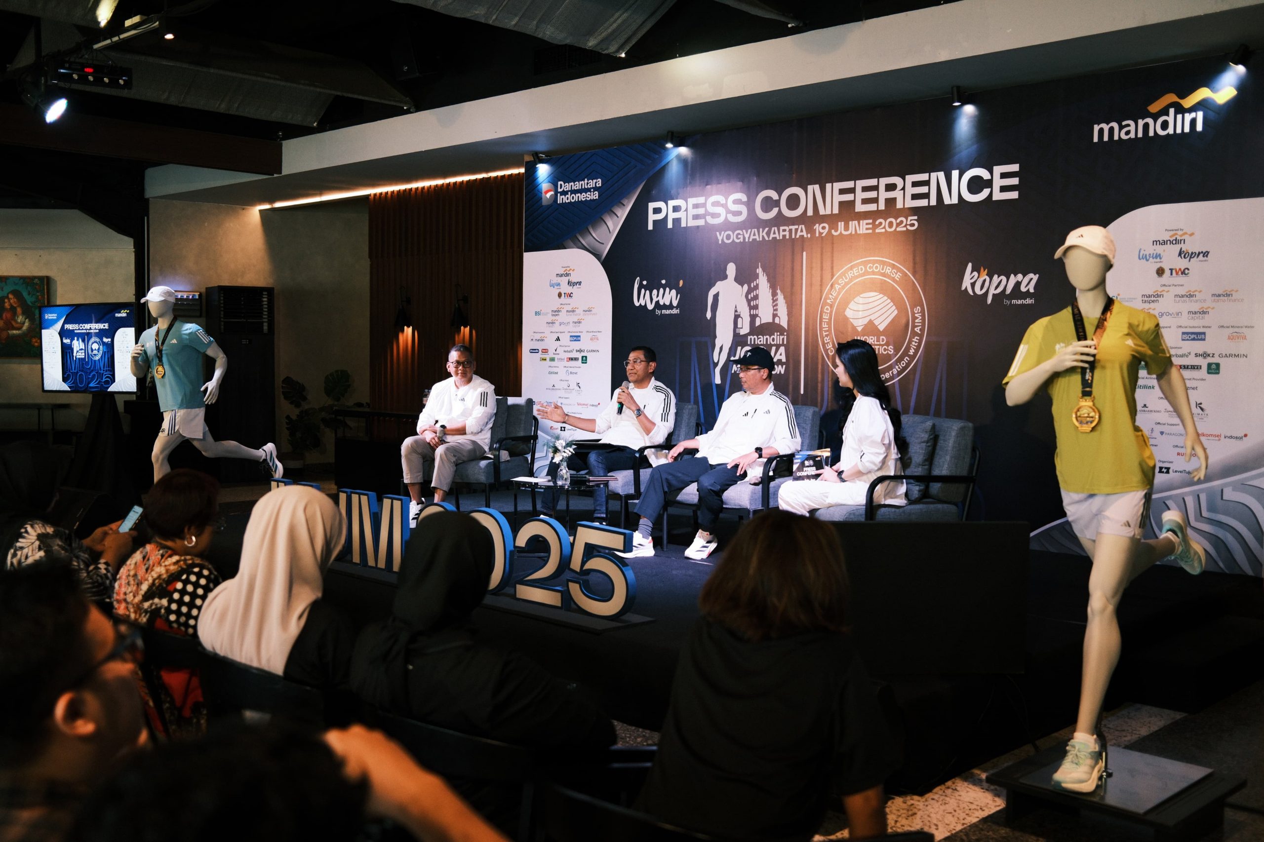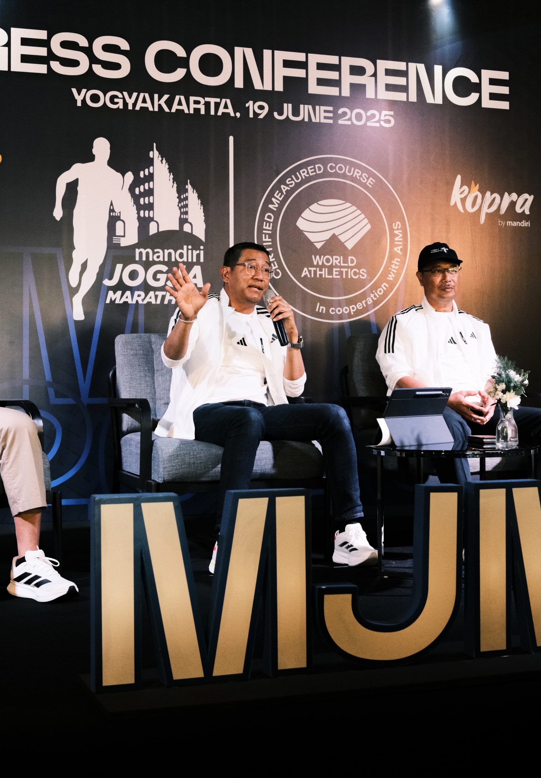 (Ki-Ka) Race Director Mandiri Jogja Marathon (MJM) 2025 Pandu Bagus Buntaran, dan Senior EVP Corporate Relations Bank Mandiri M. Wisnu Trihanggodo bersama Kepala Dinas Pariwisata Pemprov DI Yogyakarta Imam Pratanadi, saat berbincang sambil pada konferensi pers penyelenggaraan MJM 2025 di Sleman, Yogyakarta, Kamis (19/6). mengusung tema Accelerate Your Limit, Embrace the Culture”, Mandiri Jogja Marathon 2025 yang akan digelar pada 22 Juni mendatang menjadi salah satu event lari paling ditunggu karena mengombinasikan kompetisi, keindahan alam dan kekayaan budaya lokal. Sebanyak 9.200 pelari dari 17 negara akan ambil bagian dalam event yang diharapkan dapat memperkuat ekosistem sport tourism di Indonesia, mendorong praktik keberlanjutan (ESG), dan menghadirkan nilai tambah bagi perekonomian daerah.