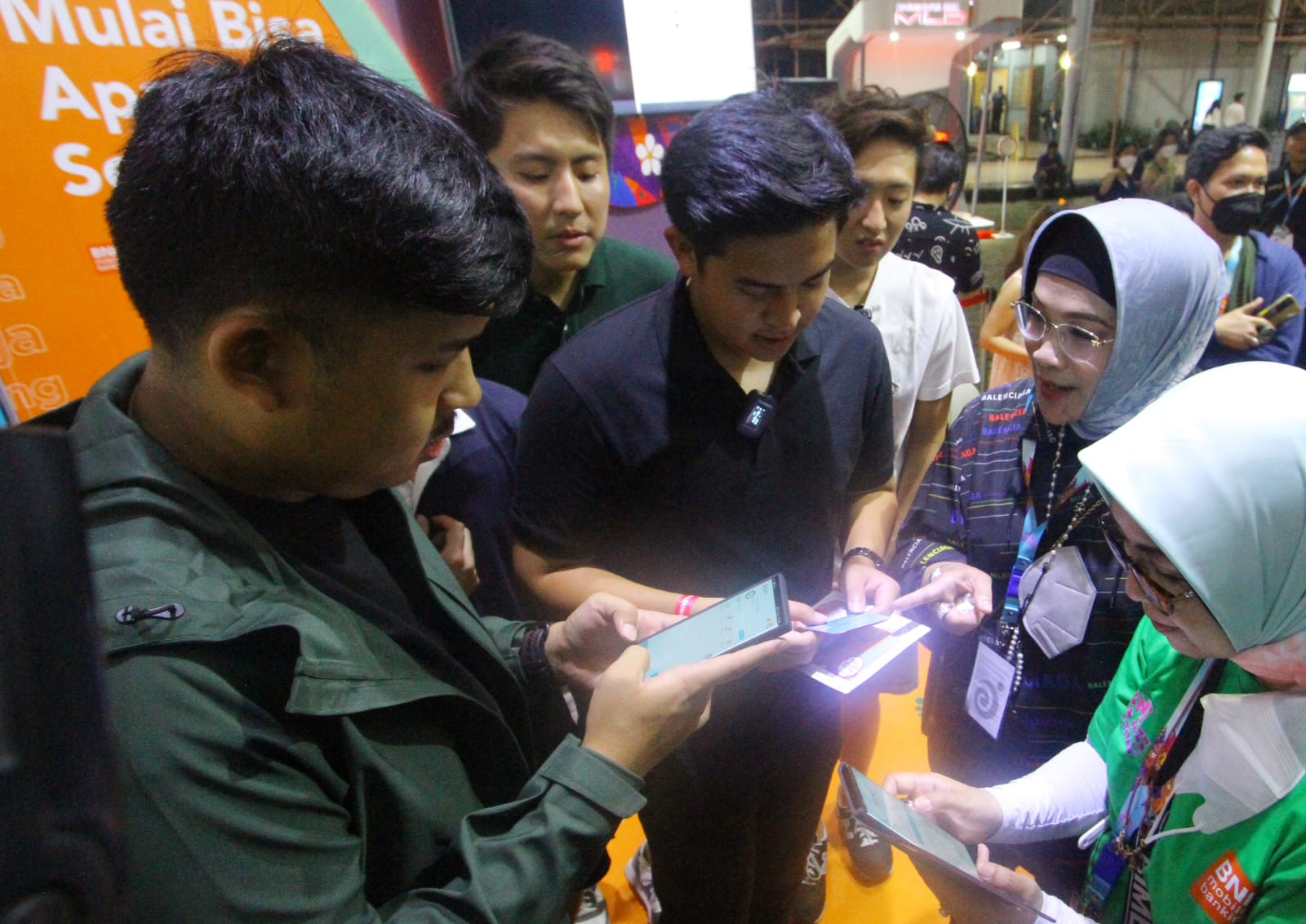 Youtuber Jerome Polin bersama, Wakil Direktur Utama Bank BNI Adi Sulistyowati memperlihatkan kartu uang elektronik TapCash dengan desain khusus foto diri saat hadir di BNI Java Jazz 2022 di JIExpo Kemayoran Jakarta, Minggu (29/5/2022). Jerome Polin dan Wasedaboys mengunjungi BNI launge di arena BNI Java Jazz 2023 dan menikmati berbagai fasilitas yang tersedia salah satunya adalah Virtual reality Metaverase BNI.