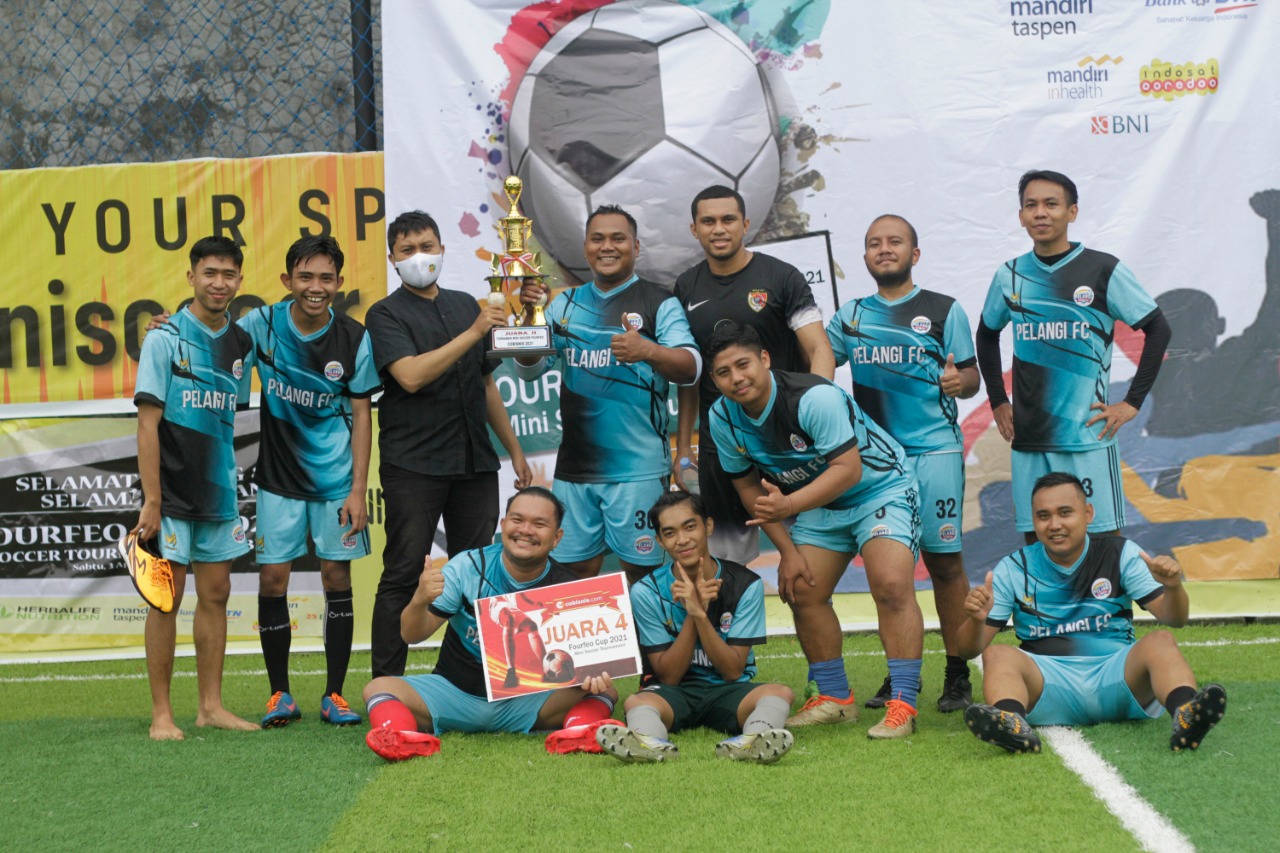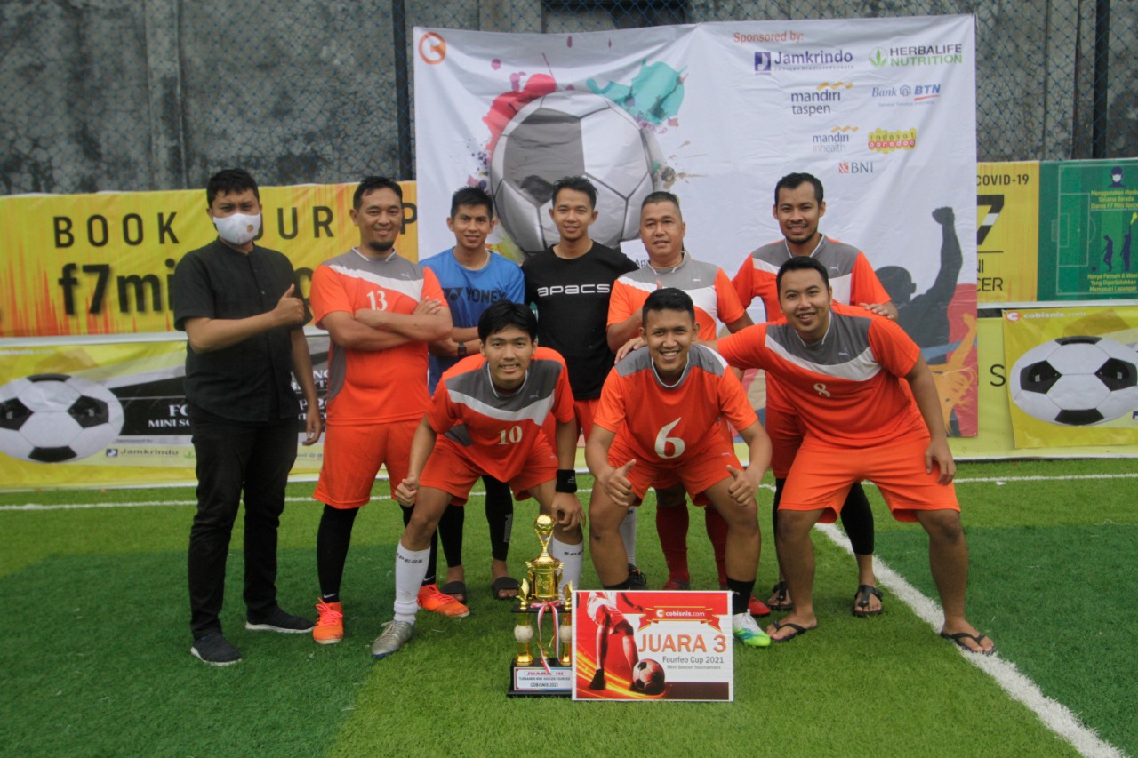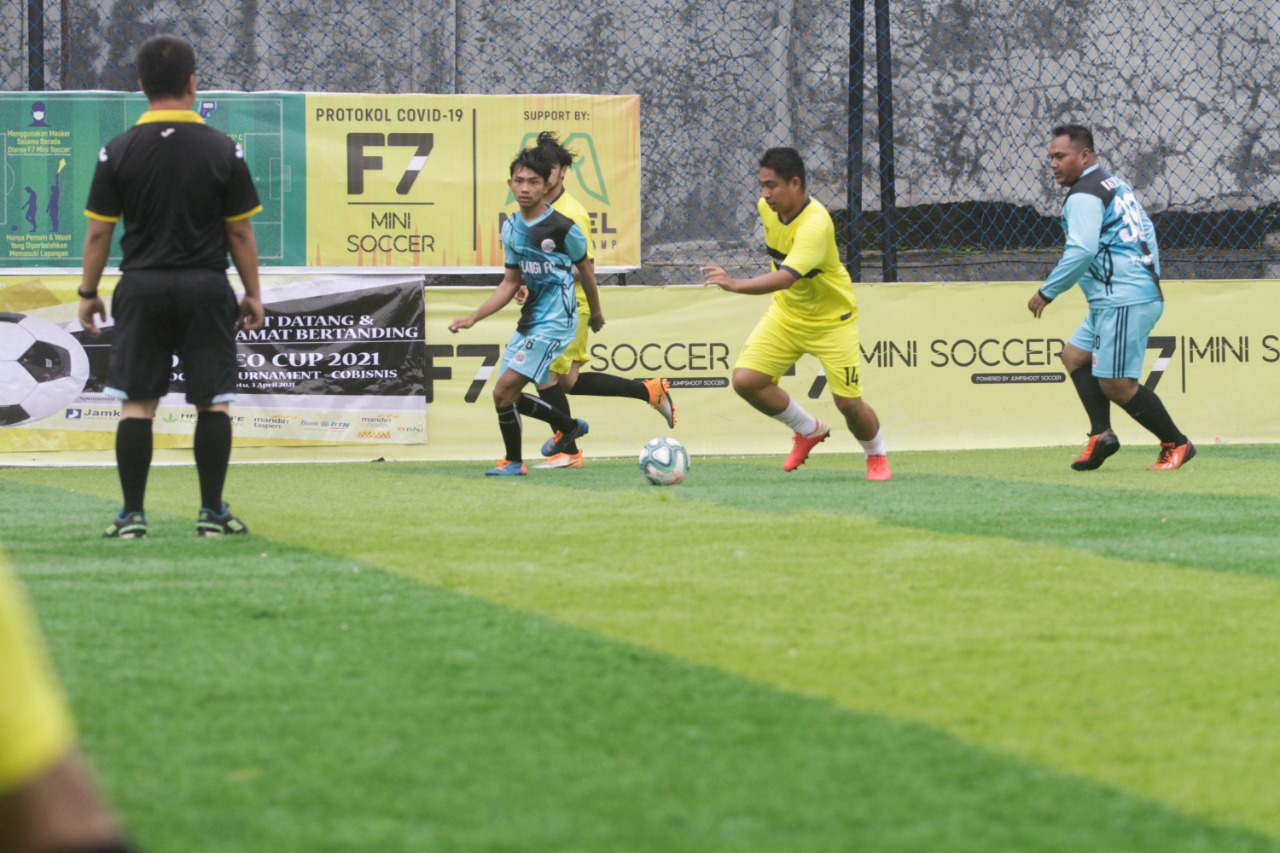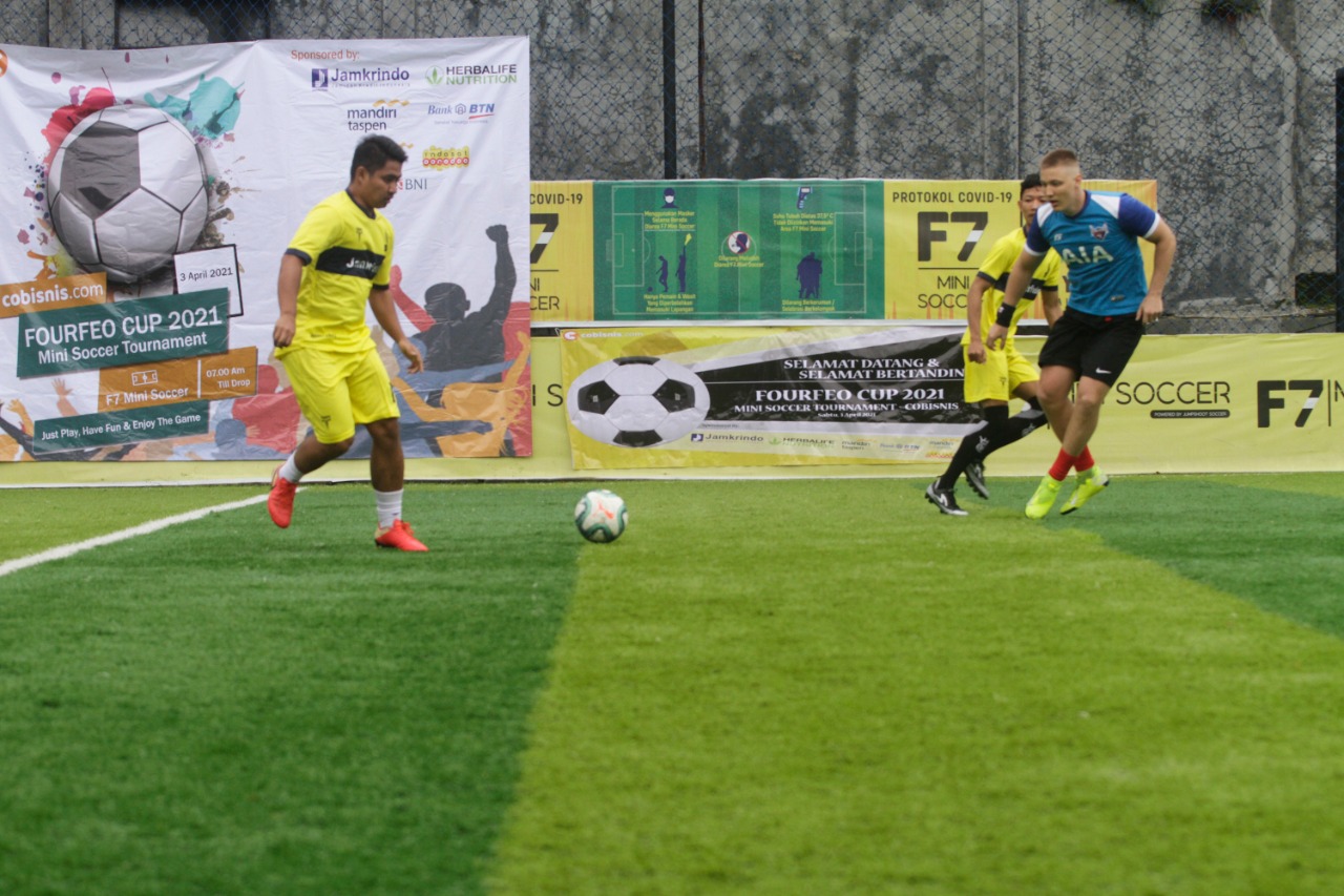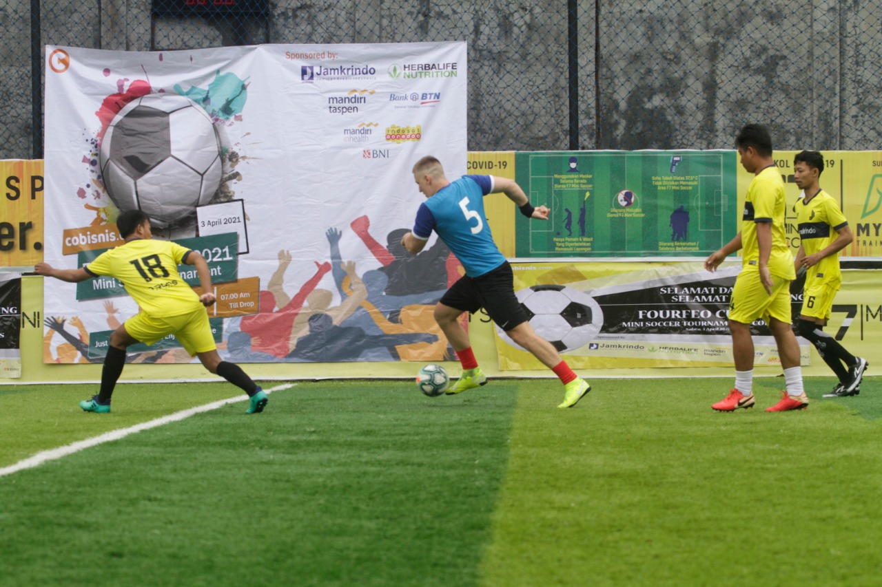 Para peserta saat bertanding Turnamen Mini Soccer Fourfeo Cup 2021 yang digelar Cobisnis.com di lapangan F7 Mini Soccer, Cilandak, Jakarta Selatan, Sabtu 3 April 2021. Tim Jamkrindo keluar sebagai juara 1 melalui sistem format 1/2 kompetisi sekelaligus berhak mendapatkan uang pembinaan tim sebesar Rp 4 juta.