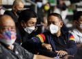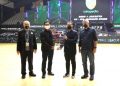 Dirut Bank Mandiri Darmawan Junaidi (dua kiri) dan Dirut Indonesian Basketball League (IBL) Junas Miradiarsyah (dua kanan) bersama Direktur Kelembagaan Bank Mandiri Rohan Hafas (kanan) dan Ketua Umum PB Perbasi Danny Kosasih saat menunjukkan deretan e-money edisi IBL 2022 di sela-sela pertandingan pembuka IBL 2022 di Hall A Basket Senayan, Jakarta, Sabtu (15/1). Sebagai main partner IBL, Bank Mandiri juga menerbitkan kartu Mandiri e-money edisi khusus IBL yang menampilkan logo 16 tim peserta IBL 2022 untuk meningkatkan awareness masyarakat terhadap IBL dan industri bolabasket nasional. Selain pada IBL, Bank Mandiri juga mendukung Tim Bola Basket Nasional yang akan berlaga sebagai tuan rumah pada ajang FIBA Asia Cup 2022 pada Juli mendatang.