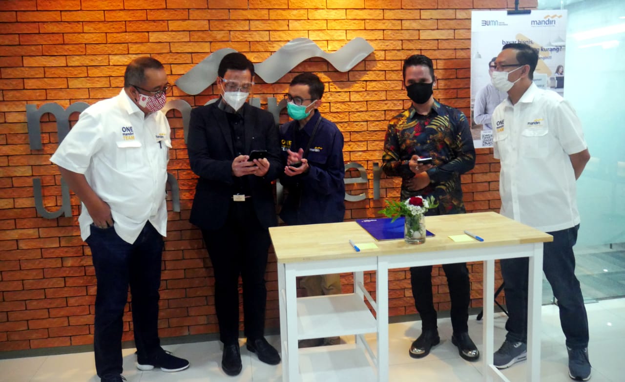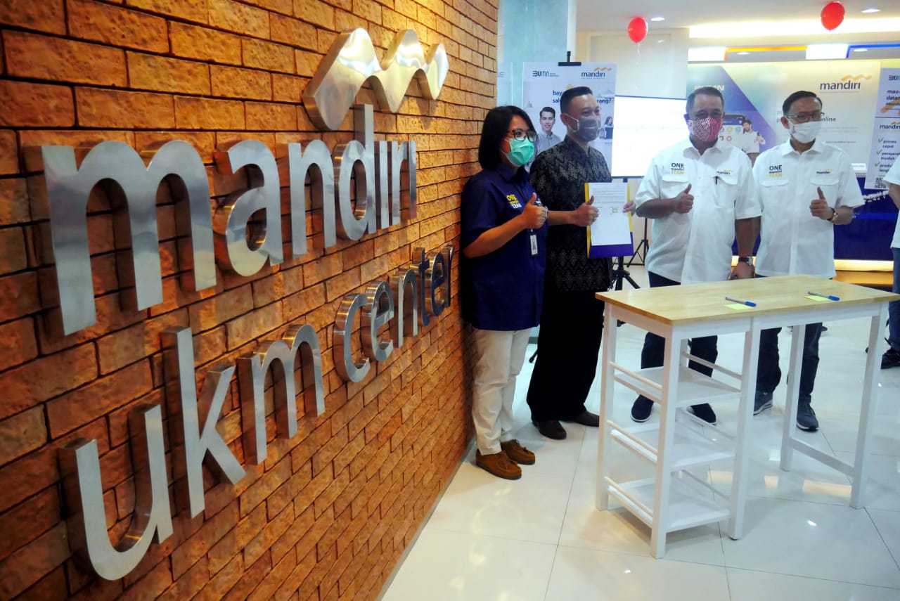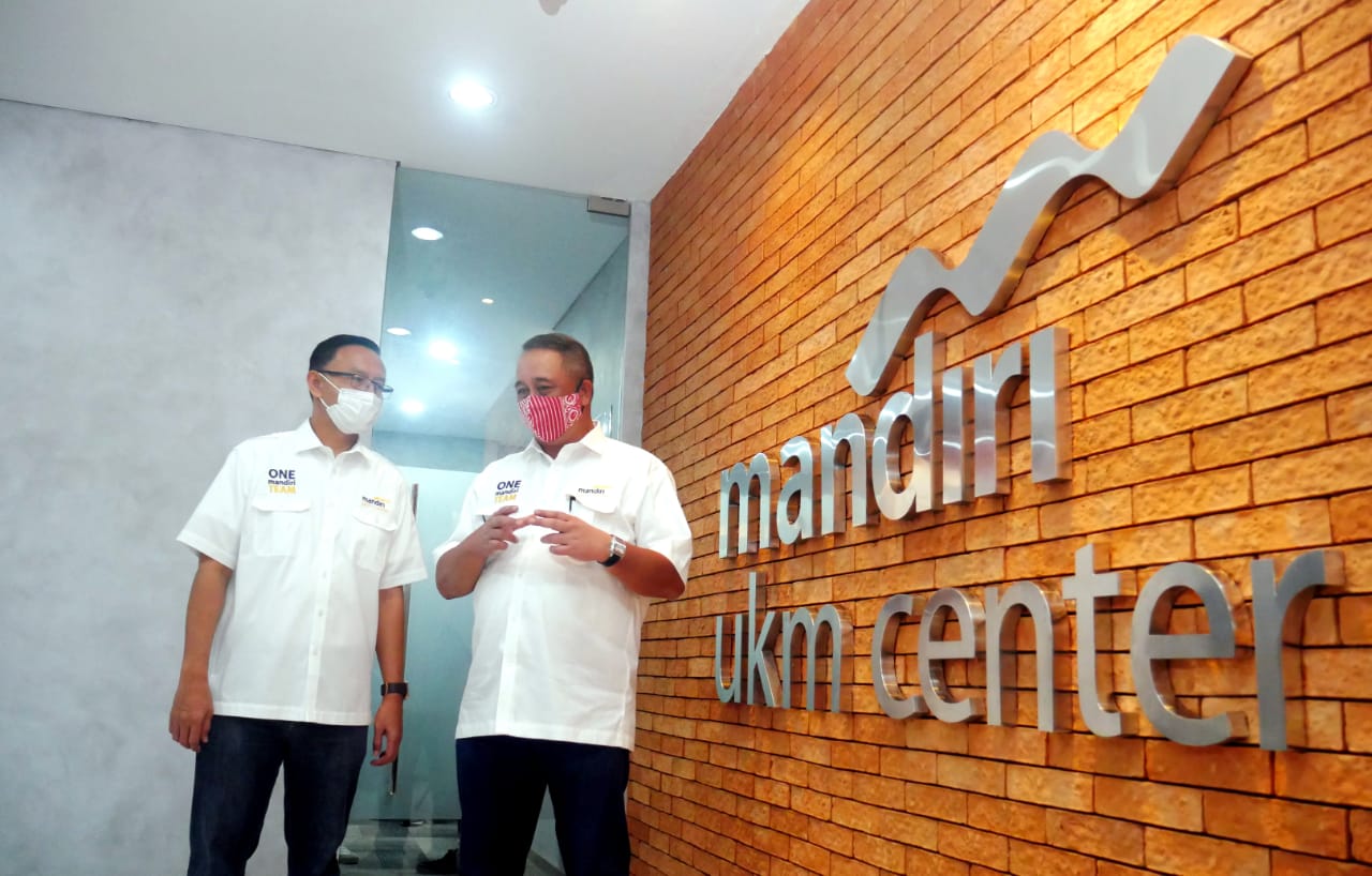 Dirut Bank Mandiri Royke Tumilaar (kiri) dan Pejabat Eksekutif Bisnis & Jaringan Bank Mandiri Aquarius Rudianto (kanan) berbincang dengan nasabah UKM di sela peresmian Mandiri UKM Center, Jl Otista, Bandung, Jumat (14/8). Untuk mendukung peran UKM dalam pemulihan ekonomi nasional Bank Mandiri mengembangkan UKM Center yang mengintegrasikan layanan perbankan bagi UKM, seperti produk dana, pembiayaan dan konsultasi serta pemasaran. Hingga Juli 2020, Bank Mandiri telah menyalurkan kredit segmen UKM sebesar Rp50,3 triliun, dengan jumlah penerima sebesar 21.895 debitur