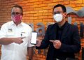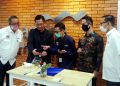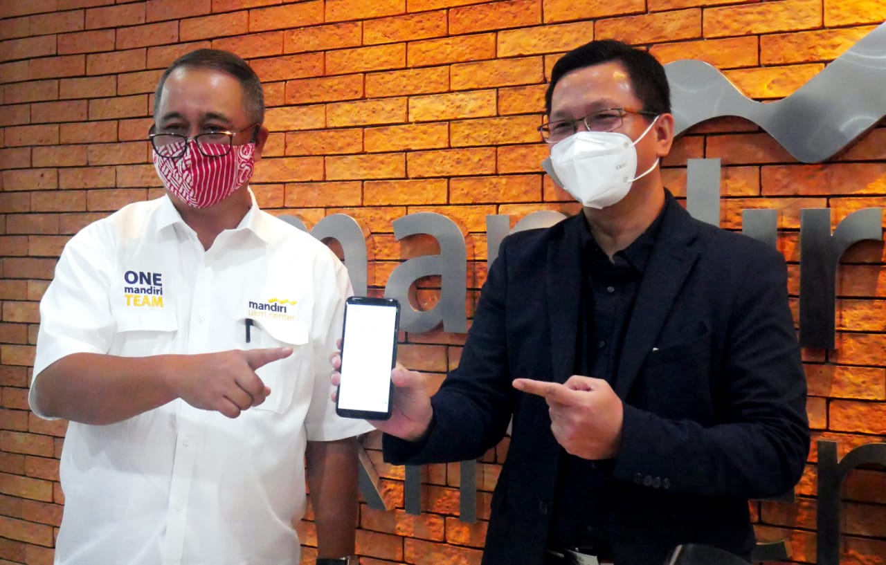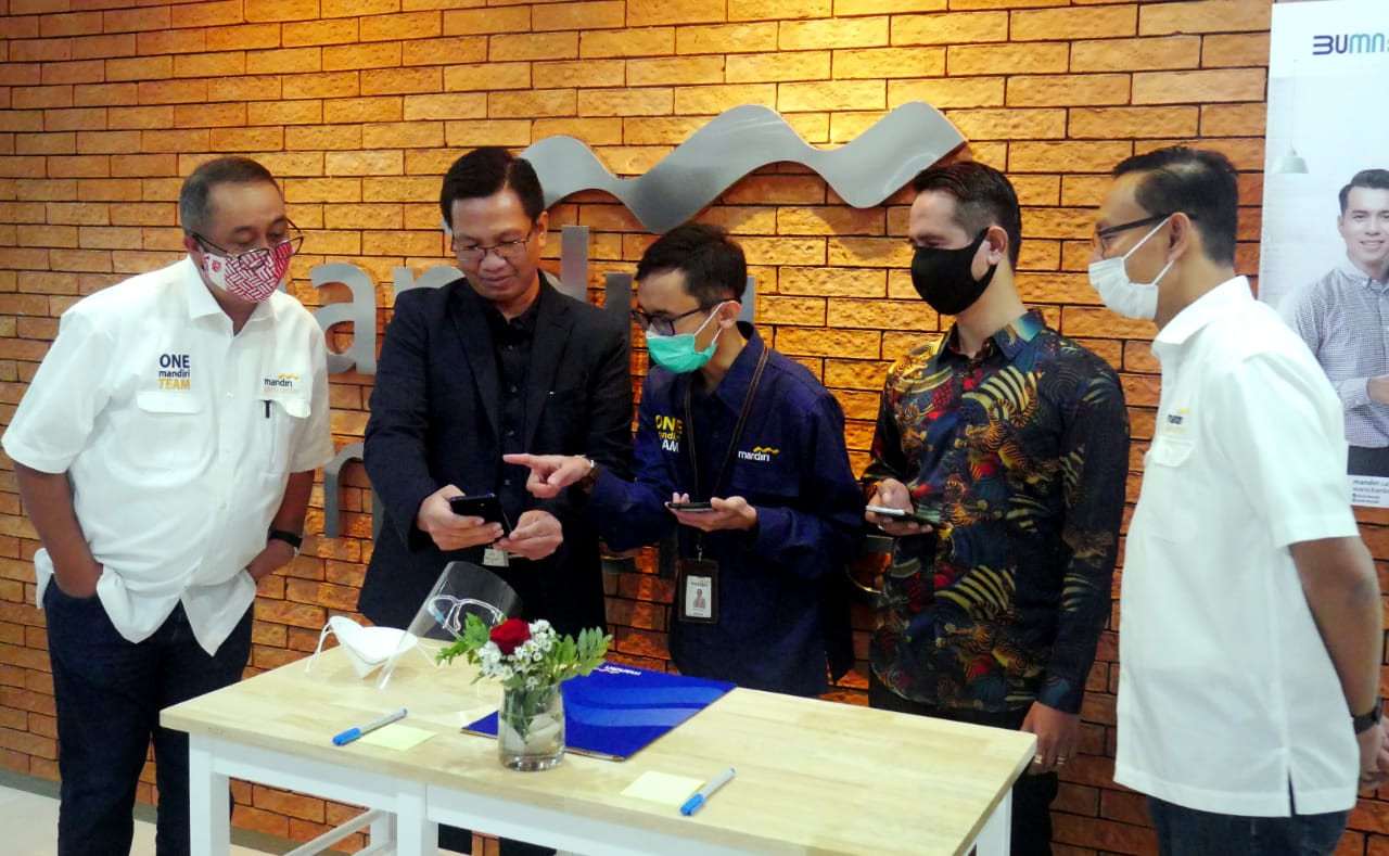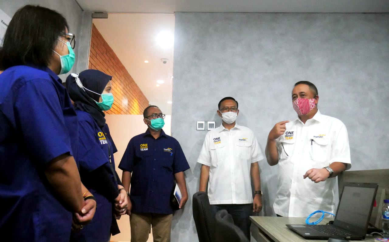 Dirut Bank Mandiri Royke Tumilaar (kiri) dan Pejabat Eksekutif Bisnis & Jaringan Bank Mandiri Aquarius Rudianto (kanan) berbincang dengan nasabah UKM di sela peresmian Mandiri UKM Center, Jl Otista, Bandung, Jumat (14/8). Untuk mendukung peran UKM dalam pemulihan ekonomi nasional Bank Mandiri mengembangkan UKM Center yang mengintegrasikan layanan perbankan bagi UKM, seperti produk dana, pembiayaan dan konsultasi serta pemasaran. Hingga Juli 2020, Bank Mandiri telah menyalurkan kredit segmen UKM sebesar Rp50,3 triliun, dengan jumlah penerima sebesar 21.895 debitur