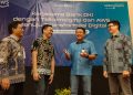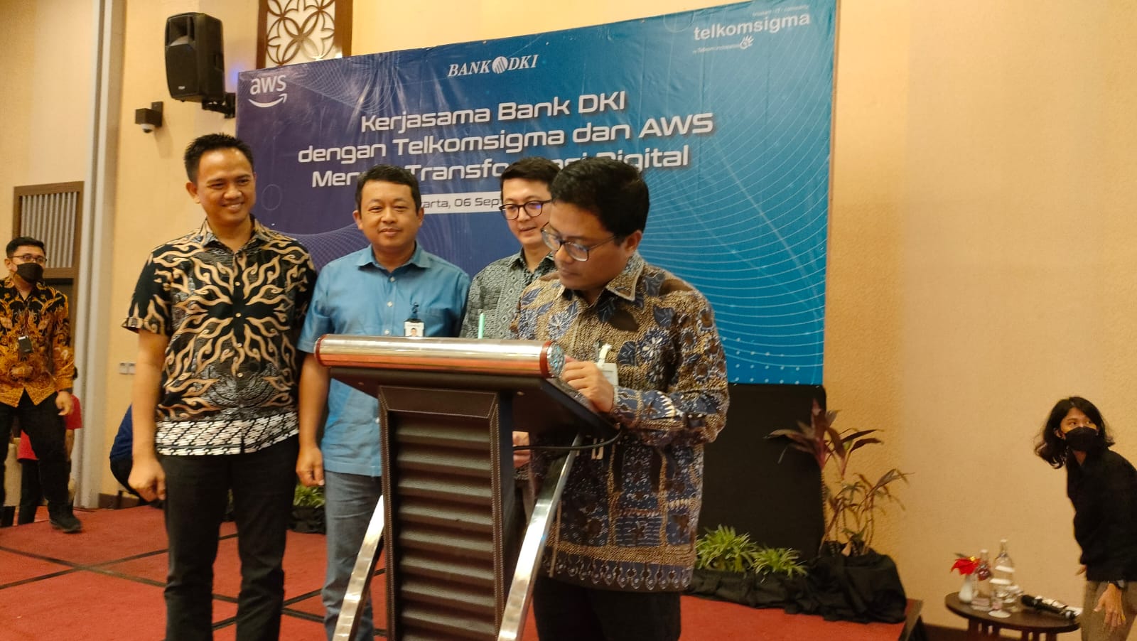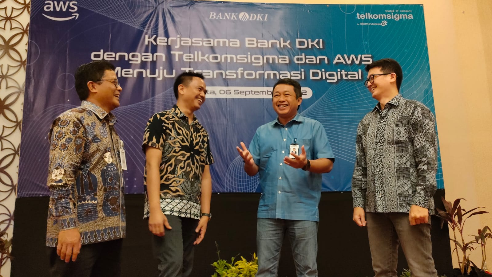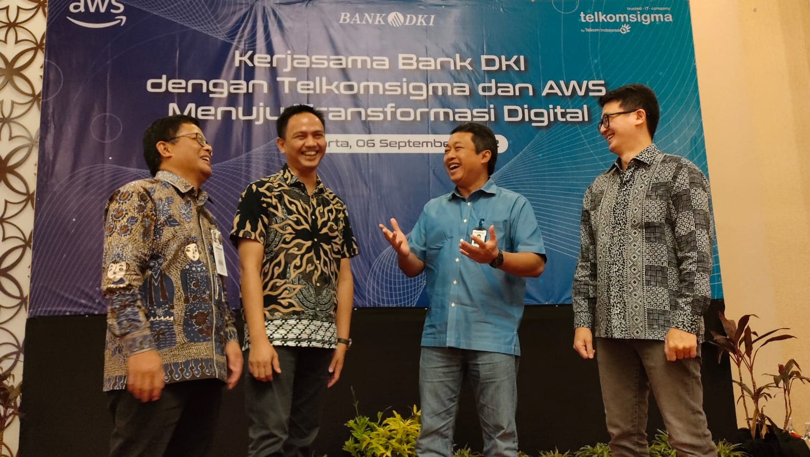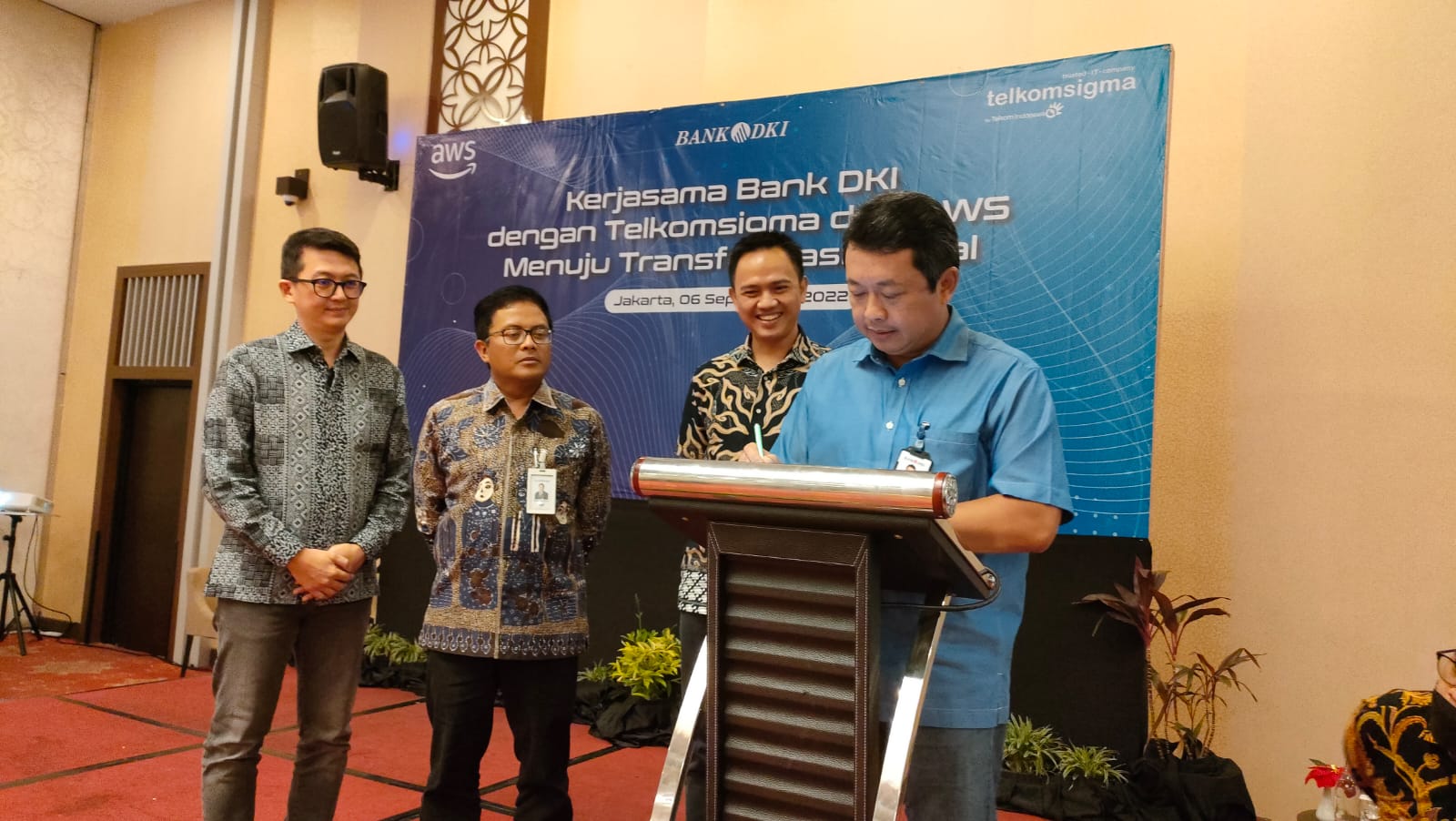 Direktur Ritel & Syariah Bank DKI, Babay Parid Wazdi (paling kanan) bersama Direktur Teknologi & Operasional Bank DKI, Amirul Wicaksono (kedua dari kiri), Direktur Business & Sales Telkomsigma, Tanto Suratno (paling kiri) dan Country Manager Amazon Web Services Indonesia, Gunawan Susanto (kedua dari kanan) melakukan penandatanganan kerja sama Bank DKI dengan Amazon Web Services dan Telkomsigma terkait pemanfaatan teknologi komputasi awan atau cloud computing di Jakarta, (06/09).