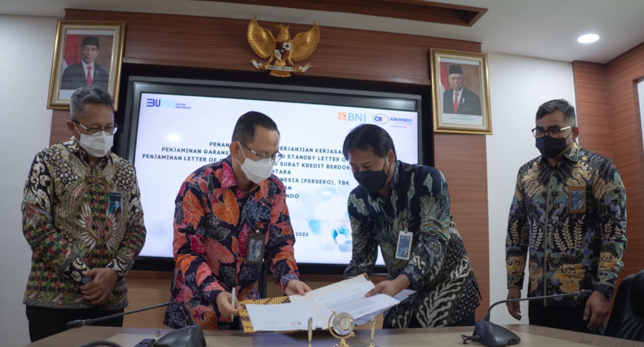 PT Askrindo melakukan perjanjian kerjasama dengan PT Bank Negara Indonesia (Persero) Tbk tentang “Penjaminan Garansi Bank Atau Standby Letter Of Credit Serta Penjaminan Letter Of Credit Atau Surat Kredit Berdokumen Dalam Negeri” kerjasama tersebut ditandatangani oleh Direktur Teknik Askrindo Vincentius Wilianto kedua kiri) dan Pemimpin Divisi Hubungan Kelembagaan 2 BNI Arya Prajaka (kedua kanan) di saksikan Direktur Operasional Askrindo Erwan Djoko Hermawan (kiri) serta Wakil Pemimpin Divisi Hubungan Kelembagaan 2 BNI Donny Chairuman (kanan), di Jakarta, Selasa