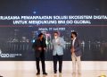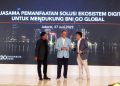 (Ki-ka) Direktur M Cash Mohammad Anis Yunianto, Direktur Utama BNI Royke Tumilaar, Direktur Utama Telkomsel Hendri Mulya Syam berbincang – bincang usai menyaksikan Penandatanganan Perjanjian Kerja Sama Pemanfaatan Solusi Ekosistem Digital Untuk Mendukung BNI Go Global di Menara BNI, Jakarta, Senin (27/6/2022). BNI, Telkomsel, dan MCAS Group memastikan pendistribusian cross-products & services, sekaligus pemberdayaan ekosistem digital untuk bersinergi melalui sharing biller, layanan drop point logistik di Agen46 BNI, dan utilisasi IP Bumi Langit pada kartu uang elektronik TapCash.
