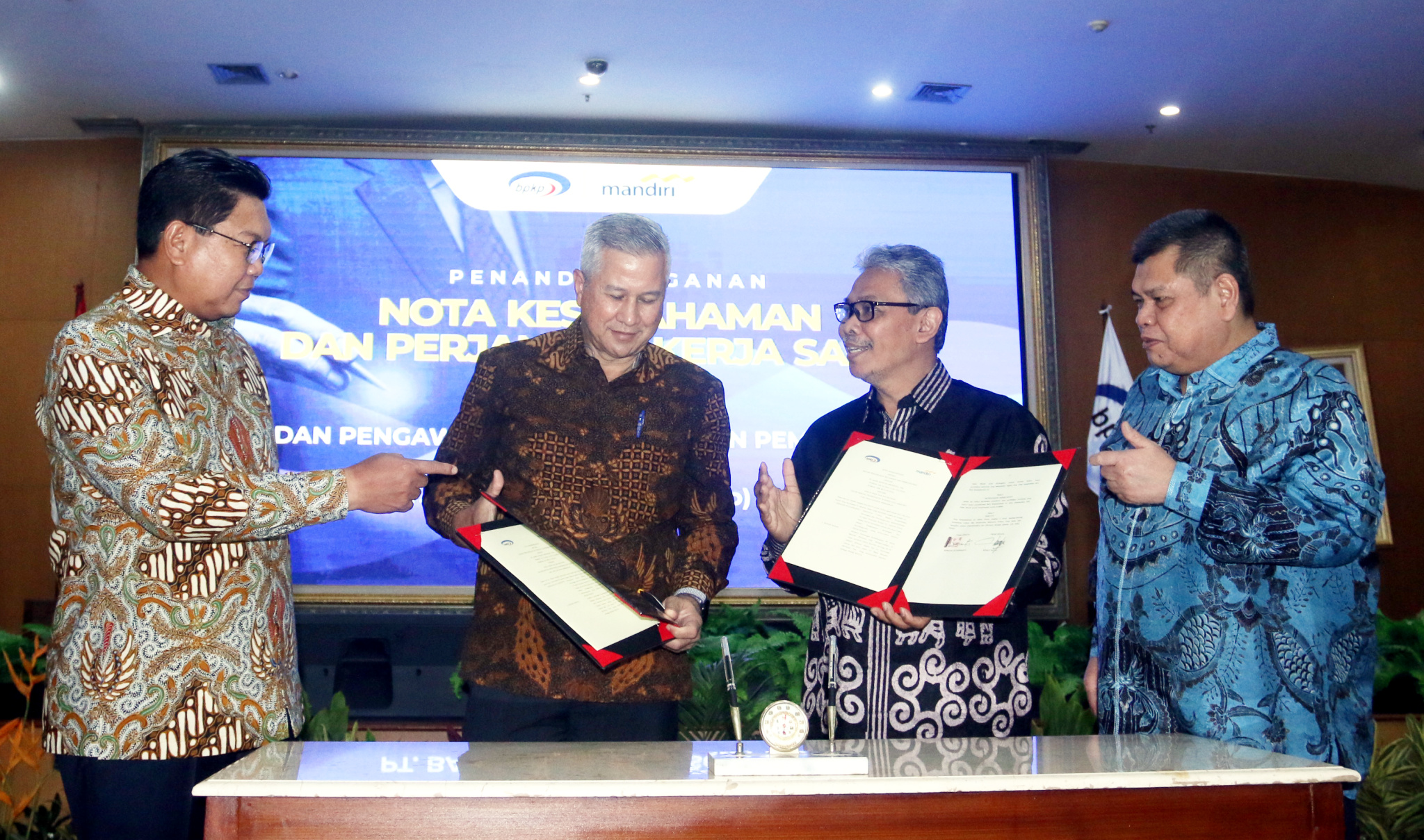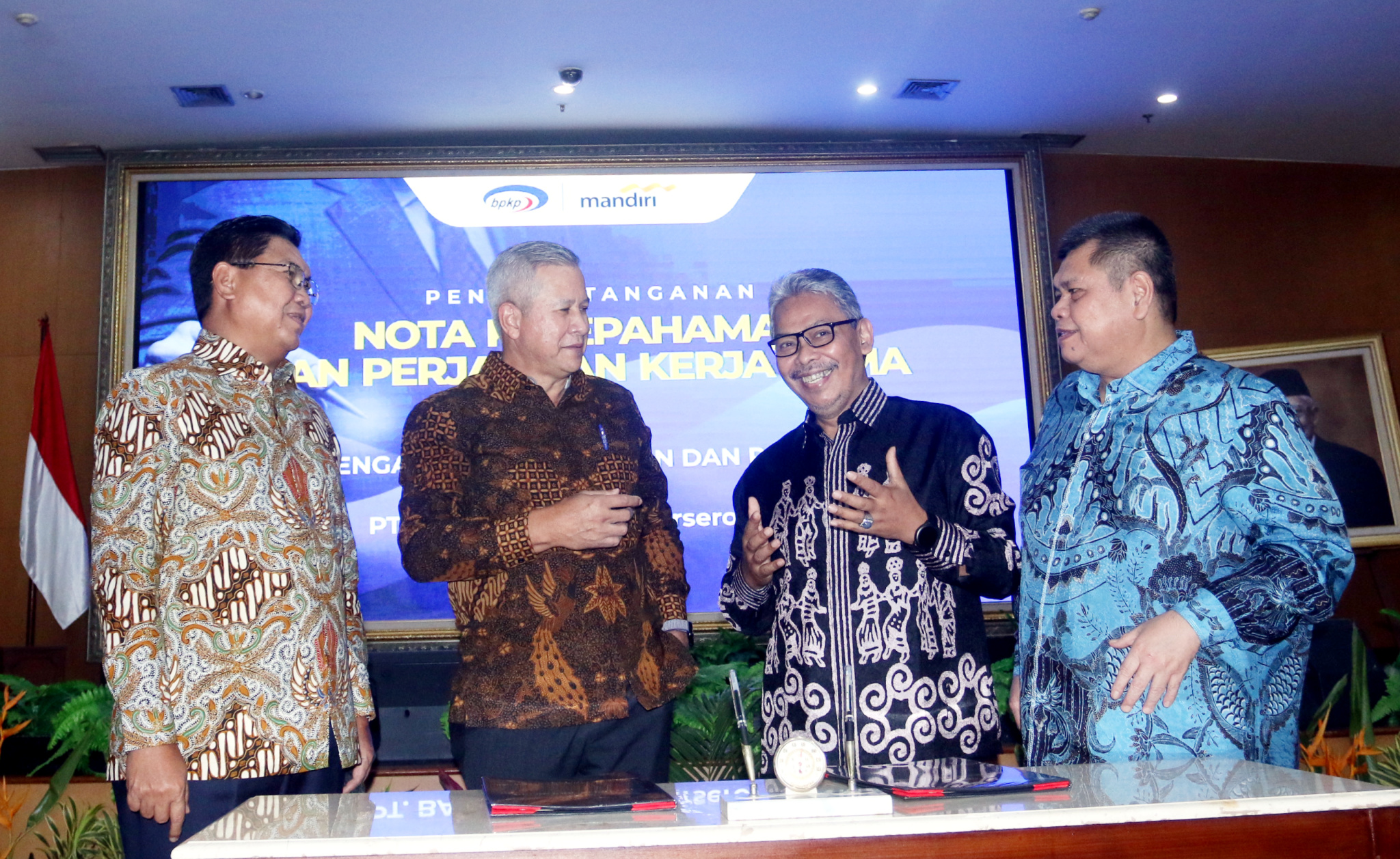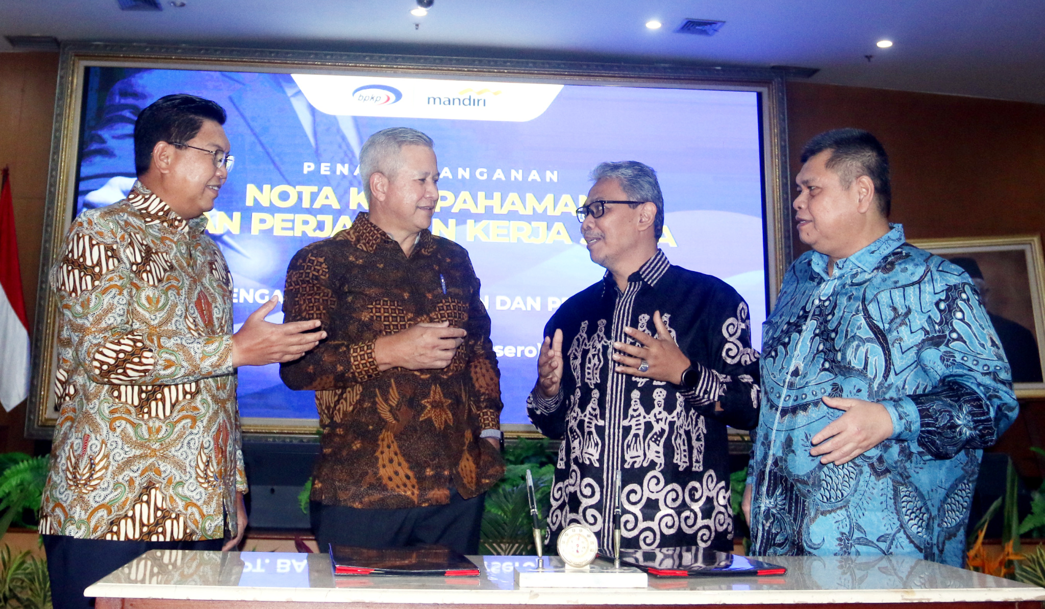 (kika) Direktur Utama Bank Mandiri Darmawan Junaidi, Direktur Hubungan Kelembagaan Bank Mandiri Rohan Hafas, Sekretaris Utama Badan Pengawas Keuangan dan Pembangunan (BPKP) Ernadhi Sudarmanto dan Kepala BPKP Muhammad Yusuf Ateh berbincang usai penandatanganan MoU dan Perjanjian kerjasama di Jakarta, Selasa (26/4). Dalam kerjasama ini, Bank Mandiri akan menyediakan berbagai produk dan layanan perbankan yang dibutuhkan BPKP, baik lembaga ataupun karyawan, dalam pelaksanaan fungsinya sebagai Pembina Pengendali Internal di kantor-kantor pemerintah. Kedua pihak juga menyepakati kolaborasi di bidang penguatan kompetensi SDM, seperti melalui training, seminar dan workshop serta pertukaran karyawan