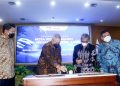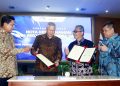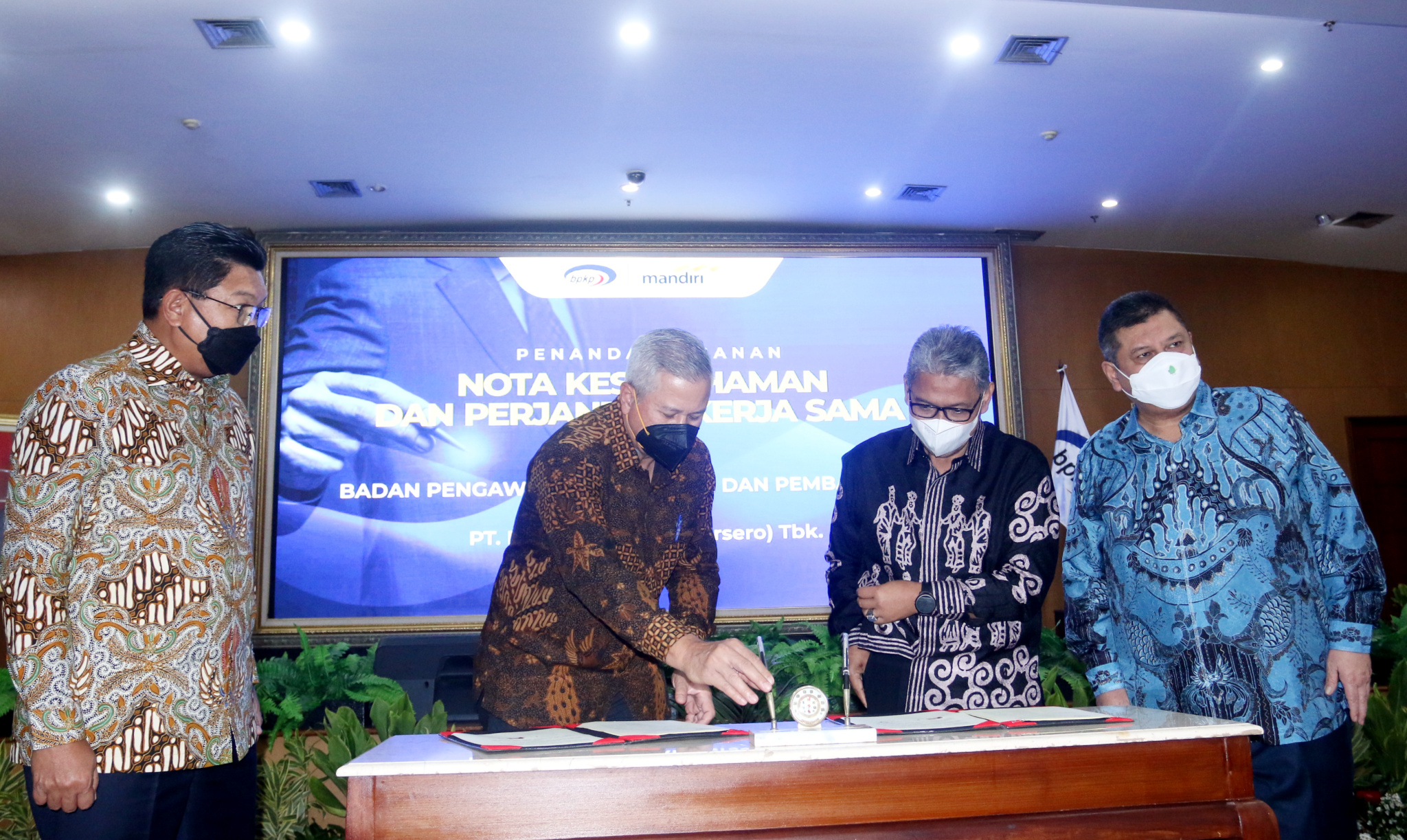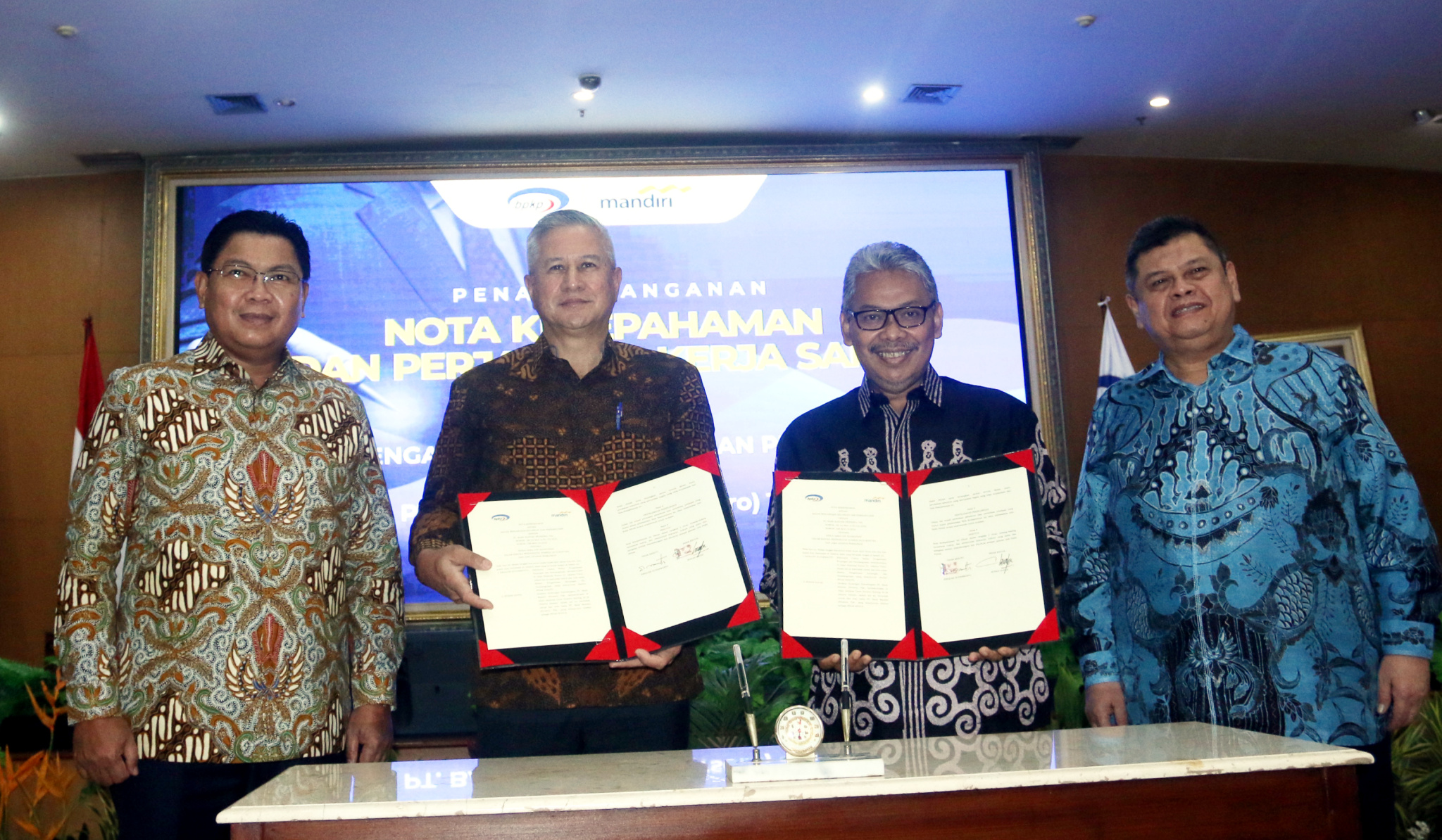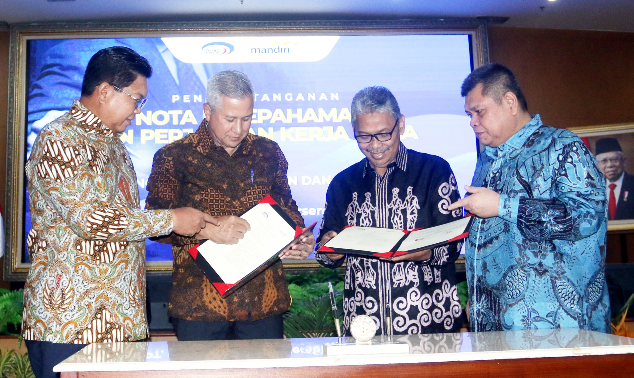 (kika) Direktur Utama Bank Mandiri Darmawan Junaidi, Direktur Hubungan Kelembagaan Bank Mandiri Rohan Hafas, Sekretaris Utama Badan Pengawas Keuangan dan Pembangunan (BPKP) Ernadhi Sudarmanto dan Kepala BPKP Muhammad Yusuf Ateh berbincang usai penandatanganan MoU dan Perjanjian kerjasama di Jakarta, Selasa (26/4). Dalam kerjasama ini, Bank Mandiri akan menyediakan berbagai produk dan layanan perbankan yang dibutuhkan BPKP, baik lembaga ataupun karyawan, dalam pelaksanaan fungsinya sebagai Pembina Pengendali Internal di kantor-kantor pemerintah. Kedua pihak juga menyepakati kolaborasi di bidang penguatan kompetensi SDM, seperti melalui training, seminar dan workshop serta pertukaran karyawan