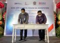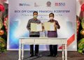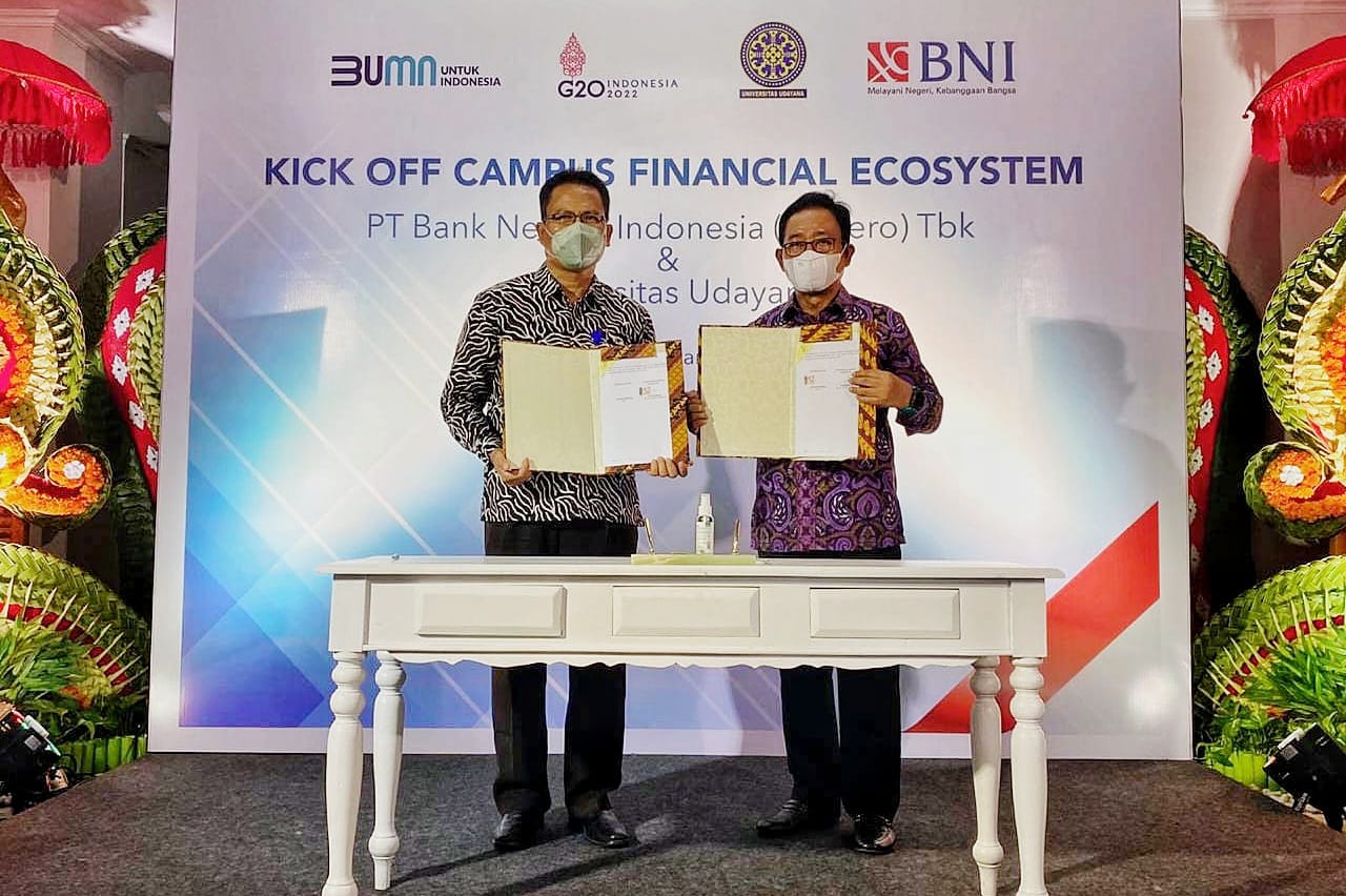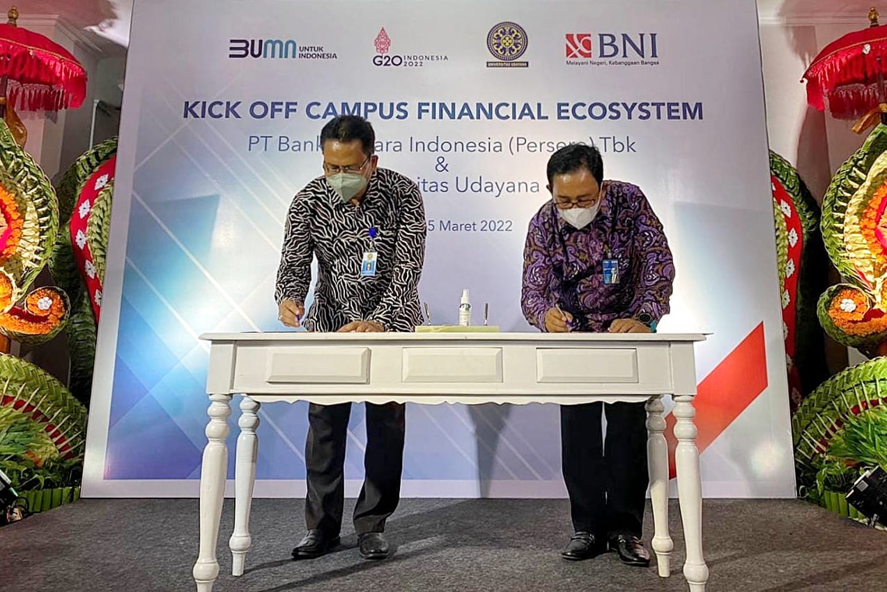 (KiKa) Wakil Rektor Bidang Perencanaan, Kerjasama & Informasi I Putu Gede Adiatmika dan Direktur Hubungan Kelembagaan BNI Sis Apik Wijayanto menunjukkan dokumen Nota Kesepahaman (MoU) tentang Ekosistem Keuangan Perguruan Tinggi, Jumat (25/3/2022).