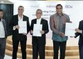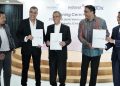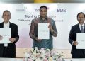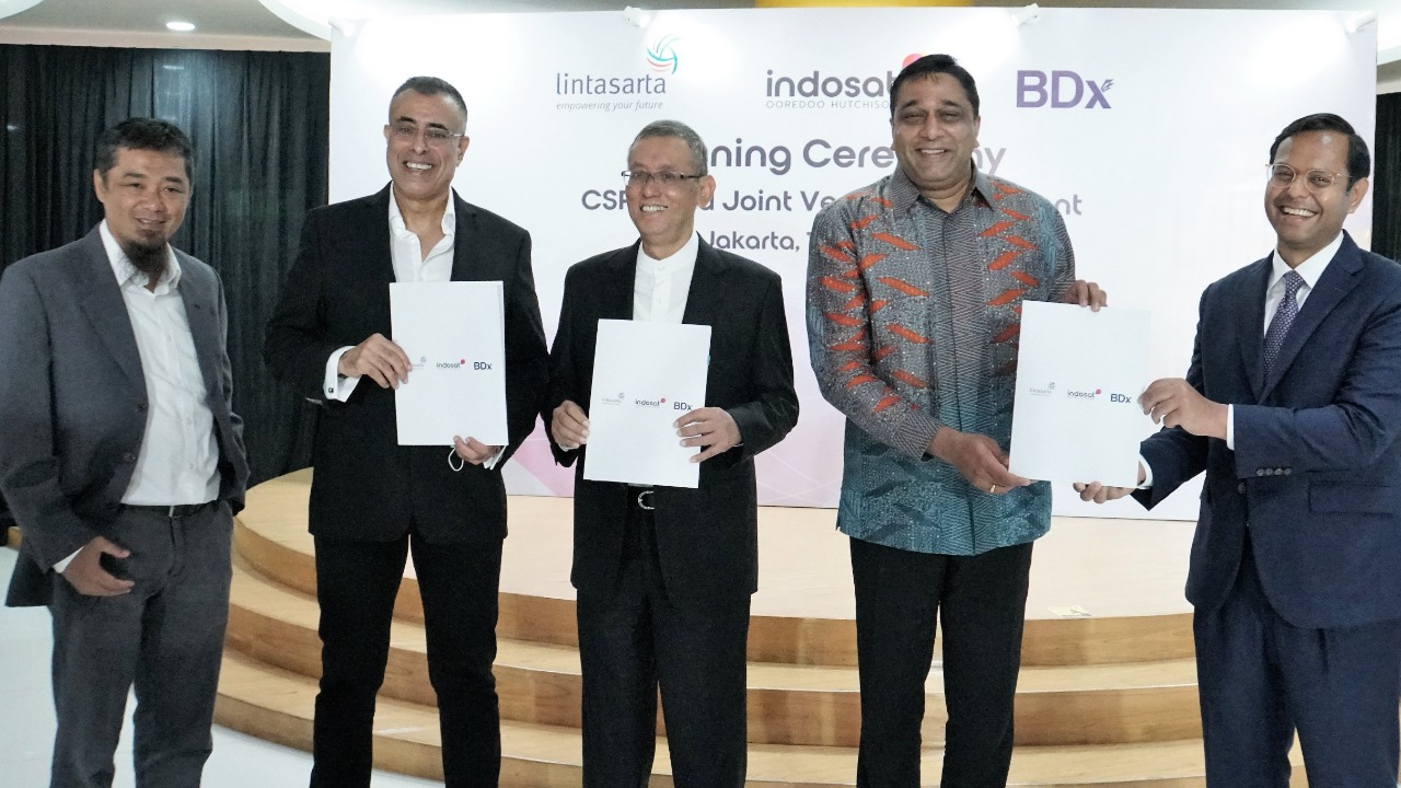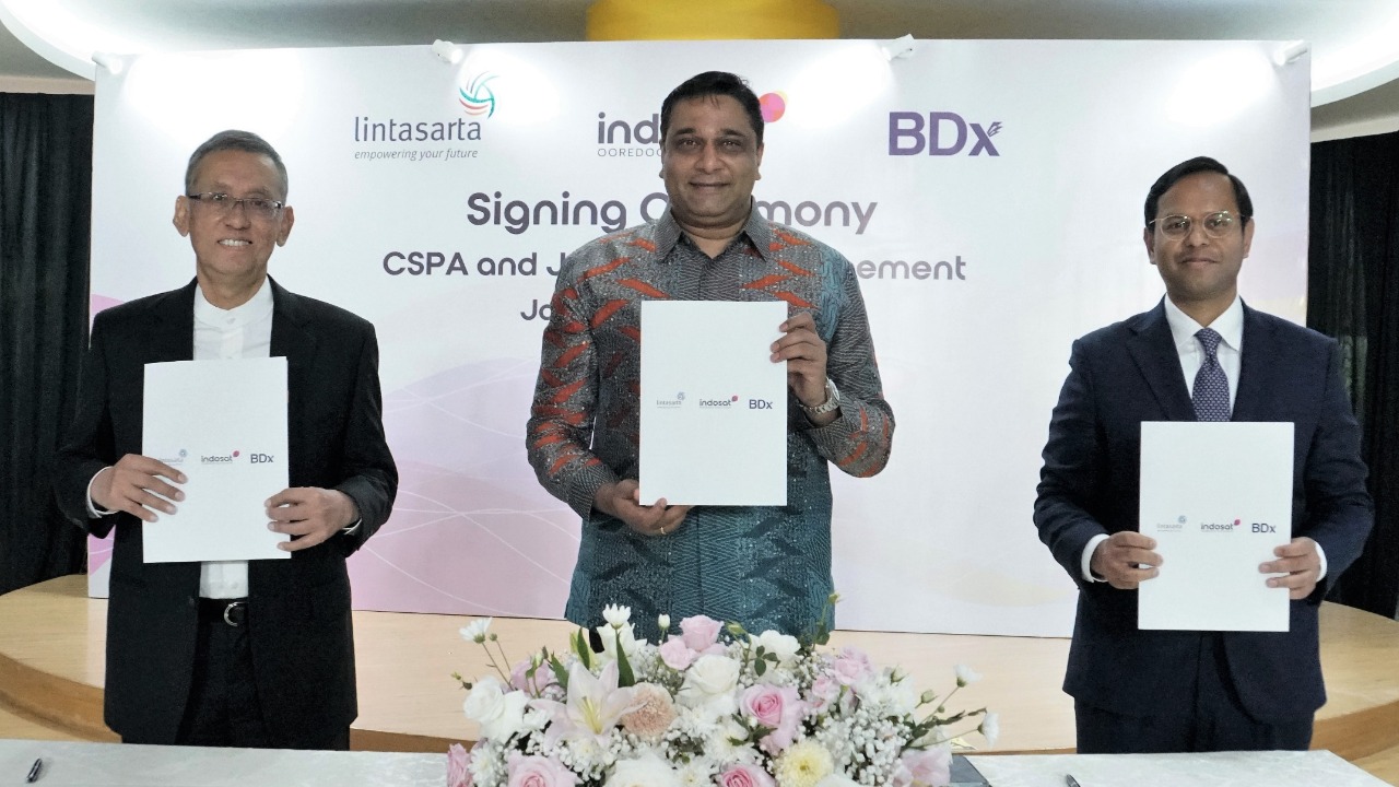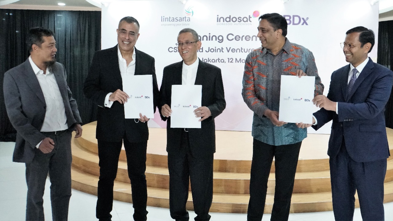 President Director and CEO Indosat Ooredoo Hutchison, Vikram Sinha (dua dari kanan), Partner I Squared Capital, Harsh Agrawal (paling kanan), Chief Executive Officer BDx, Braham Singh (dua dari kiri), President Director Lintasarta, Arya Damar (tiga dari kanan), dan perwakilan dari SMT (paling kiri), saat berfoto bersama setelah penandatanganan perjanjian jual beli saham bersyarat (“CSPA”) dan perjanjian usaha patungan *untuk mengembangkan sebuah perusahaan data center kelas dunia*, di Kantor Pusat Indosat Ooredoo Hutchison, Jakarta (12/5). PT Indosat Tbk (“Indosat Ooredoo Hutchison atau IOH”), PT Aplikanusa Lintasarta, PT Starone Mitra Telekomunikasi dan BDX Asia Data Center Holdings Pte. Ltd (“BDX”) telah menandatangani suatu perjanjian jual beli saham bersyarat (“CSPA”) dan perjanjian usaha patungan dengan estimasi nilai transaksi sebesar Rp3,3 triliun, yang nantinya akan dilengkapi dengan serangkaian perjanjian komersial dan operasional lainnya yang akan menjadi efektif setelah pemenuhan CSPA.