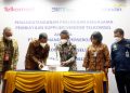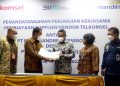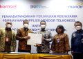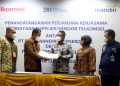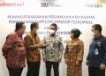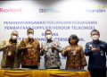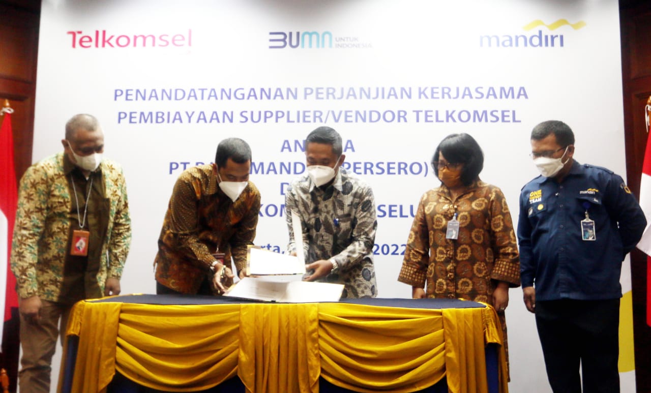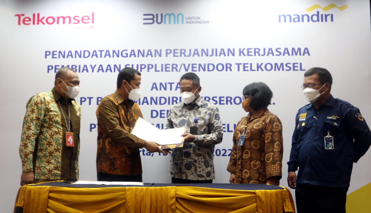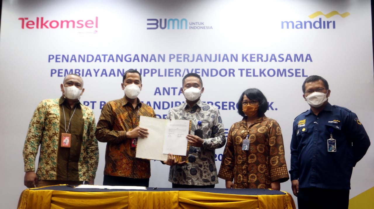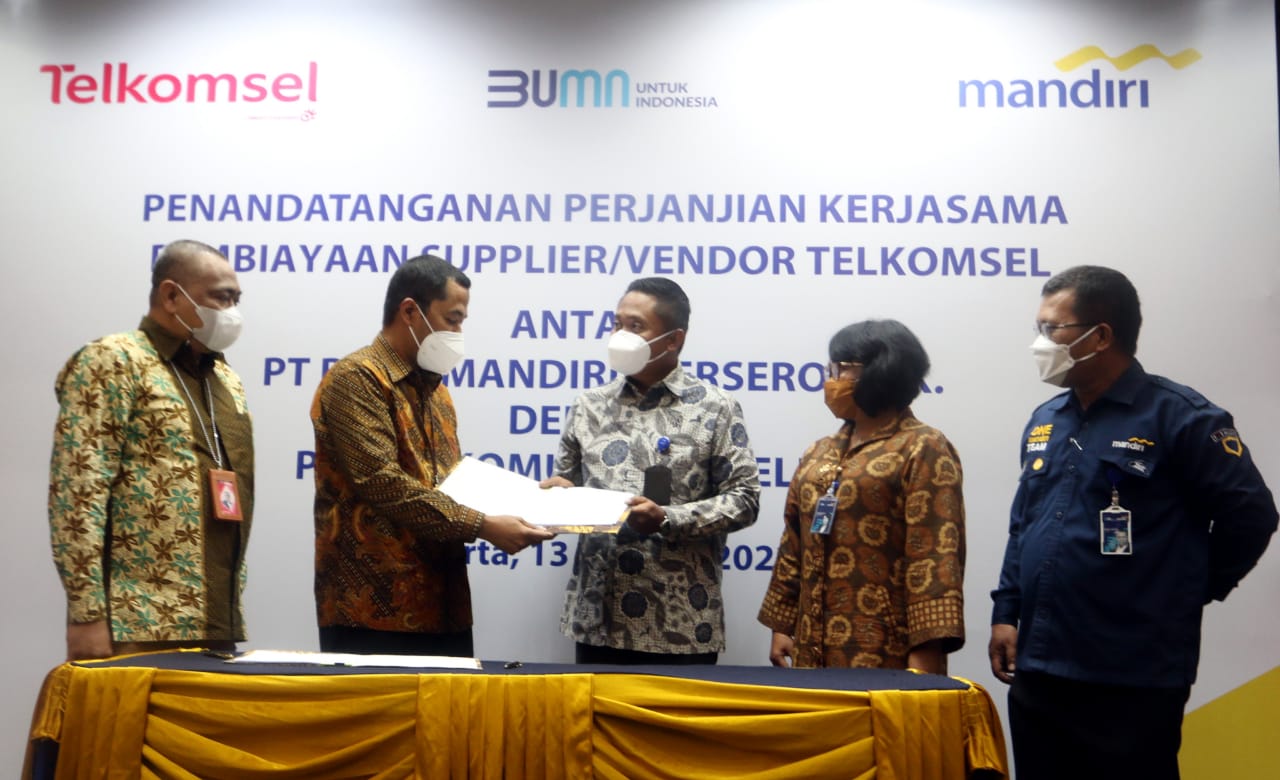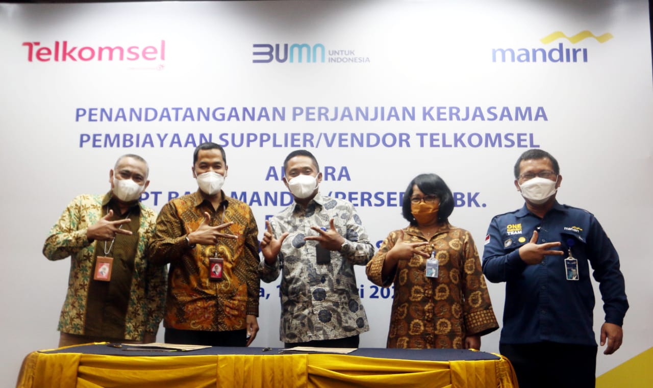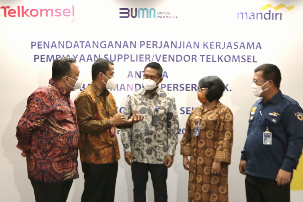 (kika) GM AP dan AR Management Telkomsel Taufik Hidayat, Direktur Keuangan dan Manajemen Risiko Telkomsel Mohamad Ramzy, SVP SME Banking Bank Mandiri Alexander Dippo, Direktur Corporate Banking Bank Mandiri Susana Indah K. Indriati dan SVP Corporate Banking Bank Mandiri Midian Samosir sedang berbincang saat penandatanganan perjanjian kerjasama pembiayaan supplier di Jakarta, Kamis (13/1). Meningkatkan pemberdayaan mitra supplier Telkomsel, Bank Mandiri menyiapkan akses permodalan berskema Accepted Invoice Financing (“AIF”) dengan limit yang disesuaikan dengan kebutuhan masing-masing supplier. Pembiayaan sendiri akan diberikan kepada supplier yang telah mengantungi kontrak dari Telkomsel.