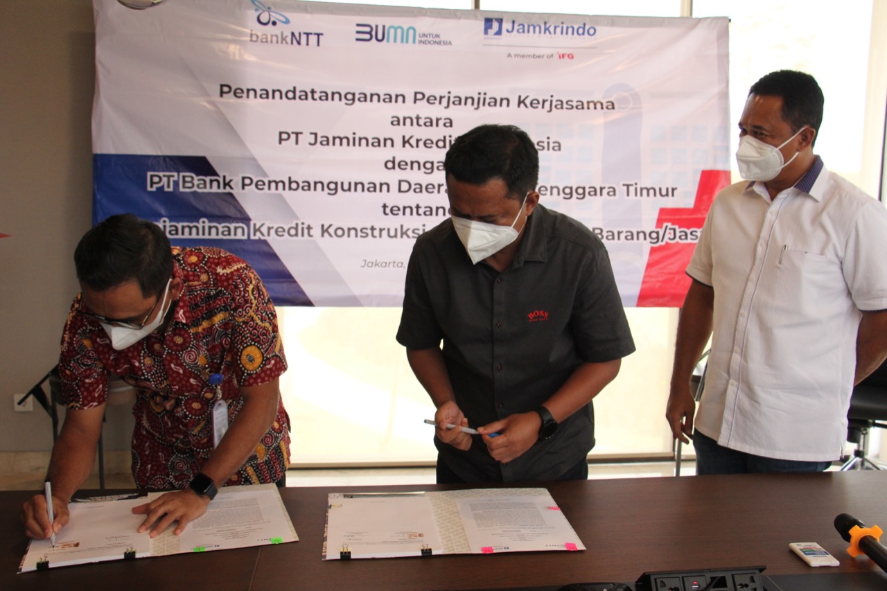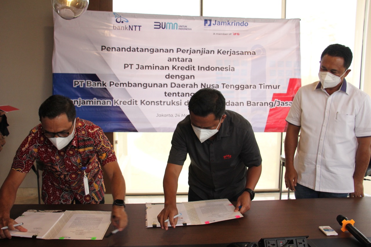 PT Jamkrindo melakukan penandatanganan Perjanjian Kerja Sama (PKS) Penjaminan Kredit Modal Kerja Konstruksi dan Pengadaan Barang/Jasa dengan PT Bank Pembangunan Daerah Nusa Tenggara Timur atau Bank NTT, pada Kamis, 24 Maret 2022.