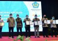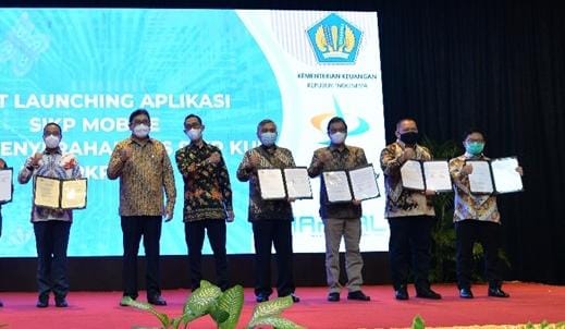 Direktur Ritel dan Syariah Bank DKI, Babay Parid Wazdi (ketiga dari kiri) menerima penyerahan Perjanjian Kerja Sama tentang Sistem Informasi Kredit Program Kredit Usaha Rakyat (SIKP KUR) dari Direktur Jendral Perbendaharaan Kementrian Keuangan Republik Indonesia, Hadiyanto (ketiga dari kanan) dalam acara penyerahan PKS SIKP KUR & PKP SSRG dan Soft Launching SIKP Mobile yang diselenggarakan oleh Kementrian Keuangan Republik Indonesia di Jakarta, (31/3).