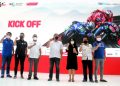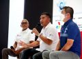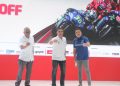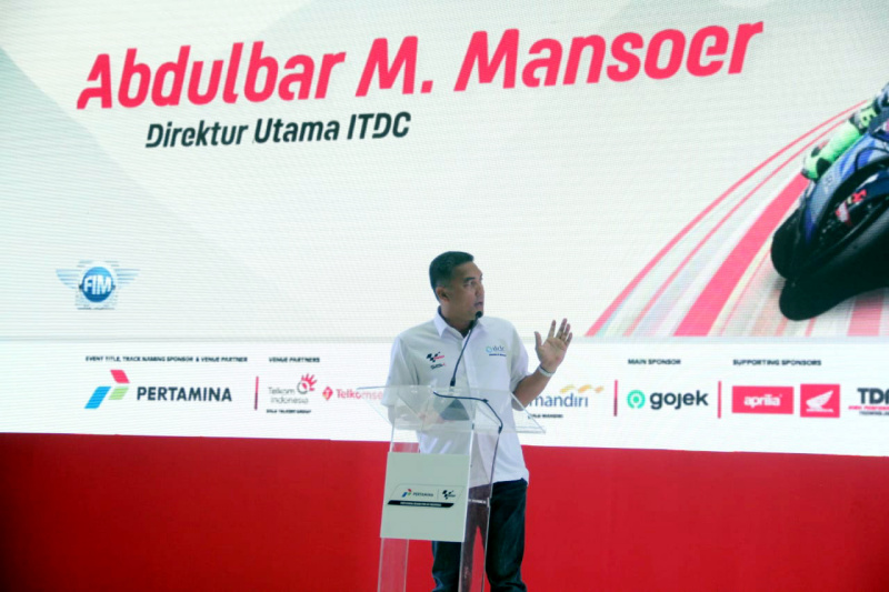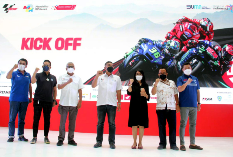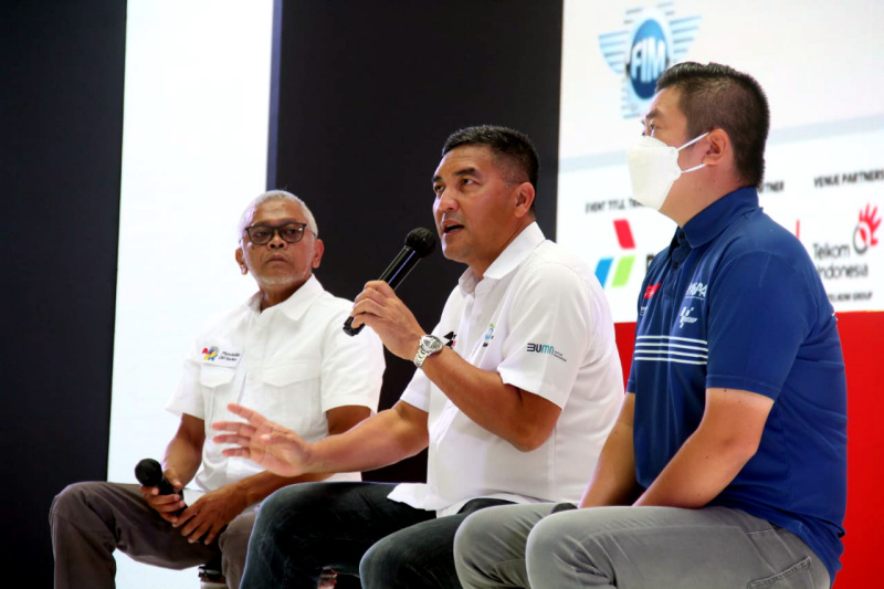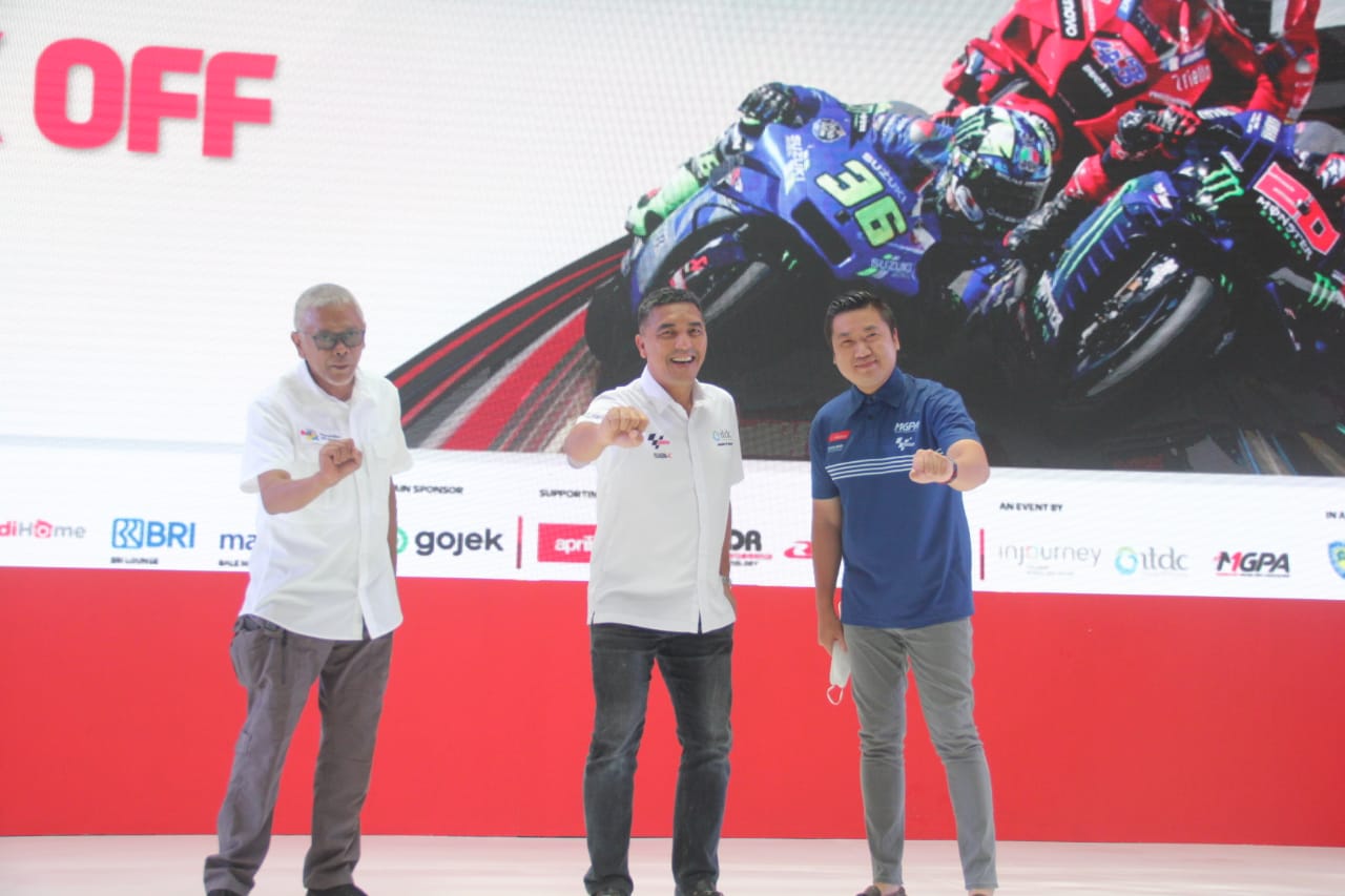 Direktur Utama Indonesia Tourism Development Corporation (ITDC) Abdulbar M. Mansoer (tengah) , Direktur Utama Mandalika Grand Prix Association (MGPA) Priandhi Satria (kiri), Wakil Direktur Utama MGPA Cahyadi Wanda (kanan) berbincang di sela acara kick off Mandalika GP Hub di Epicentrum Walk, Jakarta, Minggu (27/2). Mandalika GP Hub yang akan berlangsung hingga 20 Maret ini, merupakan event untuk mempromosikan penyelenggaraan Pertamina Grand Prix of Indonesia (MotoGP) 2022 serta diharapkan dapat membantu memenuhi keinginan masyarakat yang ingin membeli tiket MotoGP atau masyarakat yang ingin mendapatkan merchandise MotoGP.