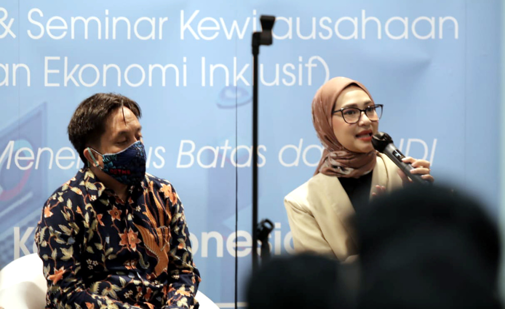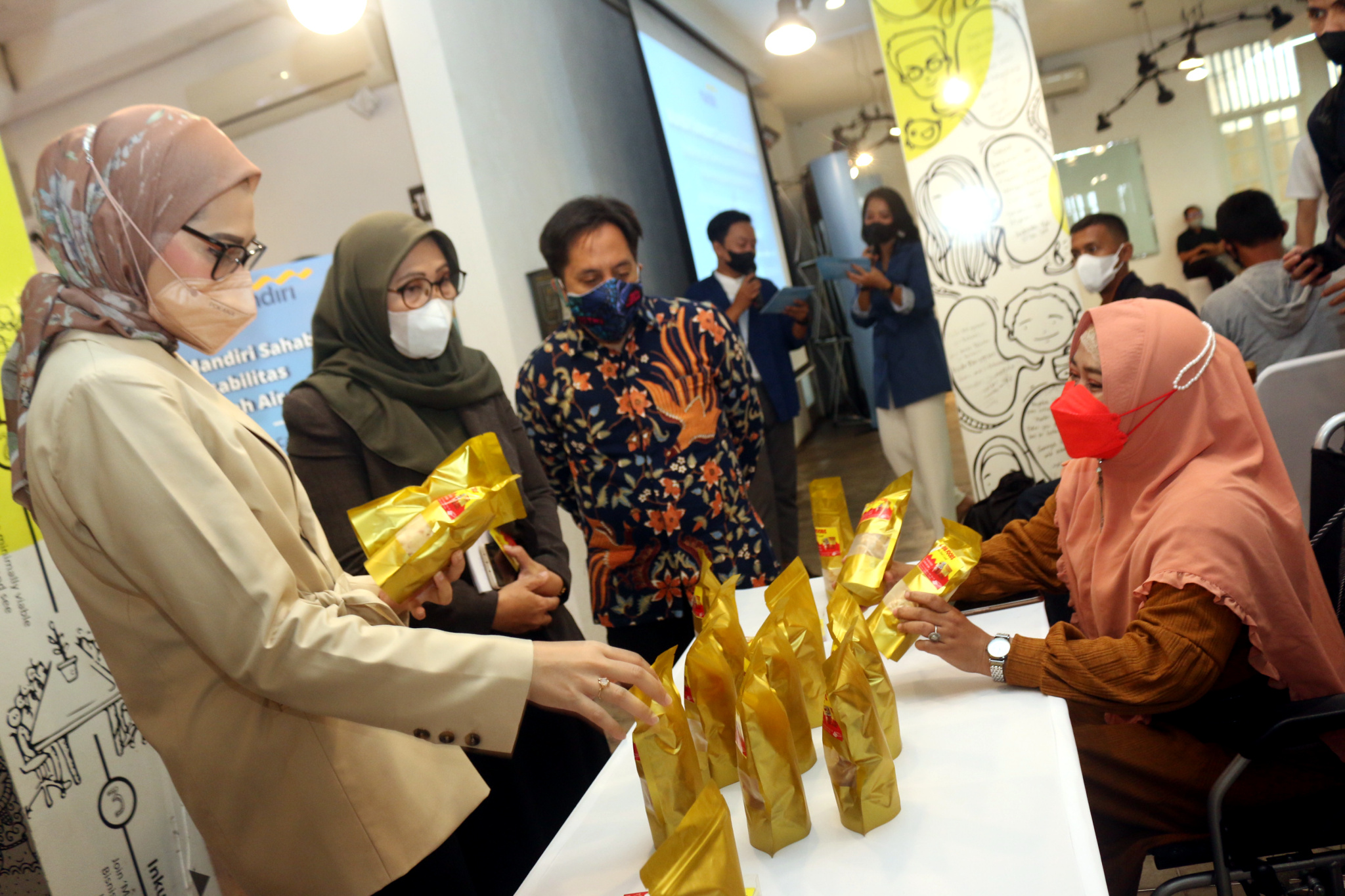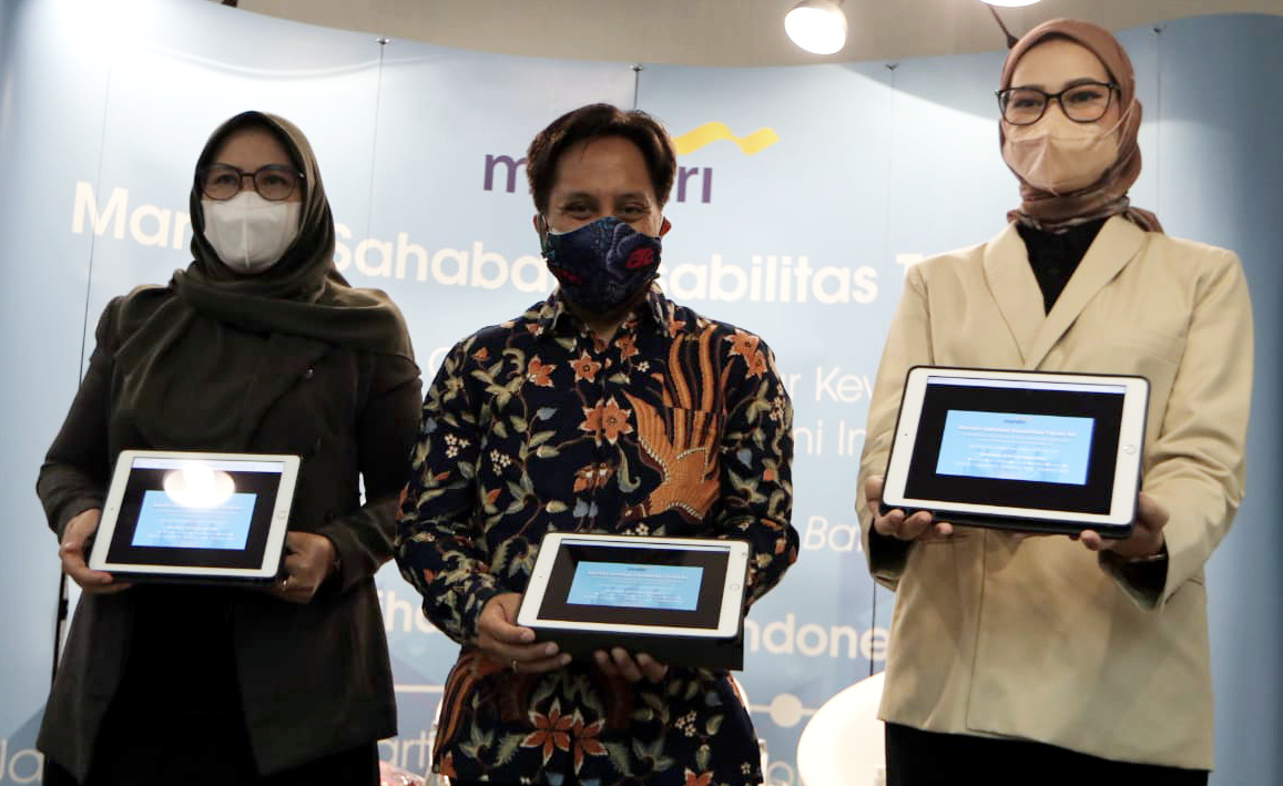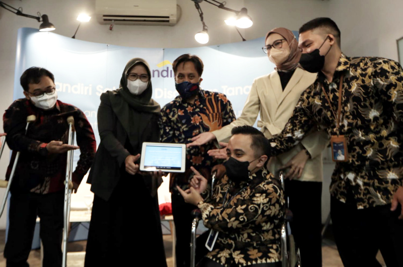 (kika) Founder Difabike Triyono, Staf Khusus Kepresidenan bidang Sosial Angkie Yudistia, VP CSR Dept Head Bank Mandiri Diwangkoro A Ratam, Ketua Komisi Nasional Disabilitas Dante Rigmalia serta Staff Call Center Bank Mandiri Deki Syahputra dan Julian Sulistianto (berkursiroda) berfoto saat kick off program Mandiri Sahabat Disabilitas Tanah Air di Jakarta, Rabu (23/3). Pada program ini, Bank Mandiri berkolaborasi dengan Yayasan Menembus Batas dan Komisi Nasional Disabilitas Indonesia menggelar Program Pelatihan Call Centre dan Seminar Kewirausahaan di 6 kota besar, yakni Jakarta, Yogyakarta, Bandung, Solo, Surabaya dan Bali bersama lebih dari 300 penyandang disabilitas. Selain pelatihan, peserta juga akan mengikuti seminar dan workshop kewirausahaan