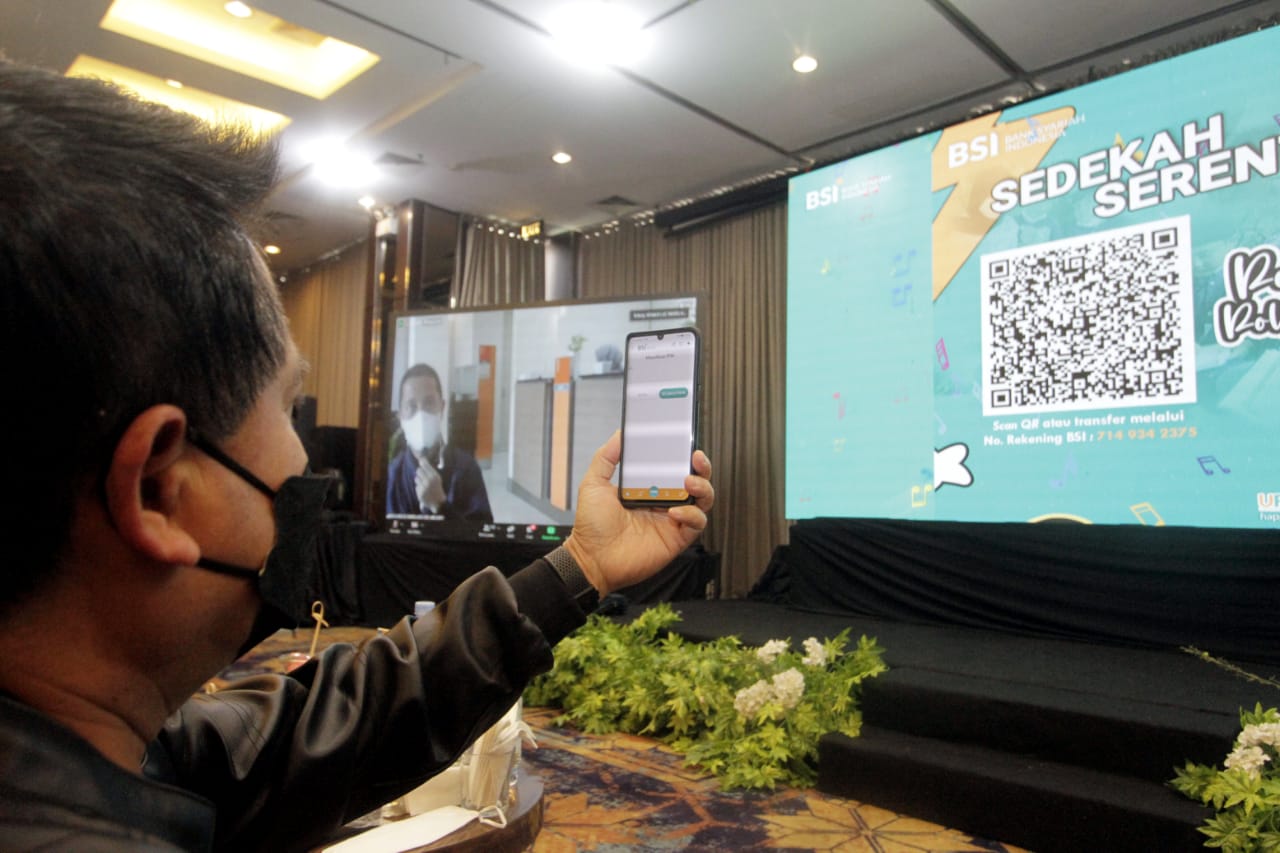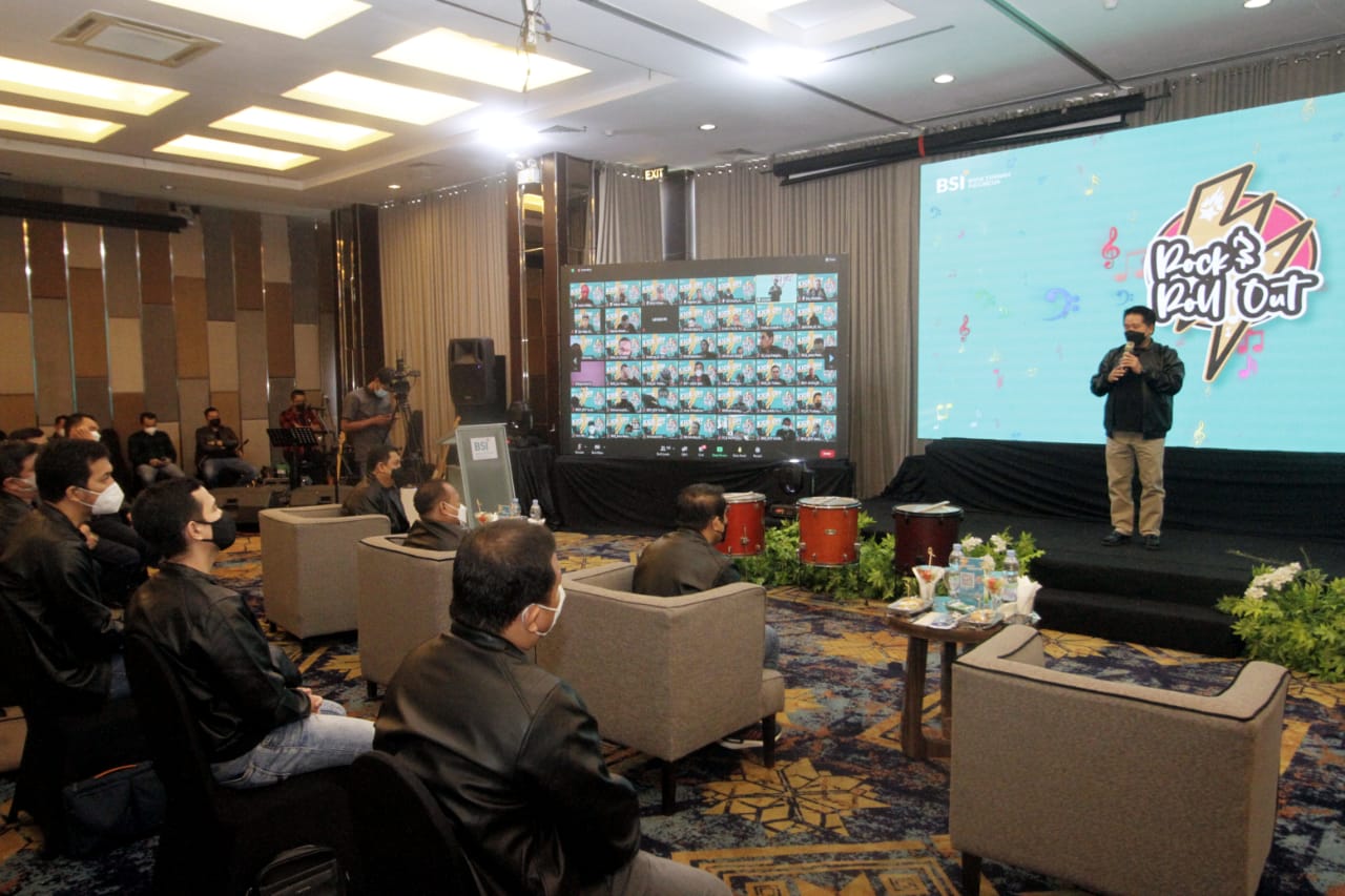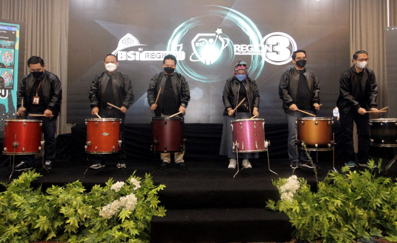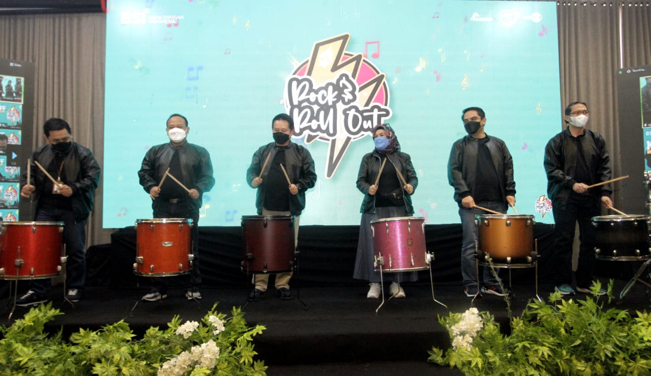 (Kiri-kanan): Project Leader Rollout Manager Gunawan A. Hartoyo, Direktur Information Technologi Achmad Syafii, Direktur Utama Hery Gunardi, Direktur Risk Management Tiwul Widyastuti, Direktur Sales & Distribution Anton Soekarna, dan Regional CEO III PT Bank Syariah Indonesia Tbk Dedy S. Darmawan melakukan kick-off Roll out dengan menabuh drum bersama-sama. Hari ini (12/06), Bank Syariah Indonesia (BSI) secara serentak melakukan kickoff penyatuan dan integrasi sistem layanan di wilayah Sumatera.