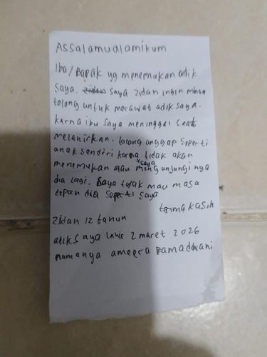 Informasi tersebut diketahui dari sepucuk surat yang ditulis tangan oleh sang kakak bernama Zidan. Dalam surat tersebut, Zidan memohon kepada siapa pun yang menemukan adiknya agar bersedia merawat bayi tersebut dengan baik.