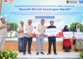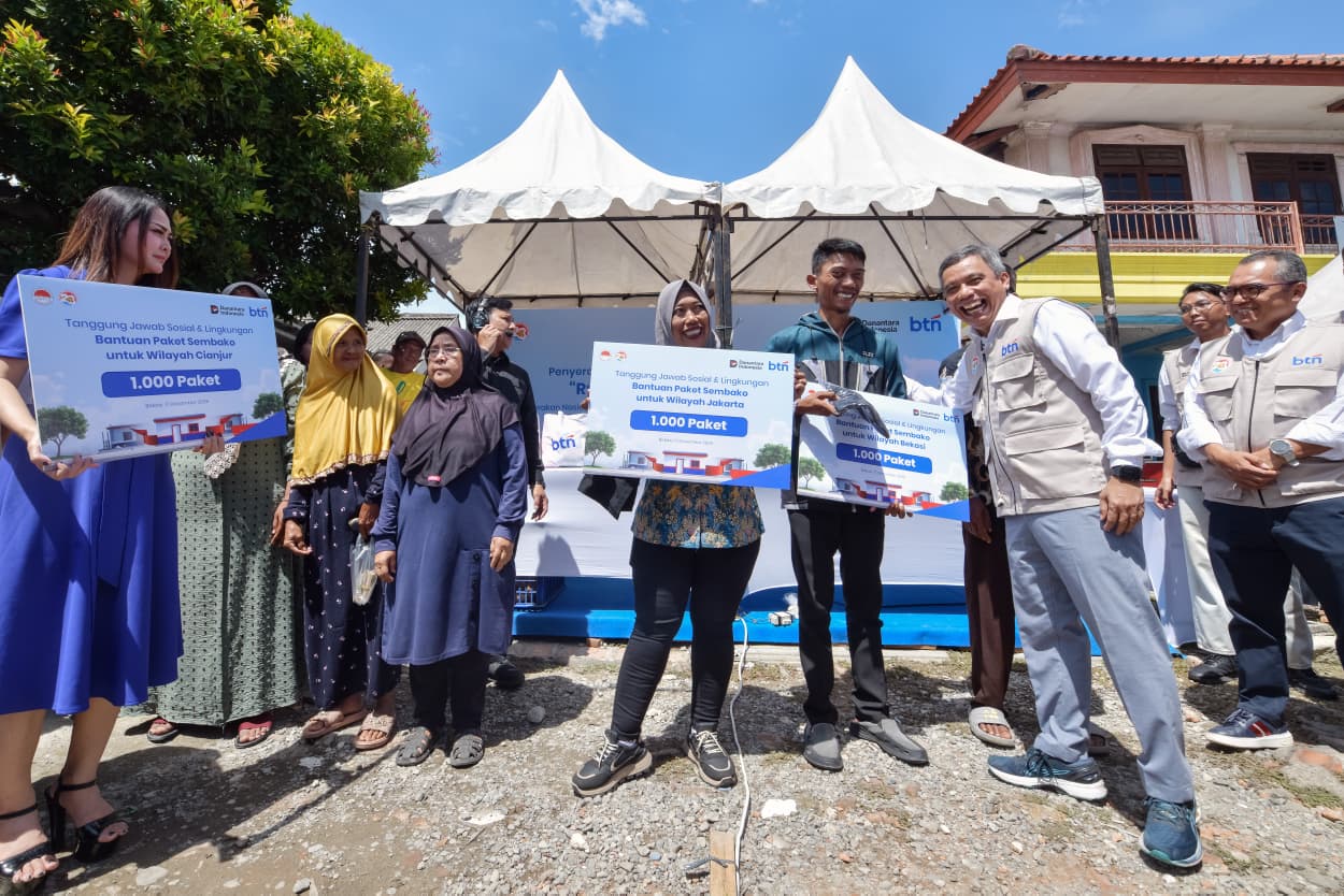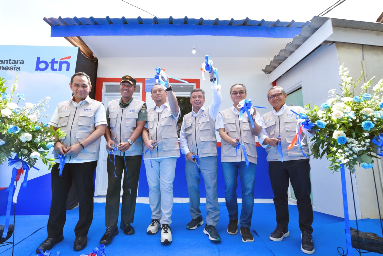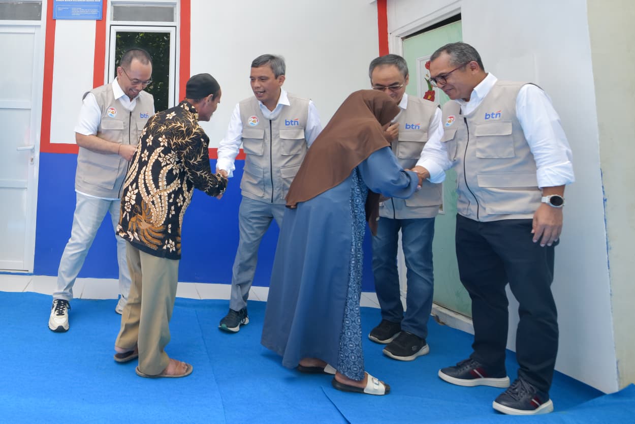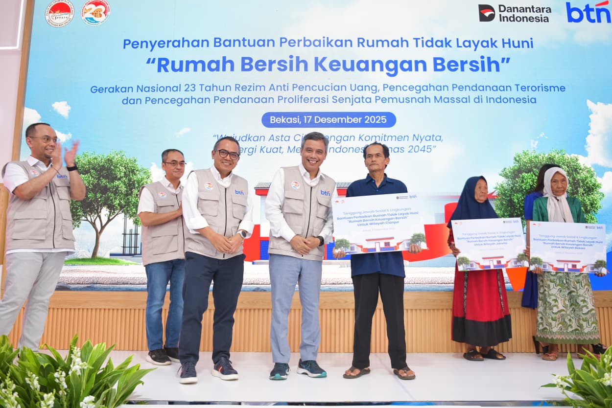 Direktur Utama BTN Nixon LP Napitupulu (tiga dari kanan) bersama Ketua PPATK Ivan Yustiavandana (tiga dari kanan) menyerahkan bantuan perbaikan Rumah Tidak Layak Huni kepada pasangan ibu Sarni dan bapak Endang (tengah) di Cikarang, Bekasi, Jawa Barat, Rabu (17/12). BTN berkolaborasi dengan PPATK melalui program Tanggung Jawab Sosial dan Lingkungan (TJSL) Bedah Rumah bertajuk “Rumah Bersih, Keuangan Bersih” untuk menghadirkan hunian yang aman, sehat, dan layak bagi masyarakat berpenghasilan rendah. Program ini juga menegaskan komitmen kedua institusi dalam membangun integritas, dimulai dari rumah. Sekaligus mendukung target nasional penyediaan rumah layak huni bagi masyarakat di bawah garis kemiskinan.